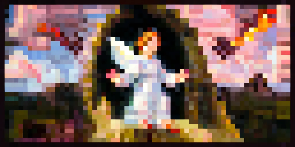 32x 32y, void, an angel praying into a black void, out of bounds, rock, pink swirling clouds in the background, flame particle coming from the void