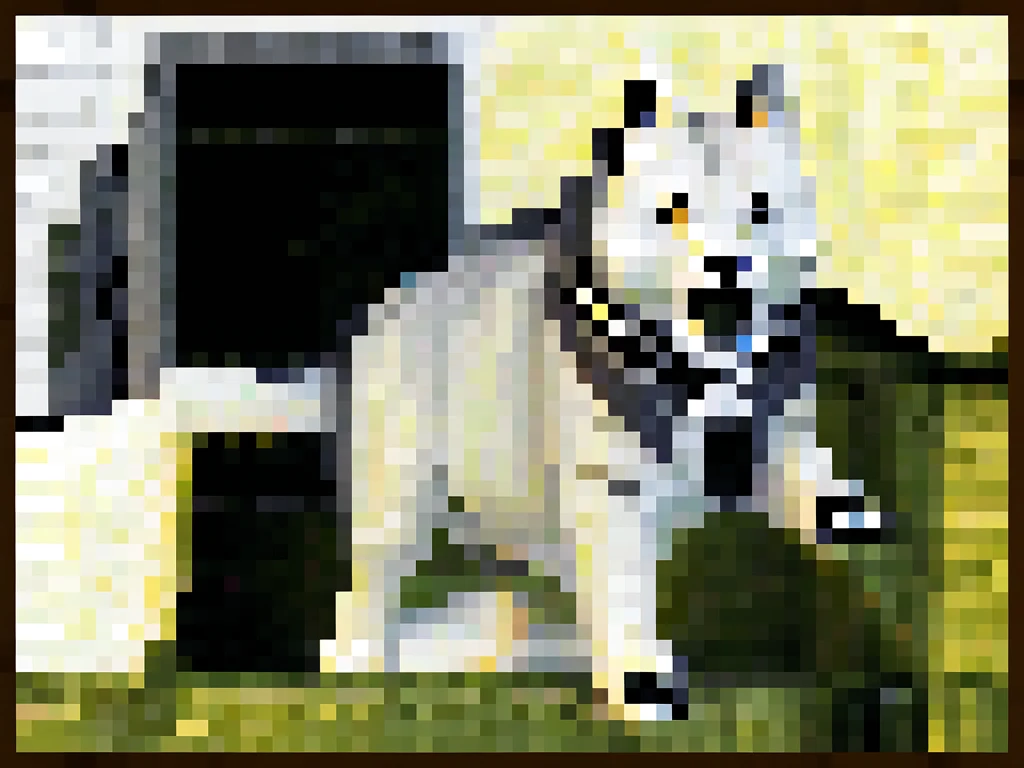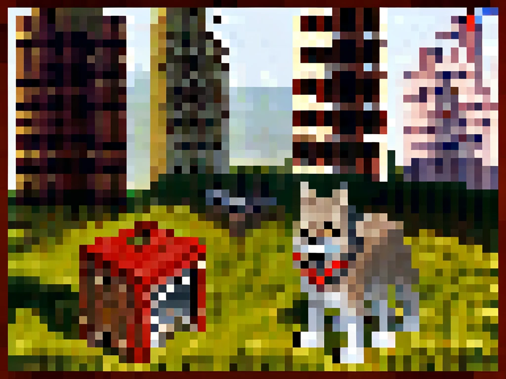 32x 32y, wolf, a tamed wolf sitting next to a crafting table, red collar, skyscraper in the background