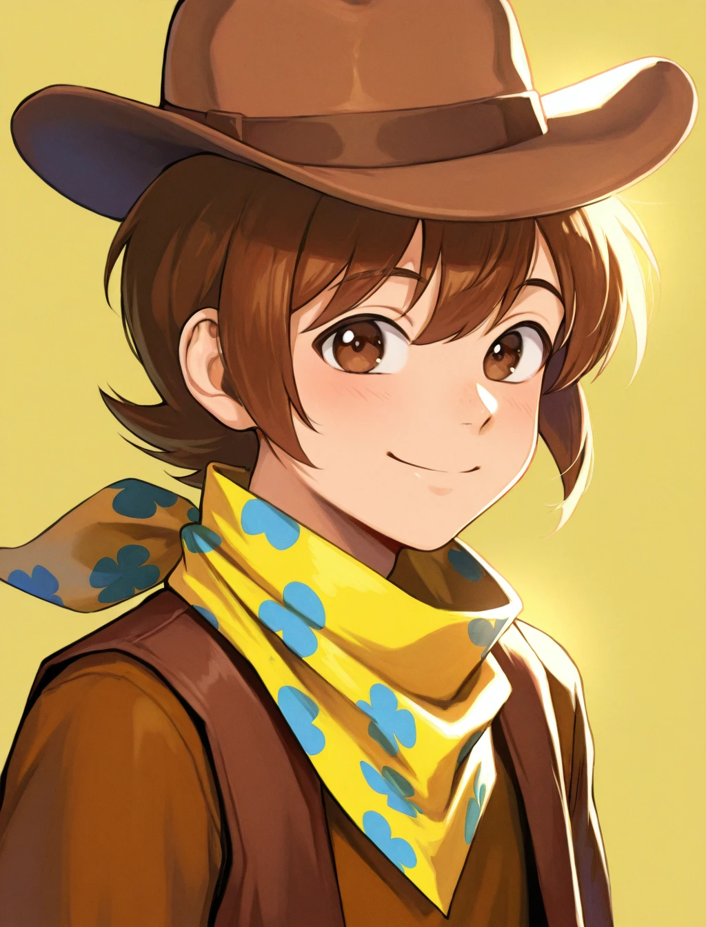 hat, brown shirt, bandana, brown vest, belt, blue pants