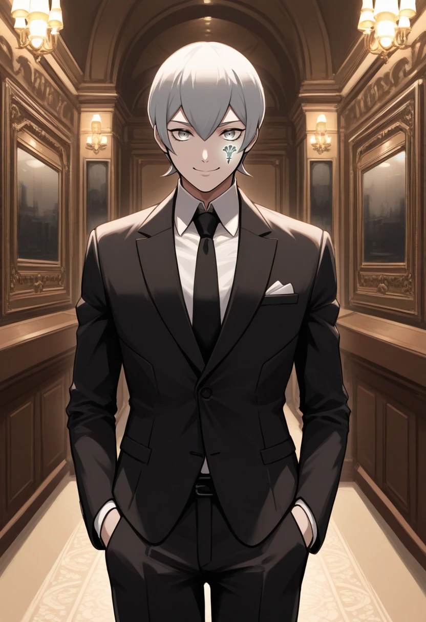 s3rphdds, grey hair, short hair, hair between eyes, grey eyes, facial mark, grey bodysuit
