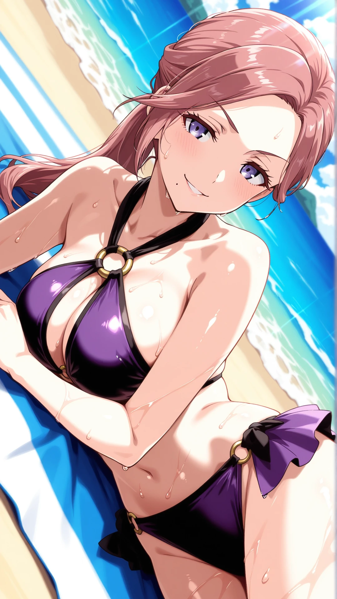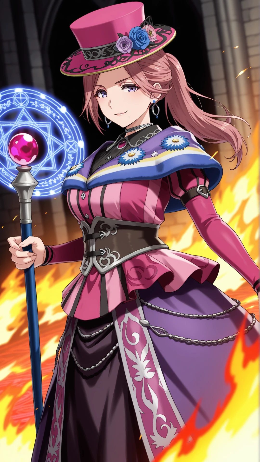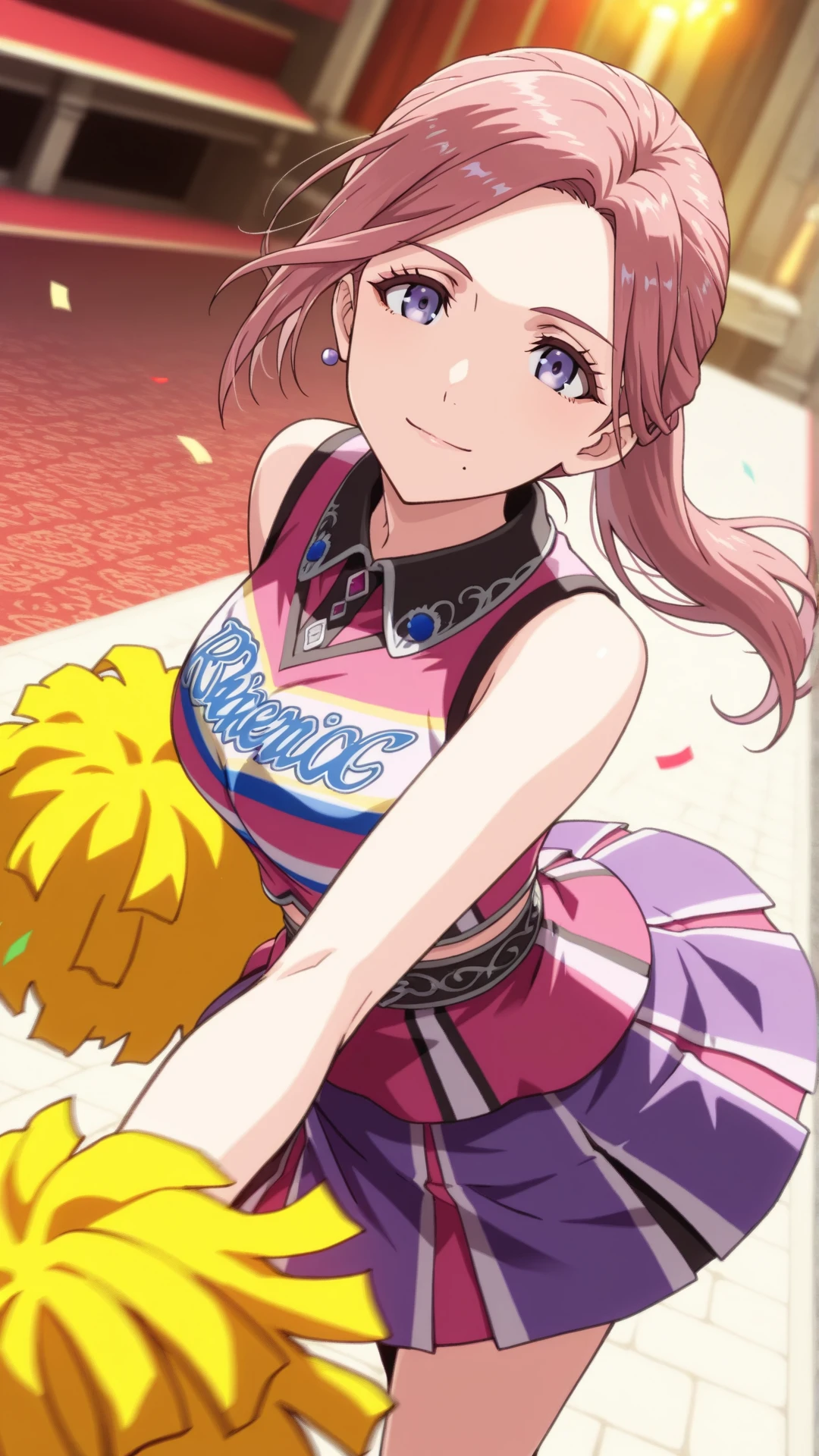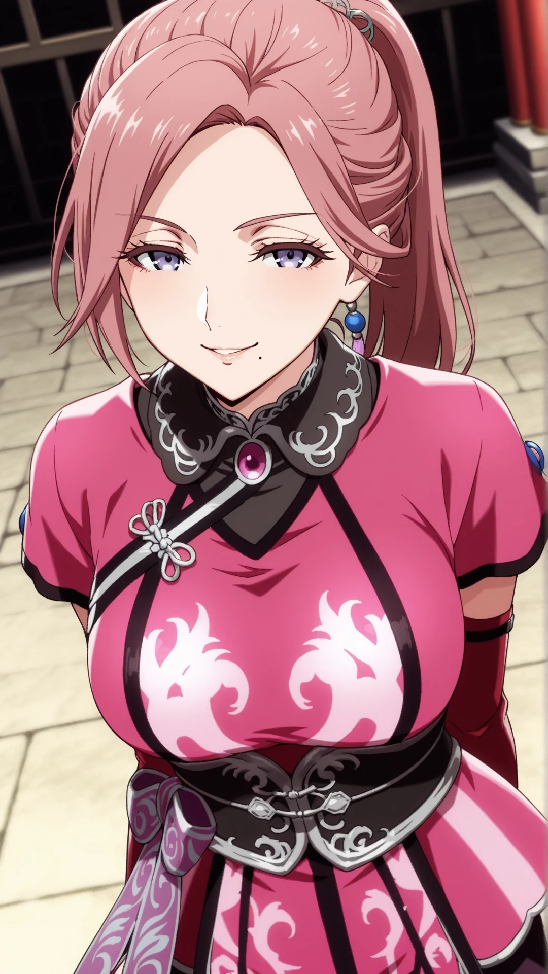 roze\(revenge saga\),long hair, pink hair, ponytail, purple eyes, mole under mouth,