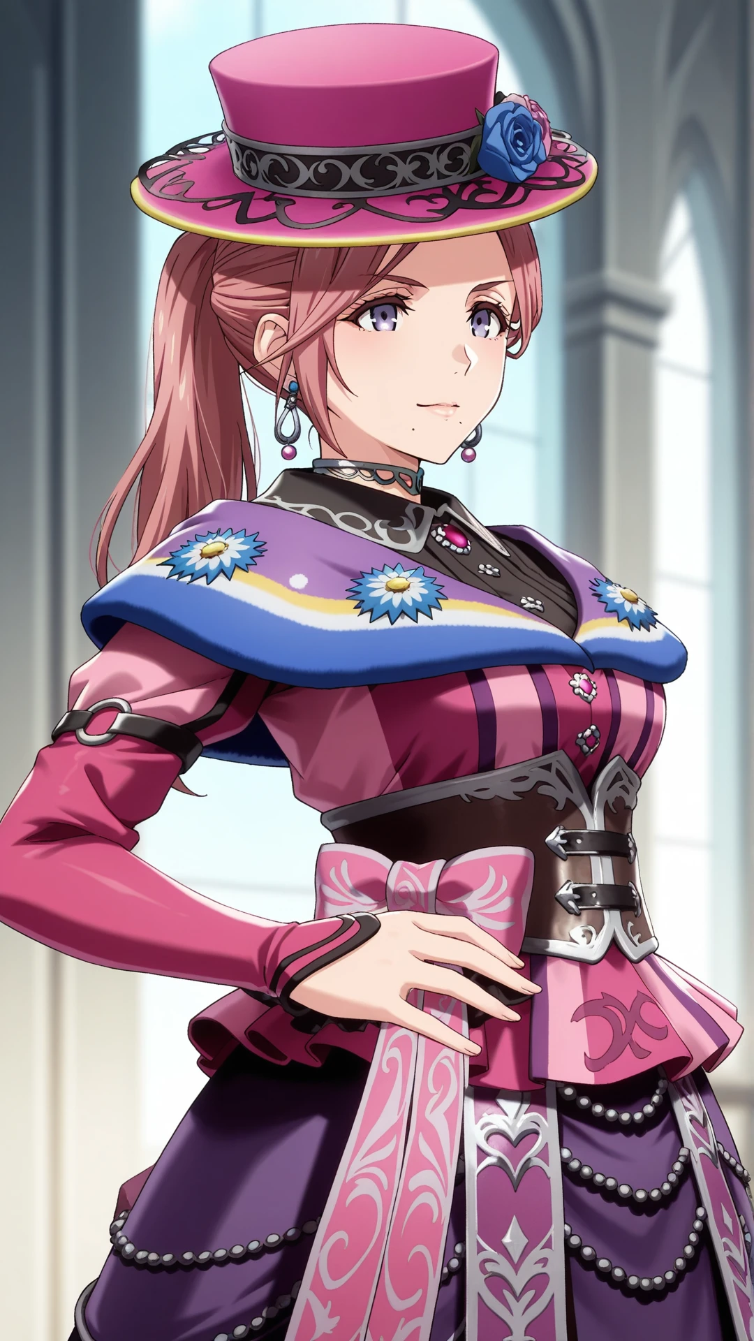 pink top hat, earrings, hat flower, purple dress, corset, capelet, skirt,