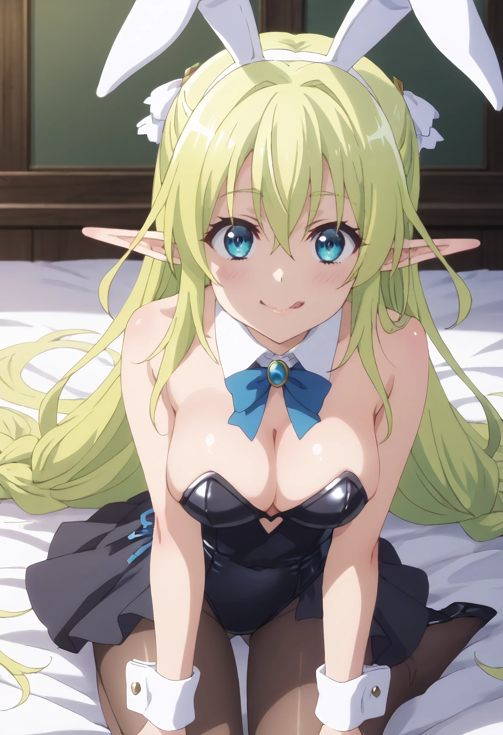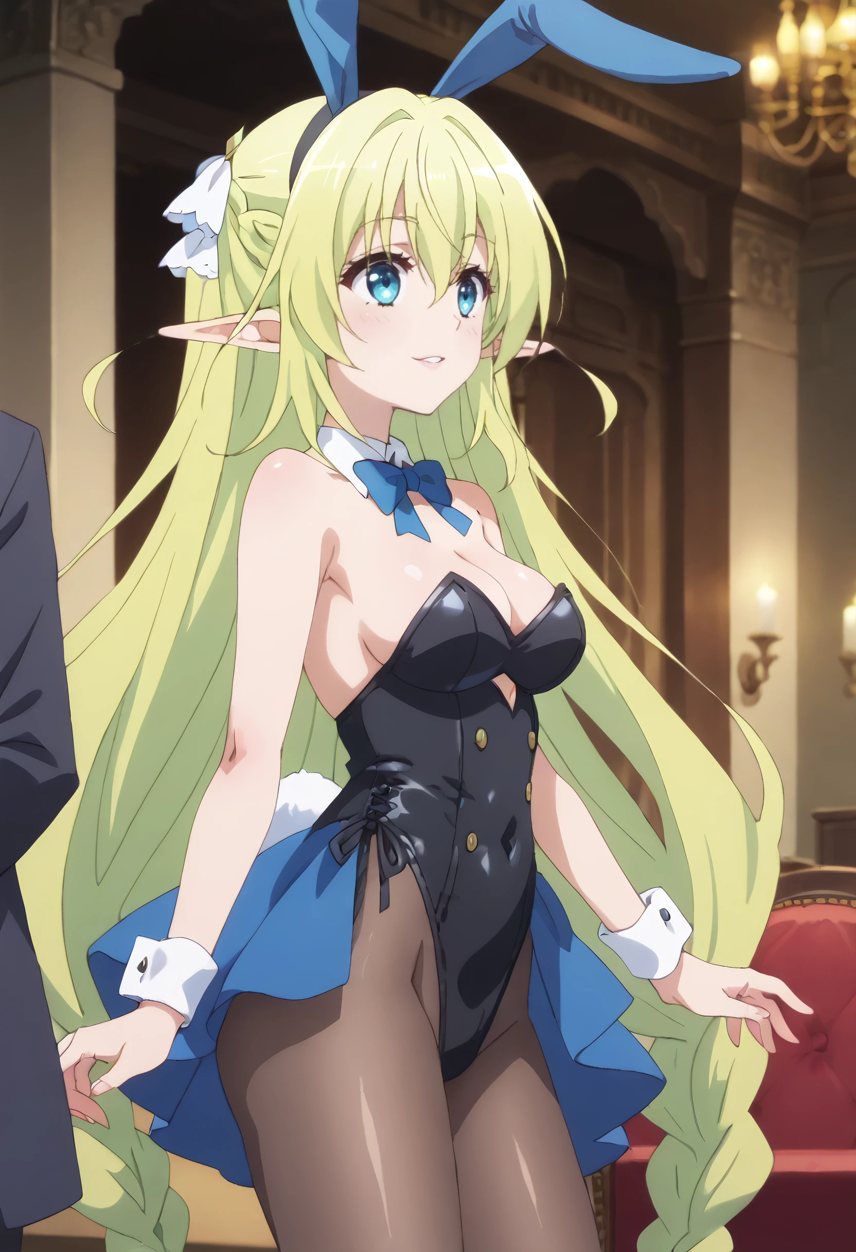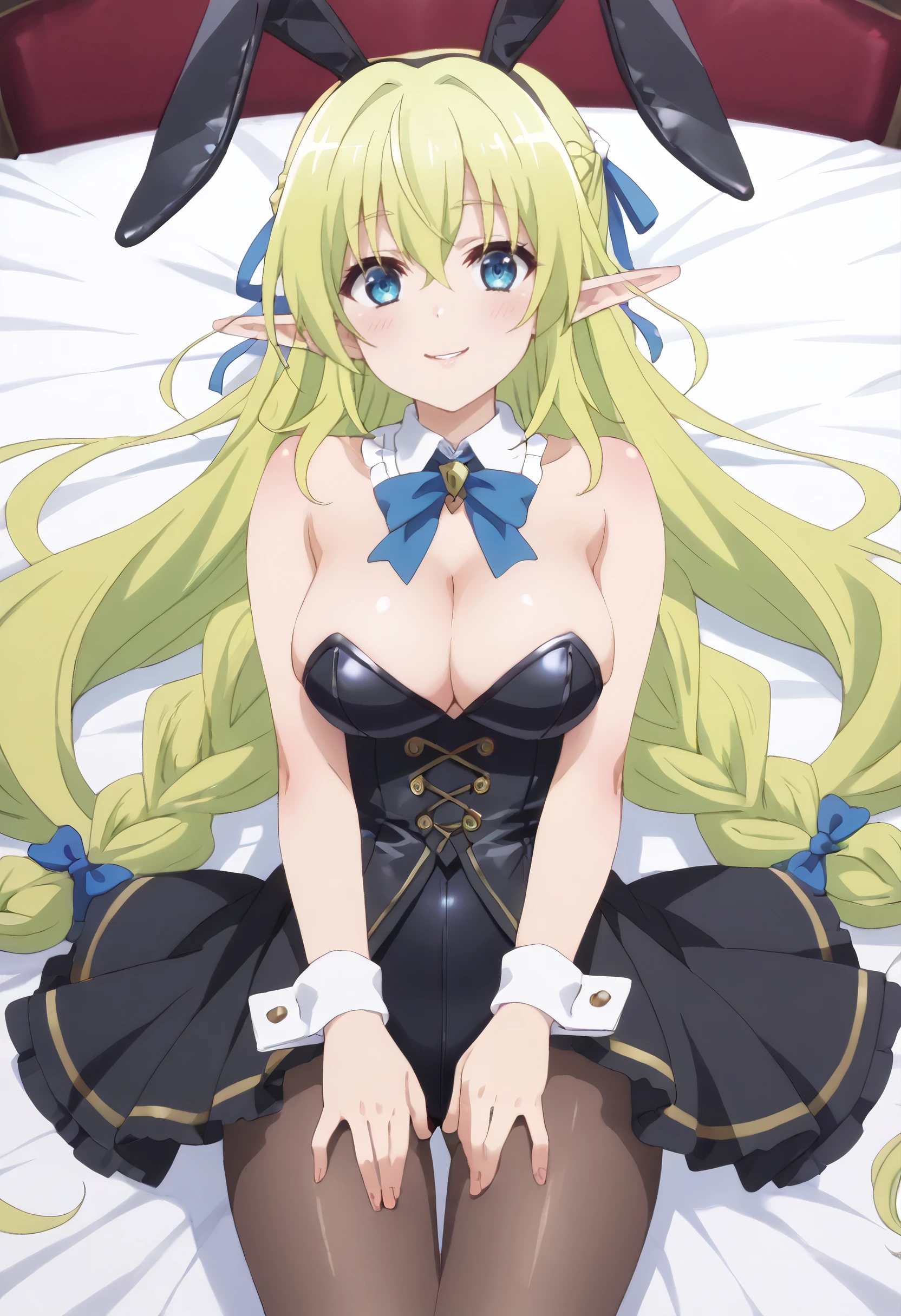 LyruleBunnysuit, animal ears, bare shoulders, bow, bowtie, cleavage, detached collar, wrist cuffs, leotard, pantyhose, playboy bunny, rabbit ears, ribbon, black leotard, fake animal ears, black skirt, blue ribbon, skirt, sleeveless, brown legwear,