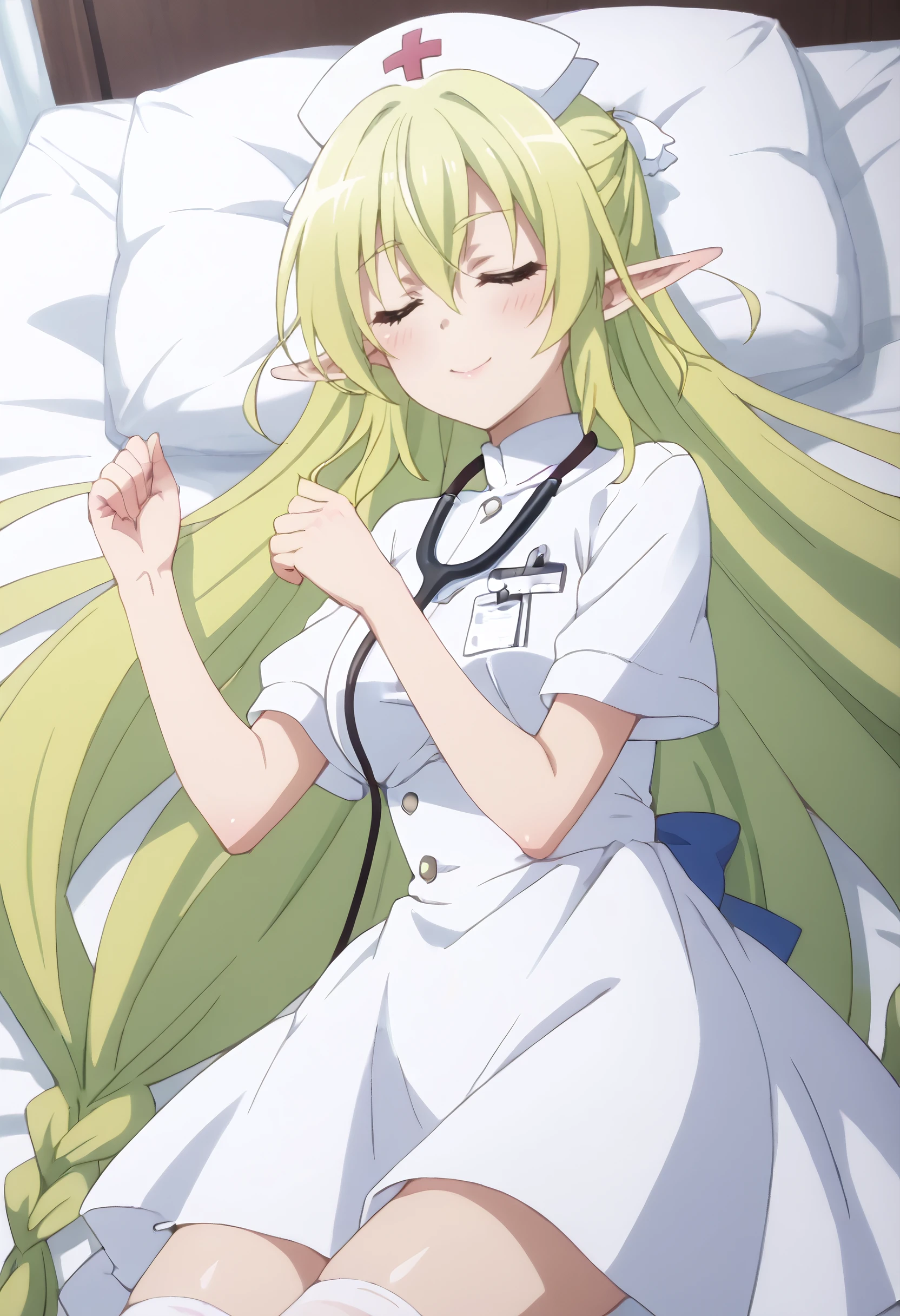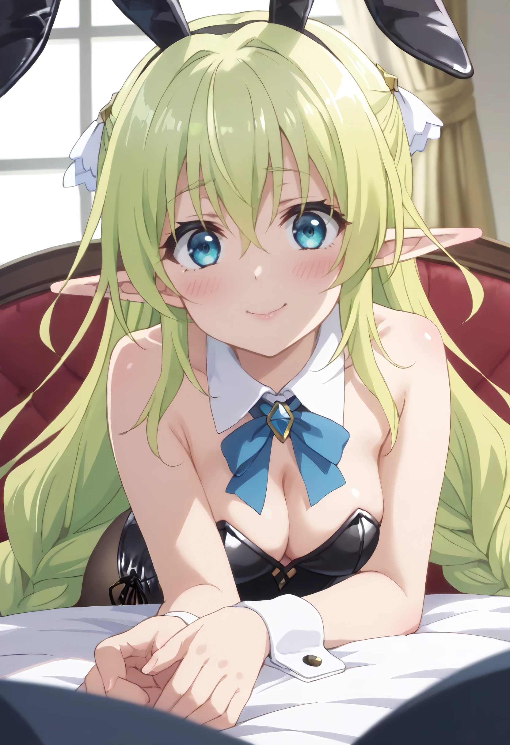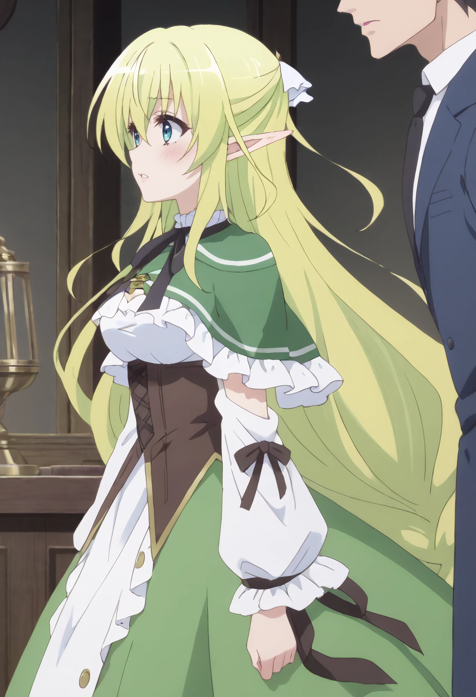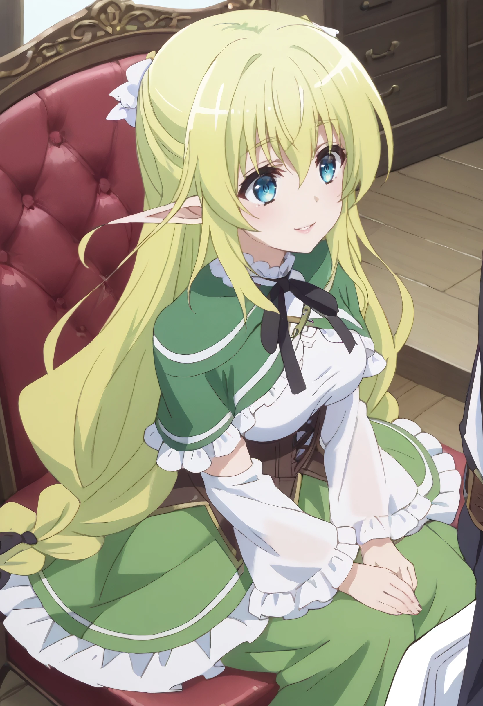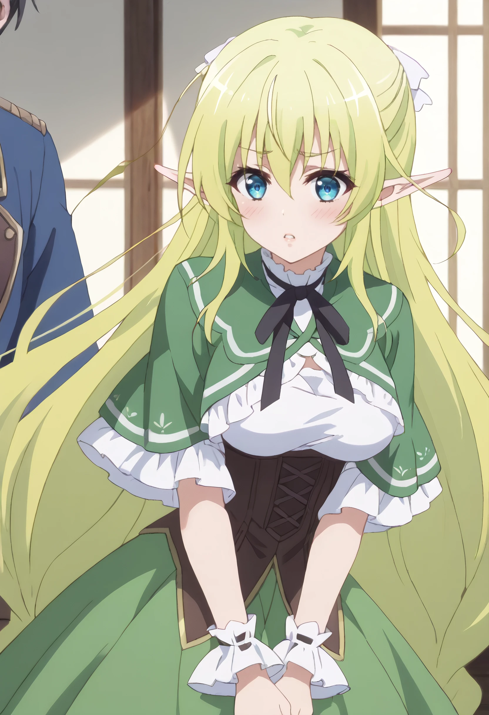 CKWLyrule, elf, green hair, pointy ears, braid, twin braids, hair between eyes, blue eyes, eyebrows visible through hair, bangs, very long hair, absurdly long hair, long pointy ears,