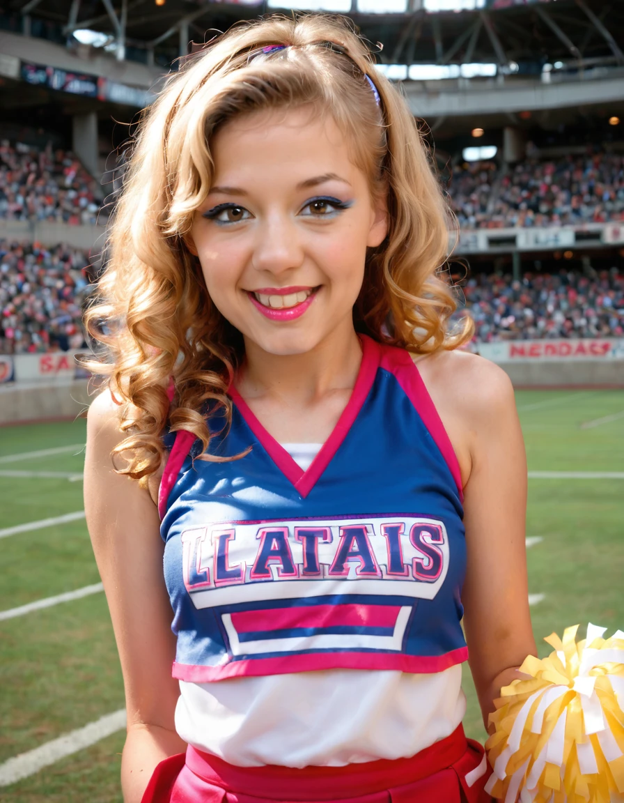 "prompt": "score_9, score_8_up, score_7_up, photo realistic, true to life, 4k, RAW, 1girl, nicoleray, small breasts, solo, cheerleader, skin texture, blush, eyeshadow, lipstick, brown eyes, long curly blonde hair, looking at viewer, covered up, under shirt, smile, photoshoot, glamour shot, covered up. in a stadium, bleachers. pom poms",