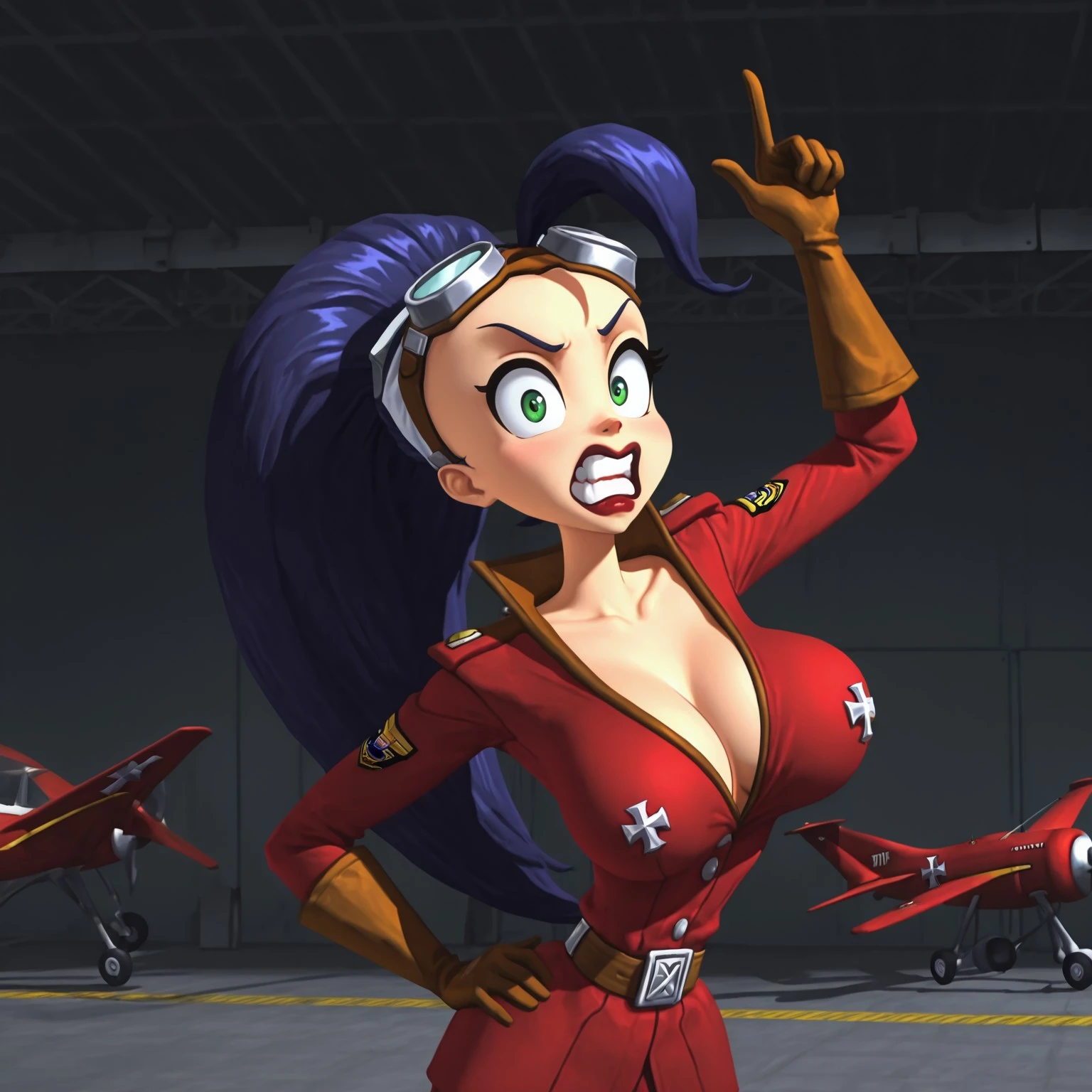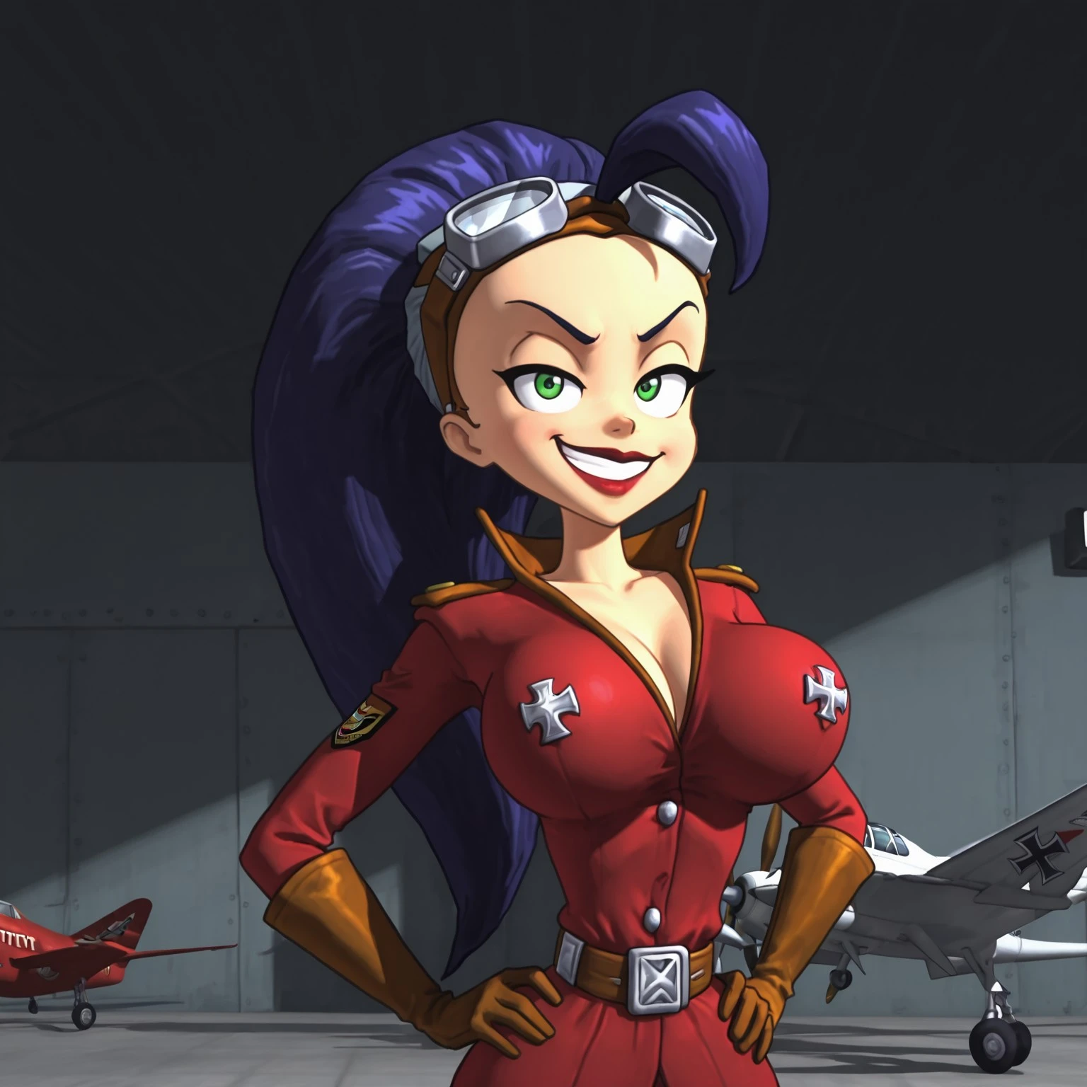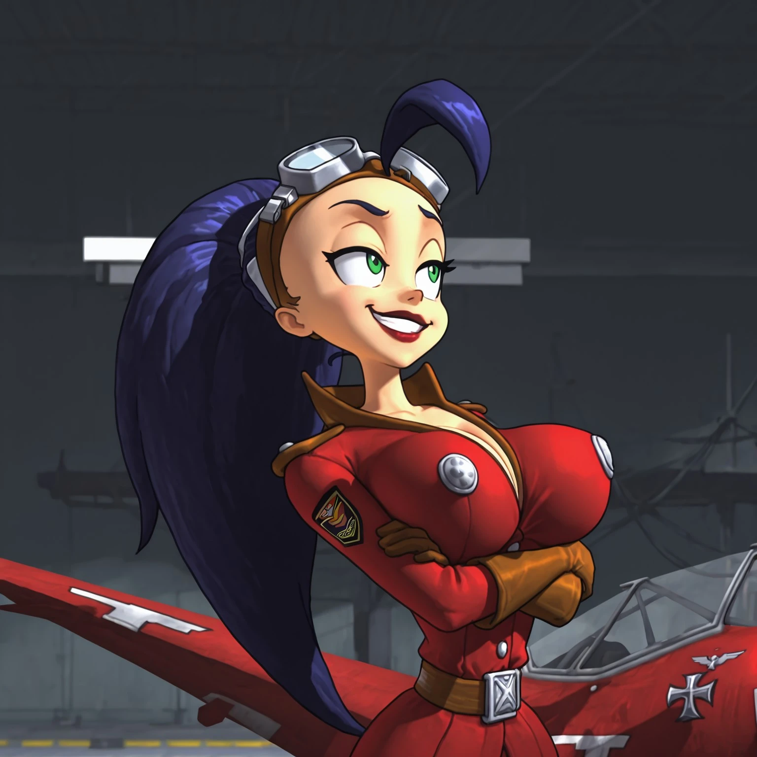 tracitorpedoesff, busty cartoon female with long blue hair, green eyes, dark red lipstick, large breasts, female with thin waist, female wearing brown pilot helmet with silver goggles on head, short red and brown uniform with silver buttons, cleavage, silver iron crosses both breasts, brown belt, brown gloves, brown highheel knee boots