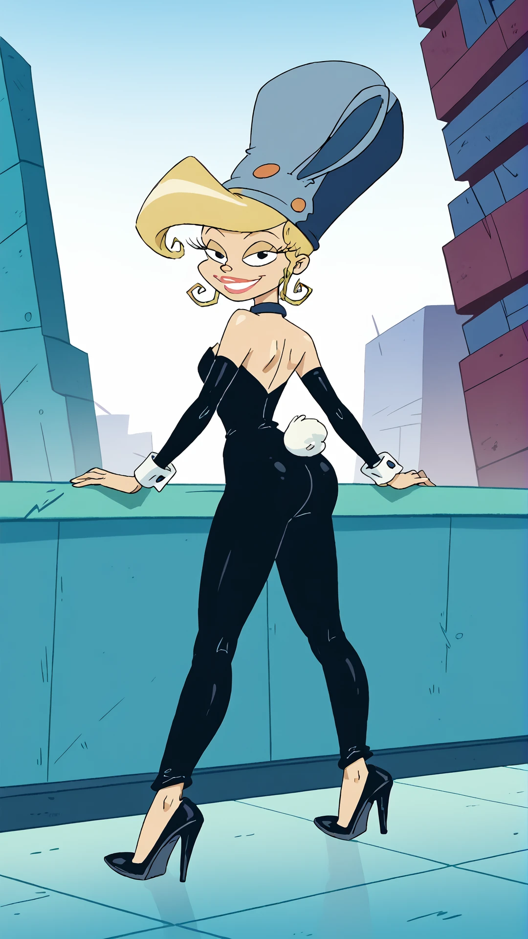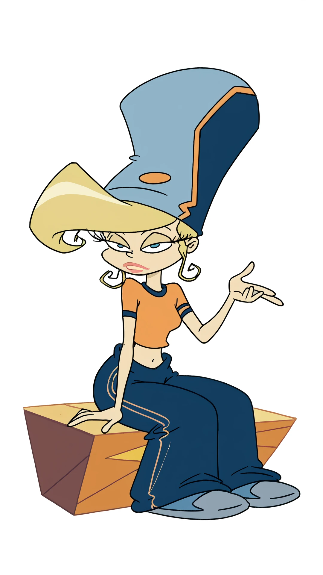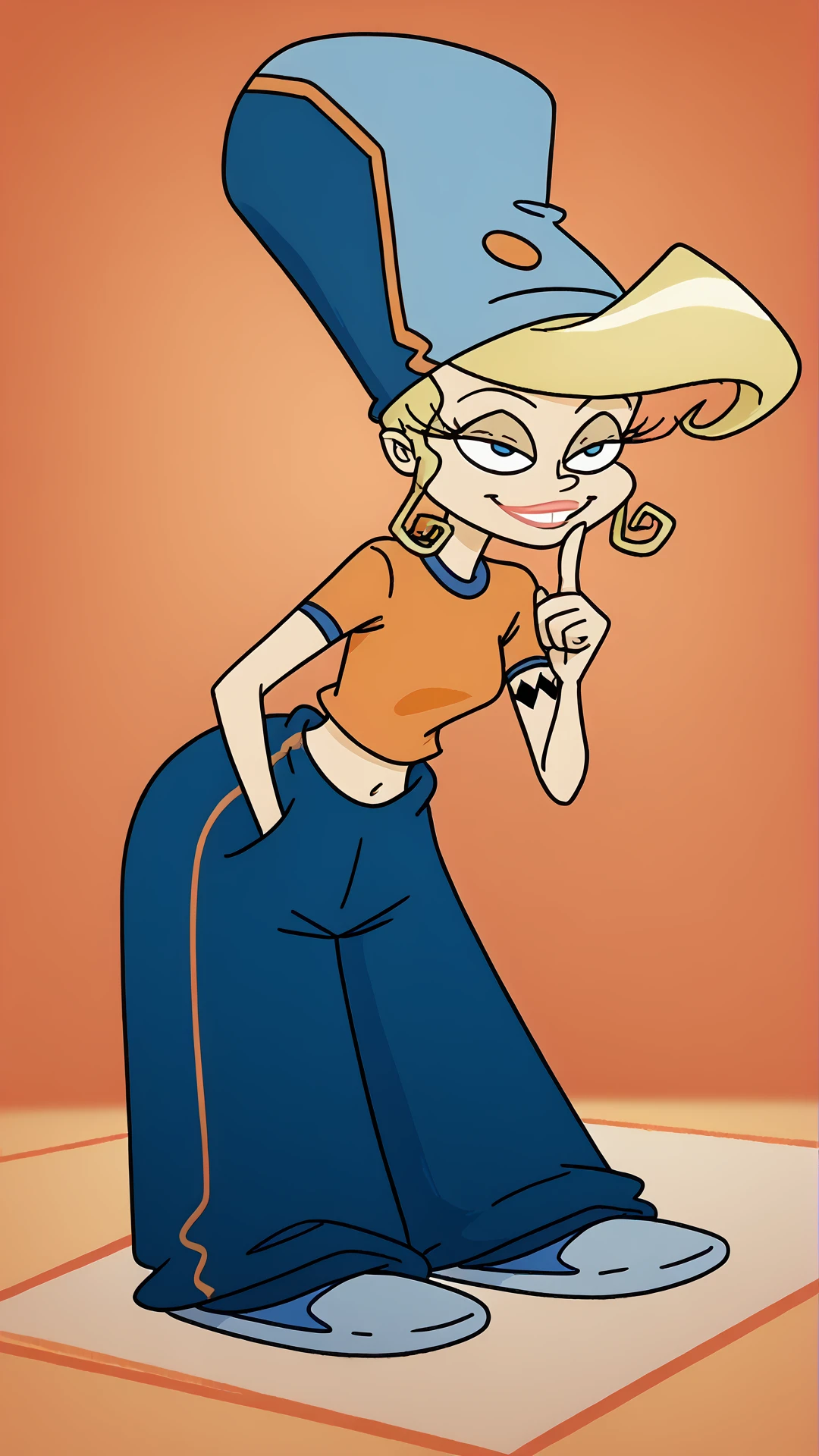 Ariel-X-DuckX, baggy pants, orange shirt, midriff, blonde hair, blue headwear, solo,