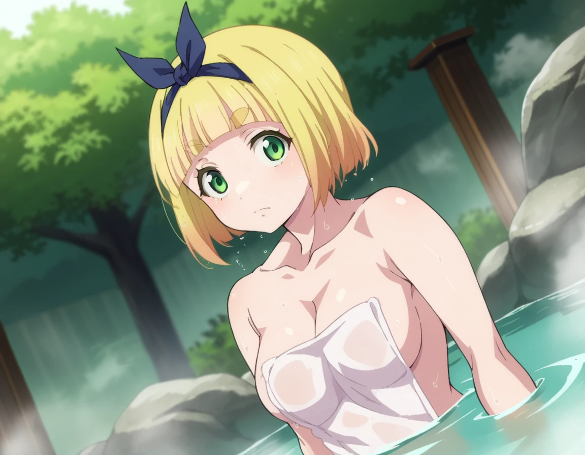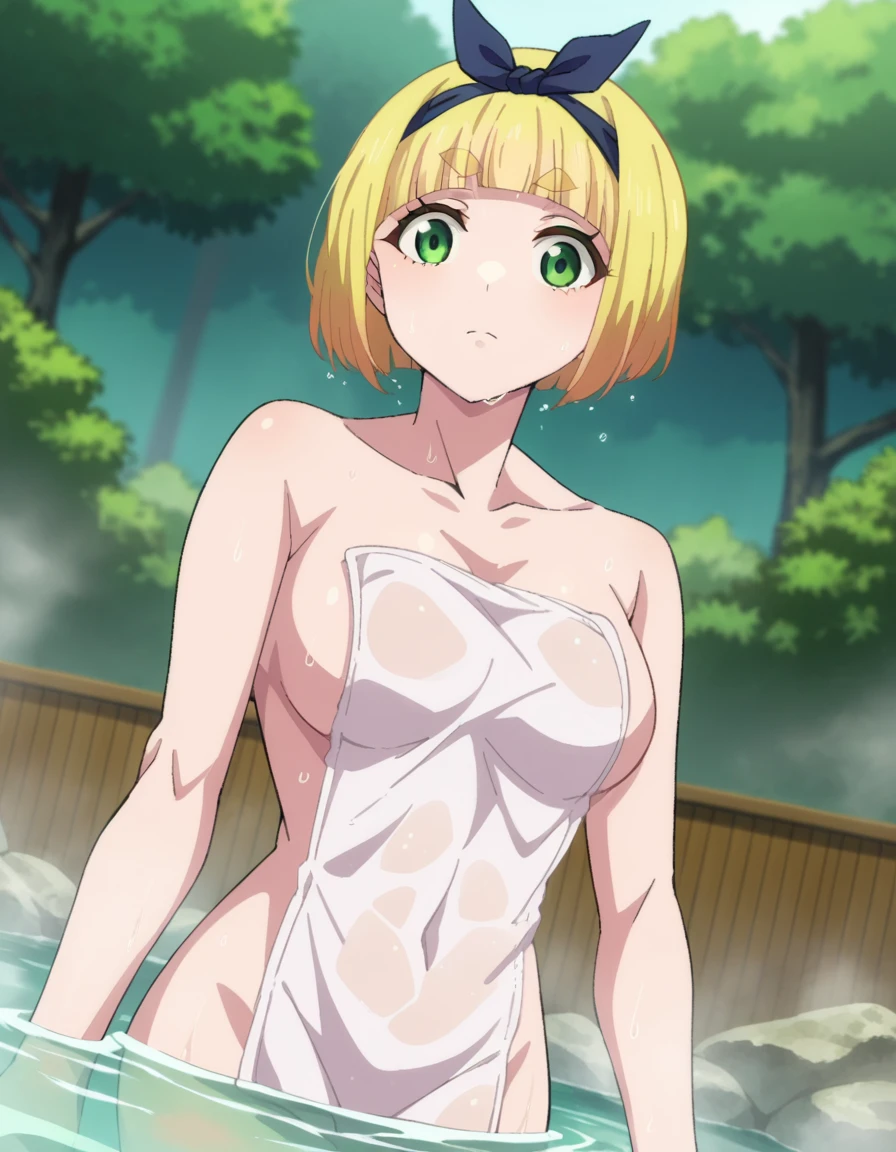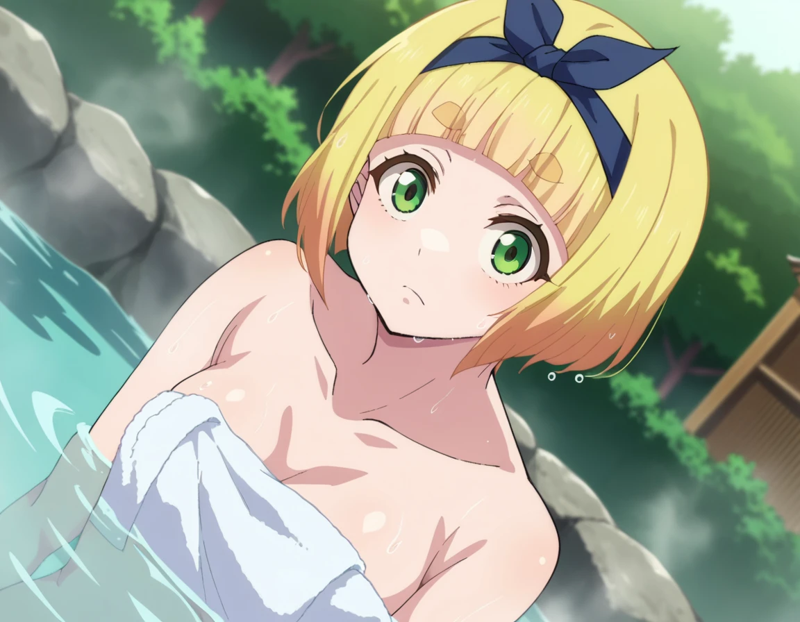shushu suruga, short hair, bangs, hair ribbon, hairband, blunt bangs, thick eyebrows, green eyes, yellow hair,