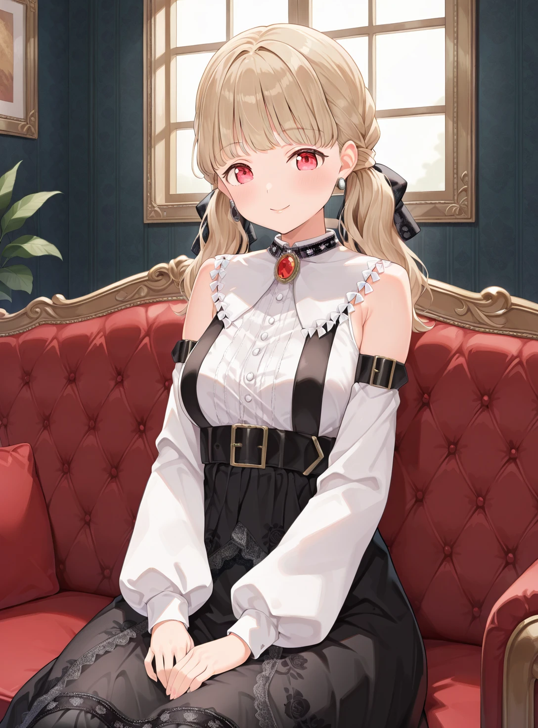 TotoGothic, 1girl, solo, low twintails,medium hair, white shirt, black high-waist suspender skirt, detached sleeves,Black inner skirt