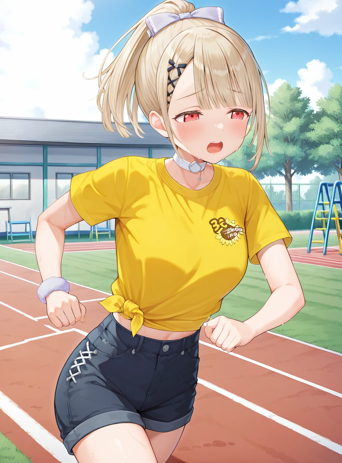 TotoBunkasai, 1girl, solo, ponytail, hair bow, choker, yellow t-shirt, short denim shorts, shoulder bag, phone,
