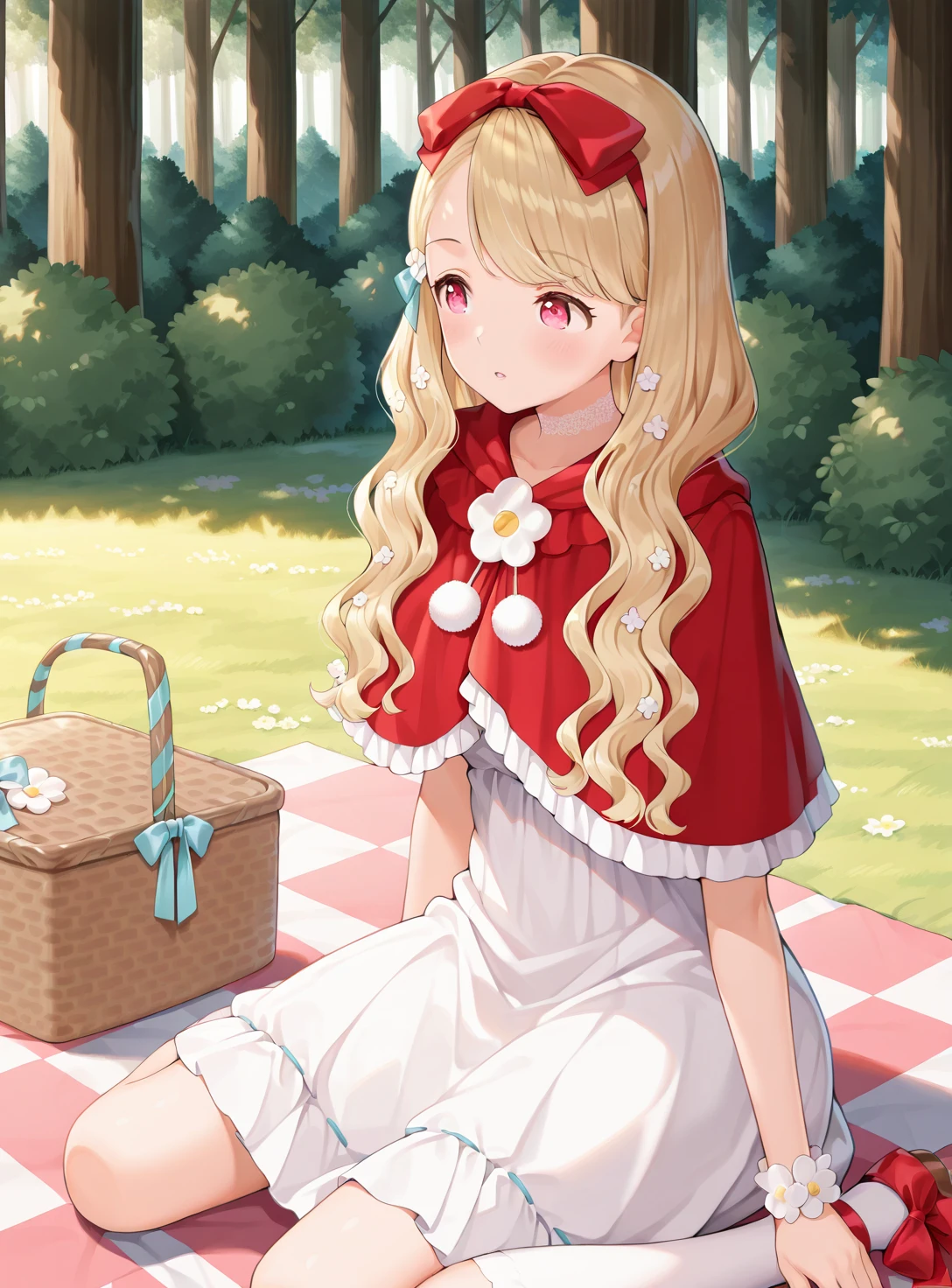TotoRedHood, 1girl, solo, wavy long hair, blonde hair, red hair bow, swept bangs, white dress, red capelet,