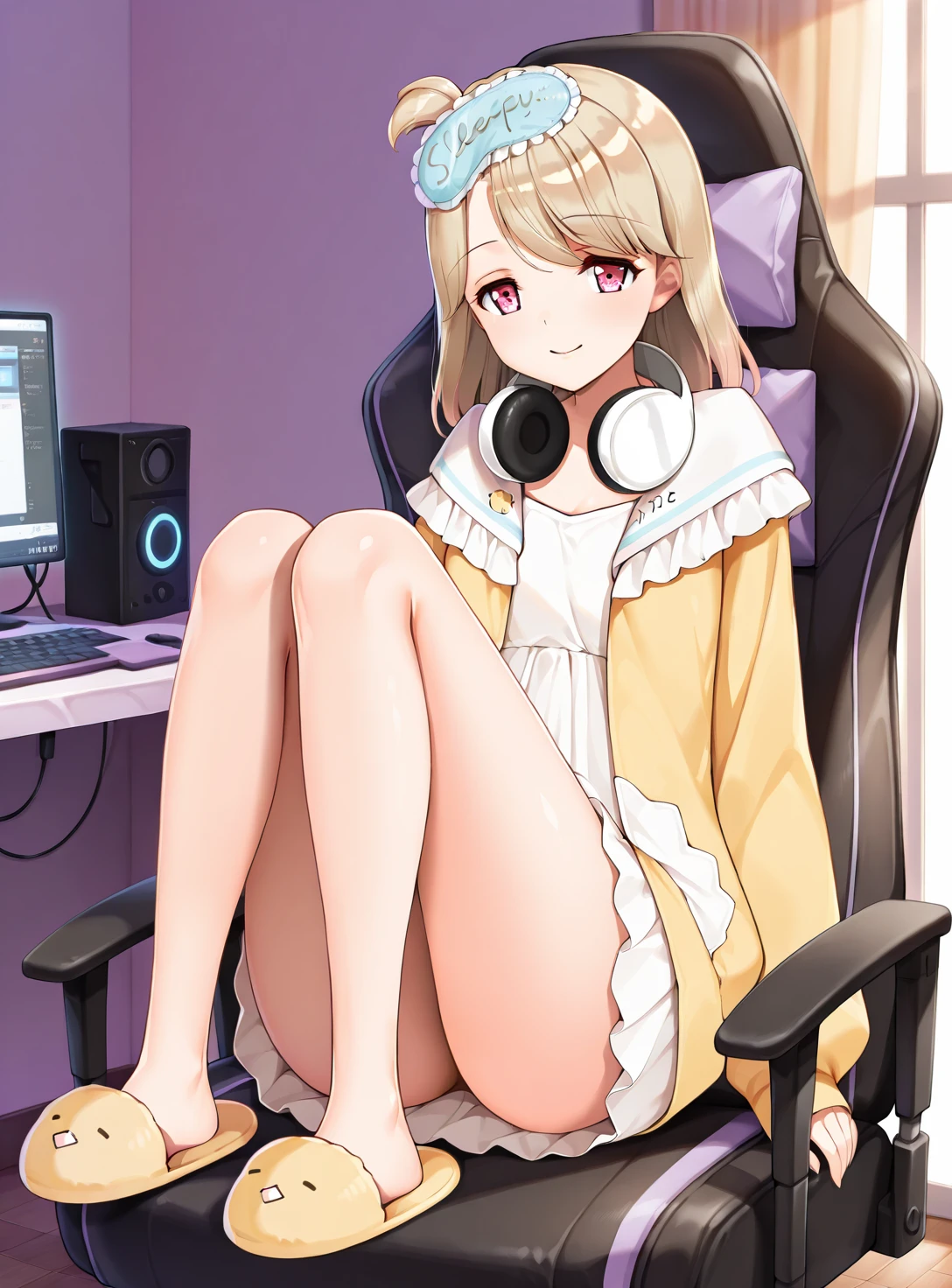 TotoPajama, 1girl, solo, medium hair, white dress, yellow open pajamas, sleep mask, headphones around neck,