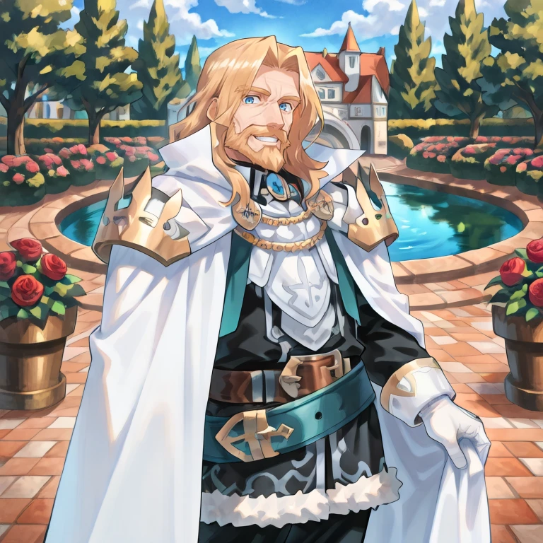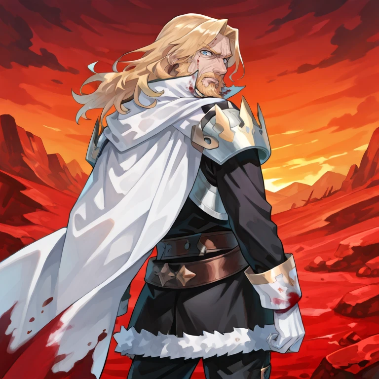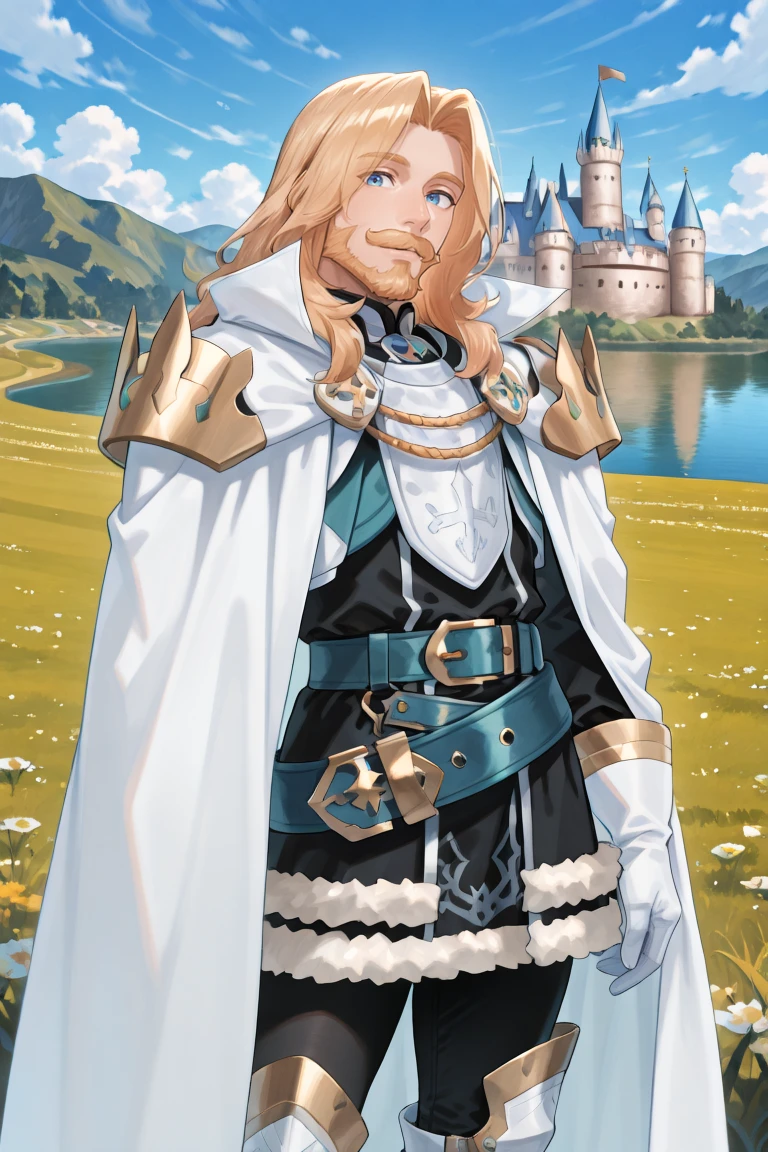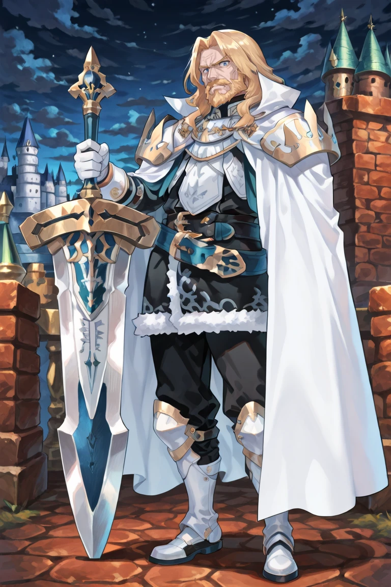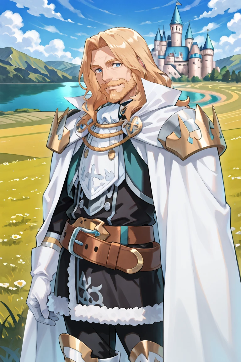 ordedef, 1boy, wrinkles, old man, blue eyes, blonde hair, long hair, facial hair, mustache, beard, white cape, collared cape, armor, pauldrons, black pants, white gloves, fur-trimmed skirt, black skirt, belt, white boots