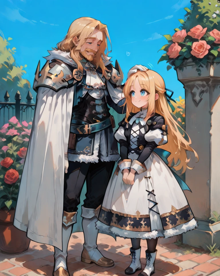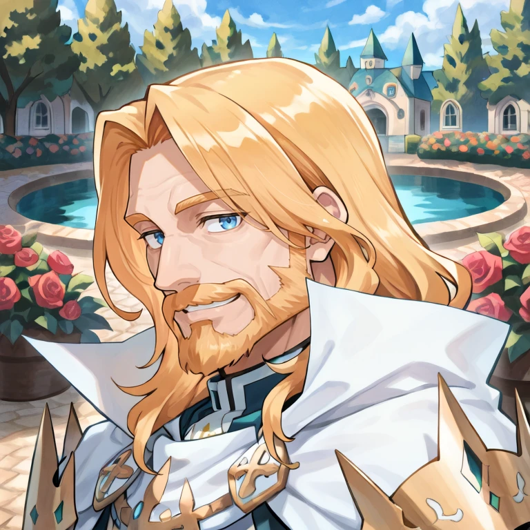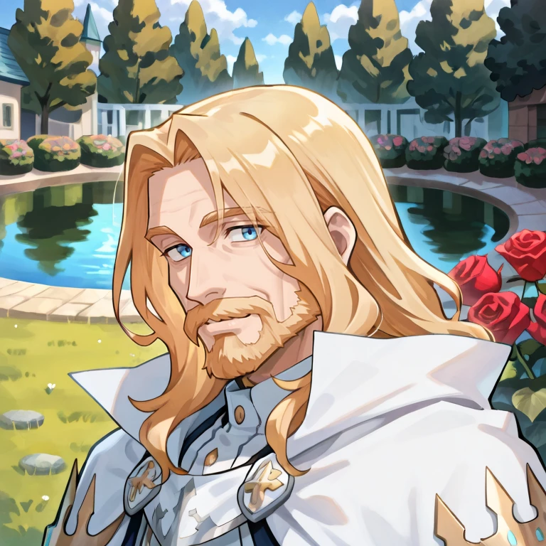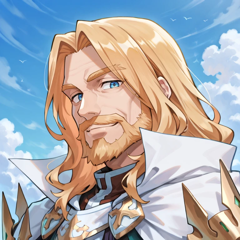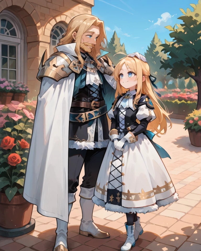 ordedef, 1boy, wrinkles, old man, blue eyes, blonde hair, long hair, facial hair, mustache, beard, white cape, collared cape, armor, pauldrons, black pants, white gloves, fur-trimmed skirt, black skirt, belt, white boots