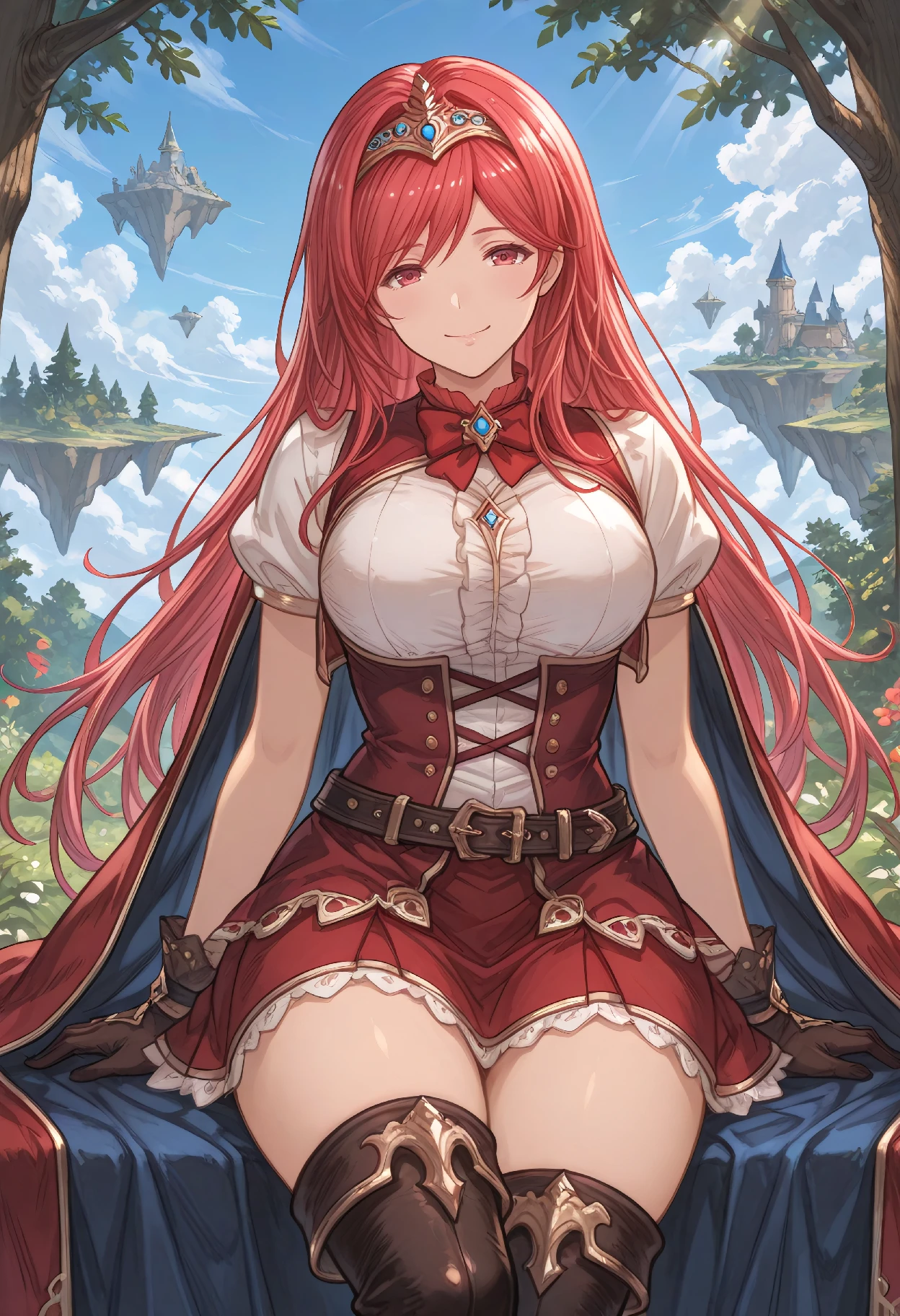 ArrietBase (Granblue Fantasy), red hair, red eyes, tiara, white shirt, puffy short sleeves, vest, underbust, clothing cutout, red skirt, frills, belt, cape, brown gloves, black gloves, black thighhighs, black thigh boots,