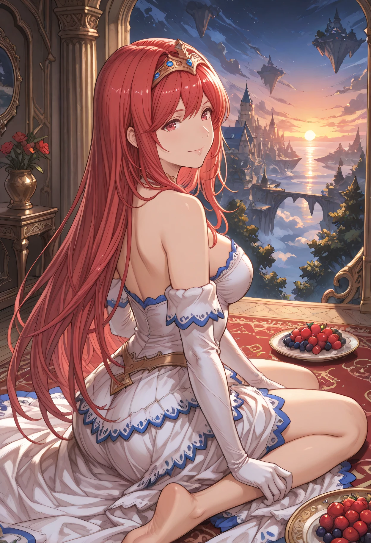 ArrietDress (Granblue Fantasy), red hair, long hair, red eyes, tiara, white elbow gloves, strapless dress, shoulders, white knee boots, high heels,