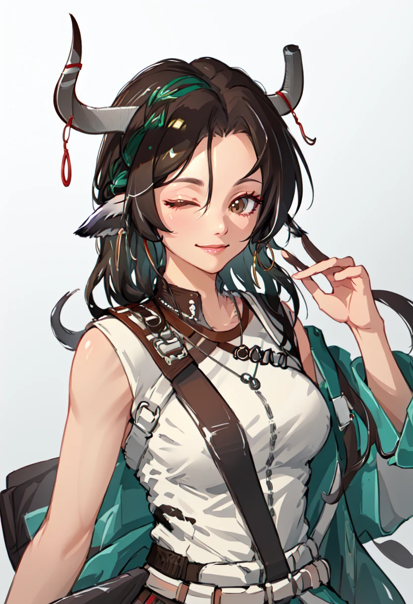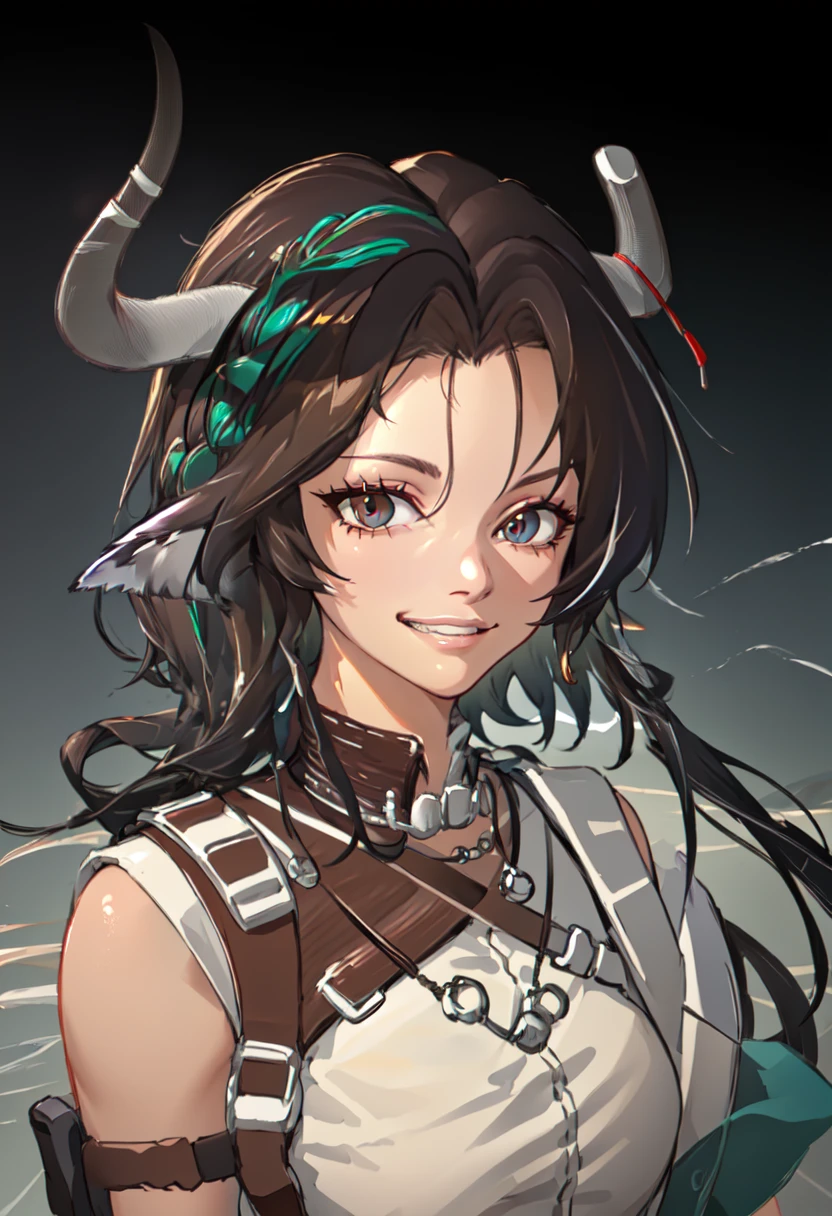 The trigger word is wind_chimes_arknights, and the pruned tags are breasts, horns, cow_ears, cow_horns, animal_ears, cow_girl, long_hair, black_hair, brown_hair, large_breasts, braid, brown_eyes, hair_between_eyes.