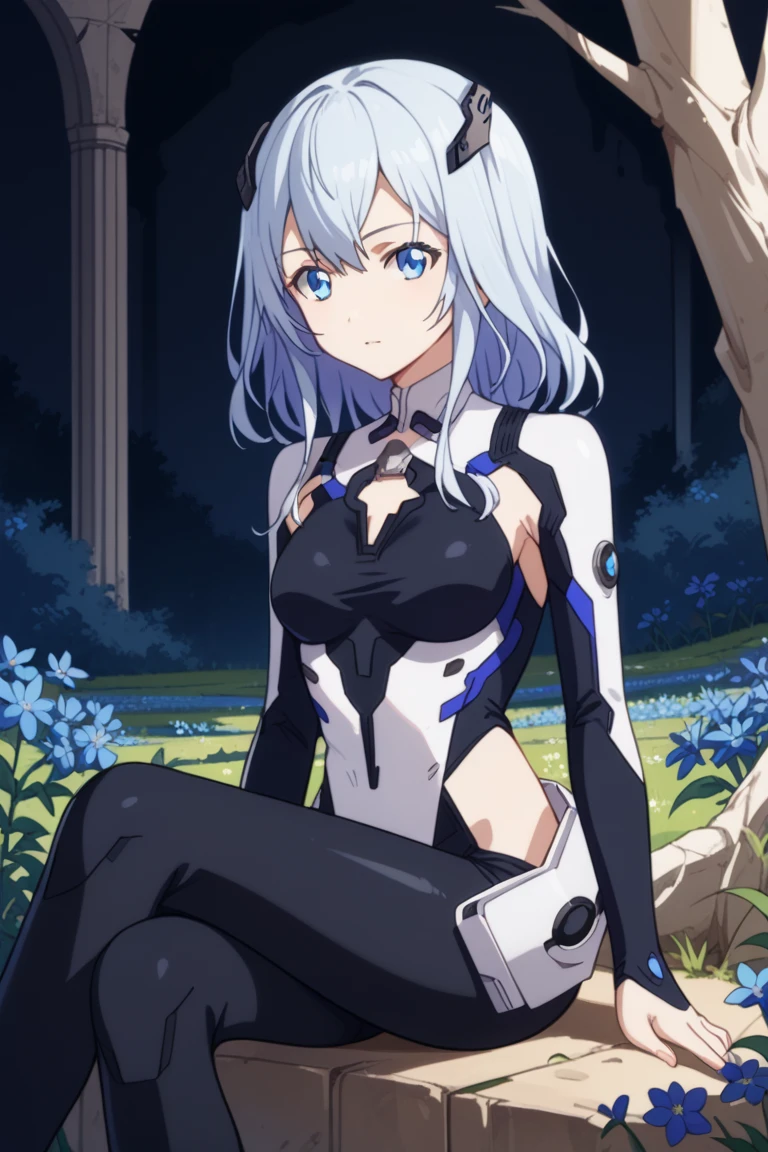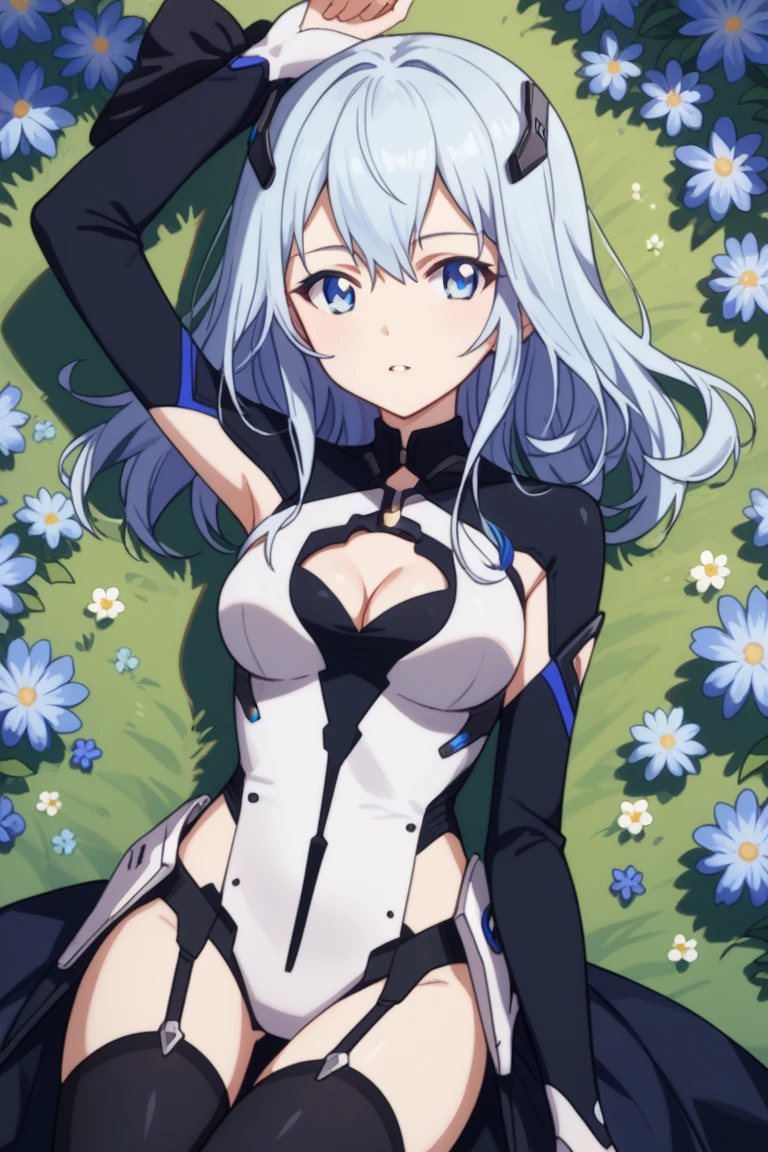 Leixiya, leixiya1st, blue eyes,light blue hair, medium hair, hair ornament, black turtleneck, white bodysuit, black trim, cleavage cutout, clothing cutout, gloved sleeves, black sleeves, long sleeves, thighhighs, black thighhighsOutfit 2:
