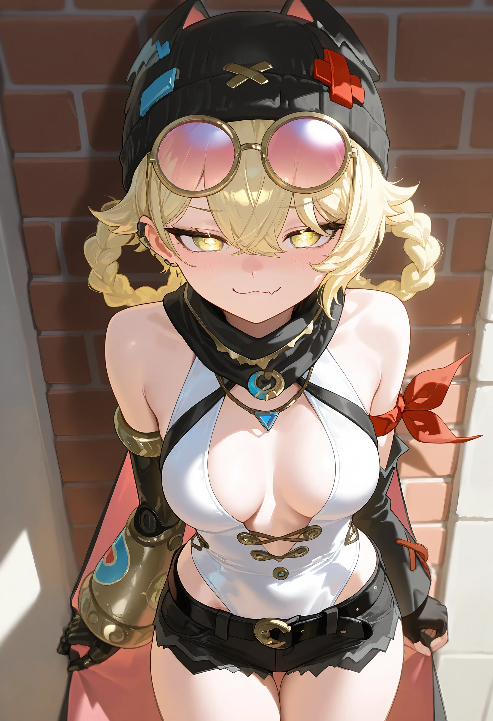 Tags for her outfit: long sleeves, bare shoulders, detached sleeves, black gloves, fingerless gloves, cape, black headwear, black shorts, thigh gap, eyewear on head, black belt, round eyewear, white leotard, black sleeves, center opening, tinted eyewear, animal hat, torn thighhigh, short shorts, single loose sock, red bandana around arm, single mechanical arm,