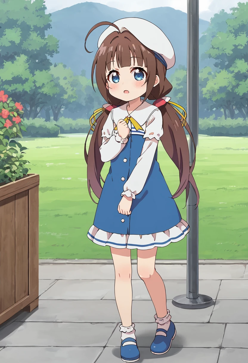 hinatsuru ai,blue eyes,brown hair,ahoge,low twintails,long hair,white beret,ress,long sleeves,bobby socks,blue footwear
