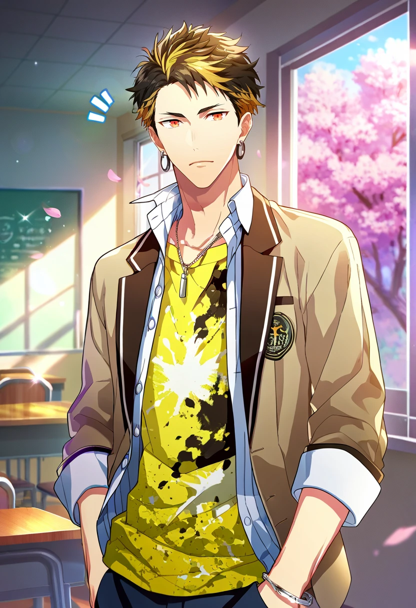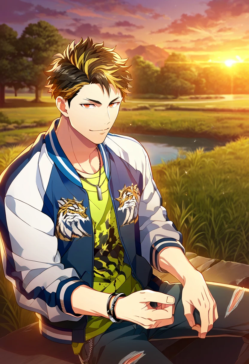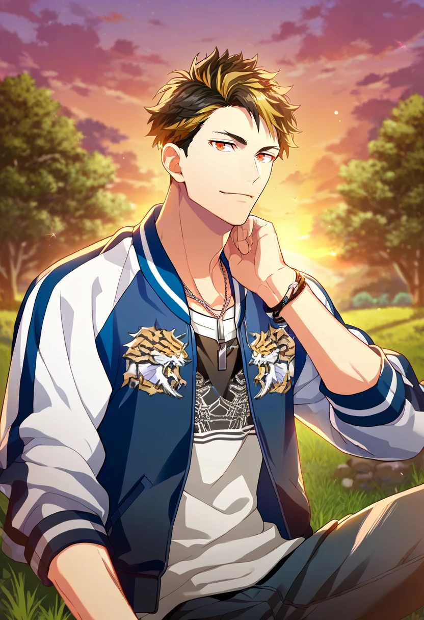 Activation tags: reitotsuji, black hair, multicolored hair, red eyes, bracelet, necklace, ear piercing,