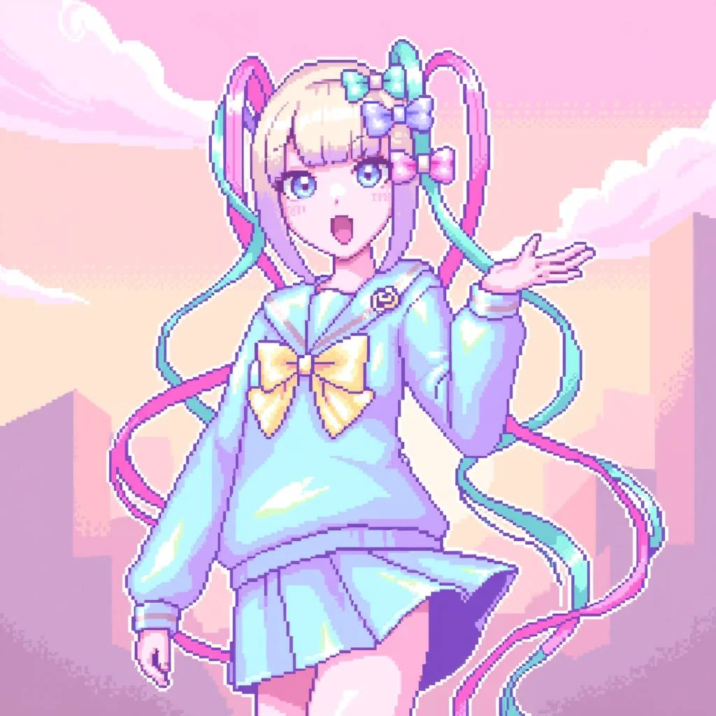 pixelart picture of kangel wearing a blue kangel uniform, blue skirt, yellow ribbon. She has blonde hair with colorful extensions, three hair ribbons (light blue, purple and pink). night background, moon visible, outside, full body, wearing blue shoes, sitting on ground