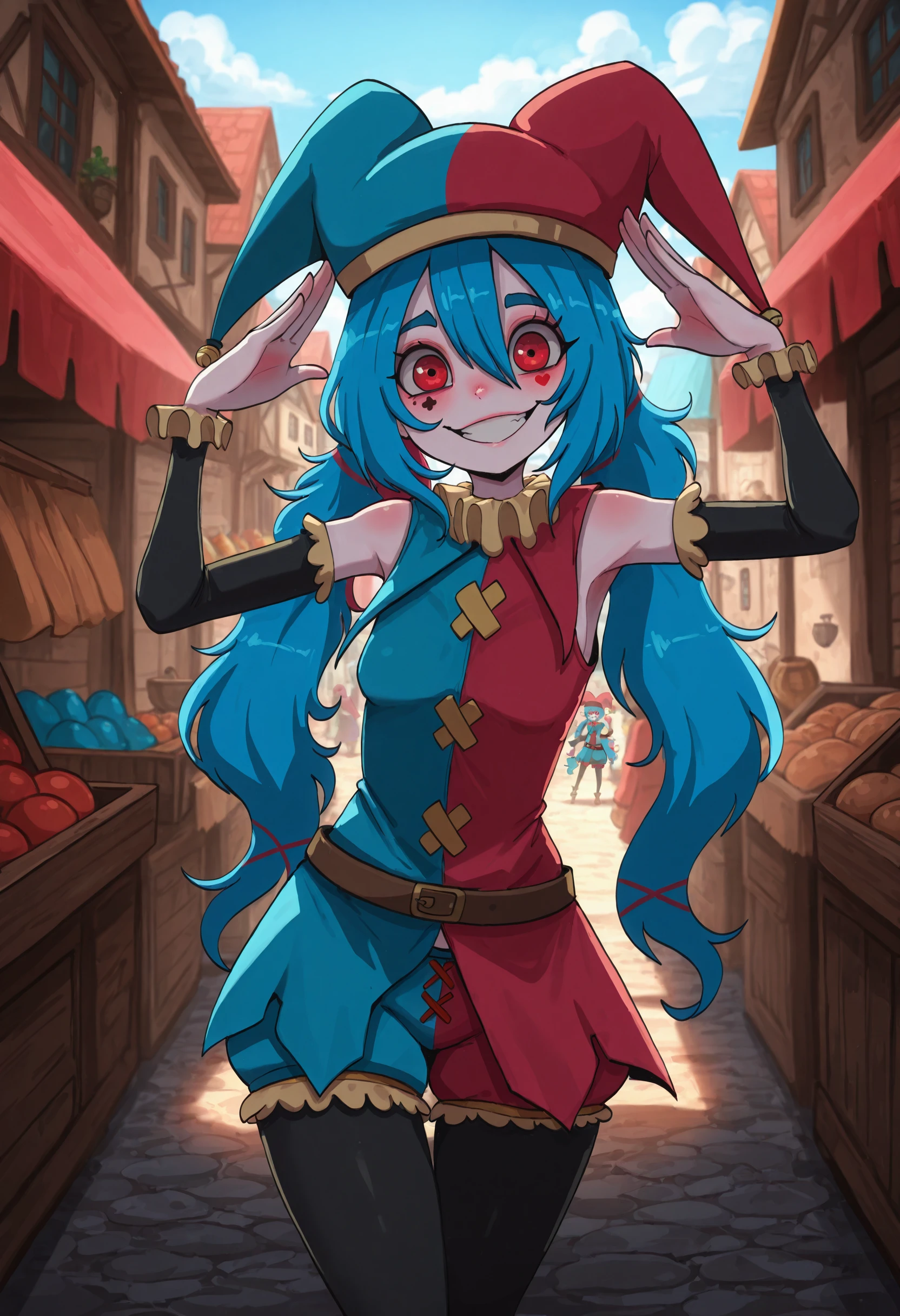 Pippi, 1girl, solo, Red hair with two pigtails, freckles, folded long-sleeved red shirt, short blue dress with yellow pocket, pink skirt underneath, mismatched tights with one yellow and pink striped and one plain purple, blue boots