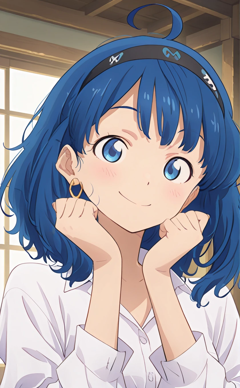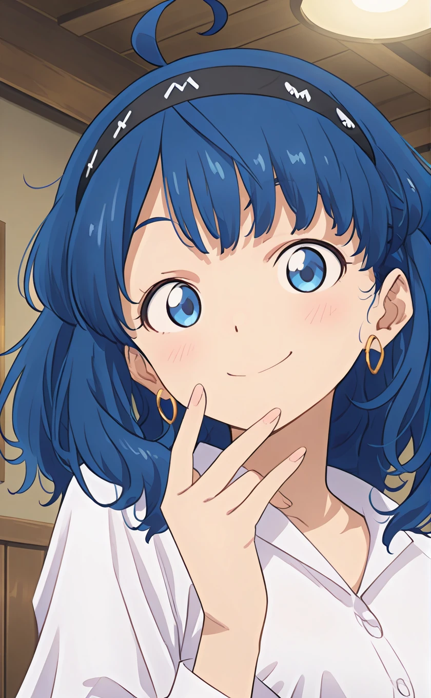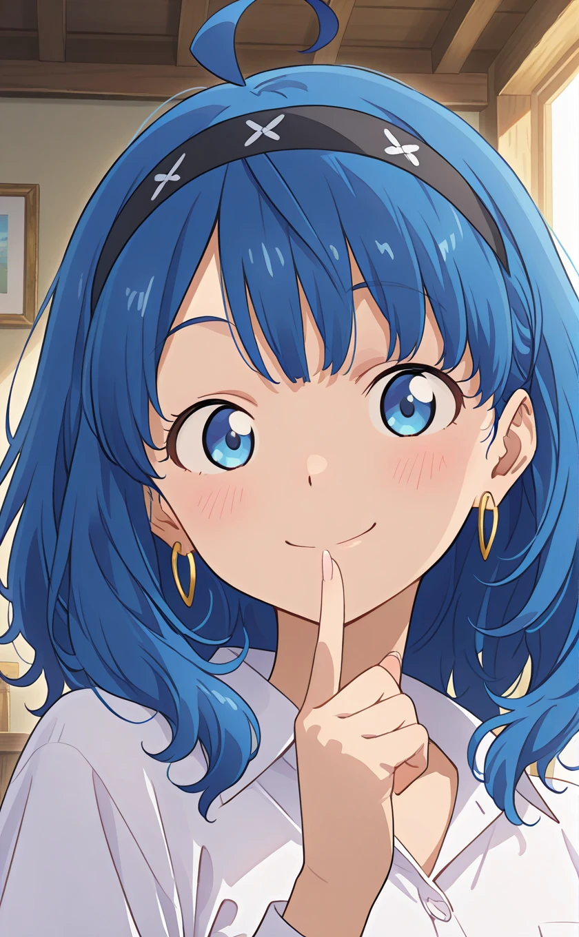 ahoge,medium hair,blue hair,black hairband,earrings,blue eyes