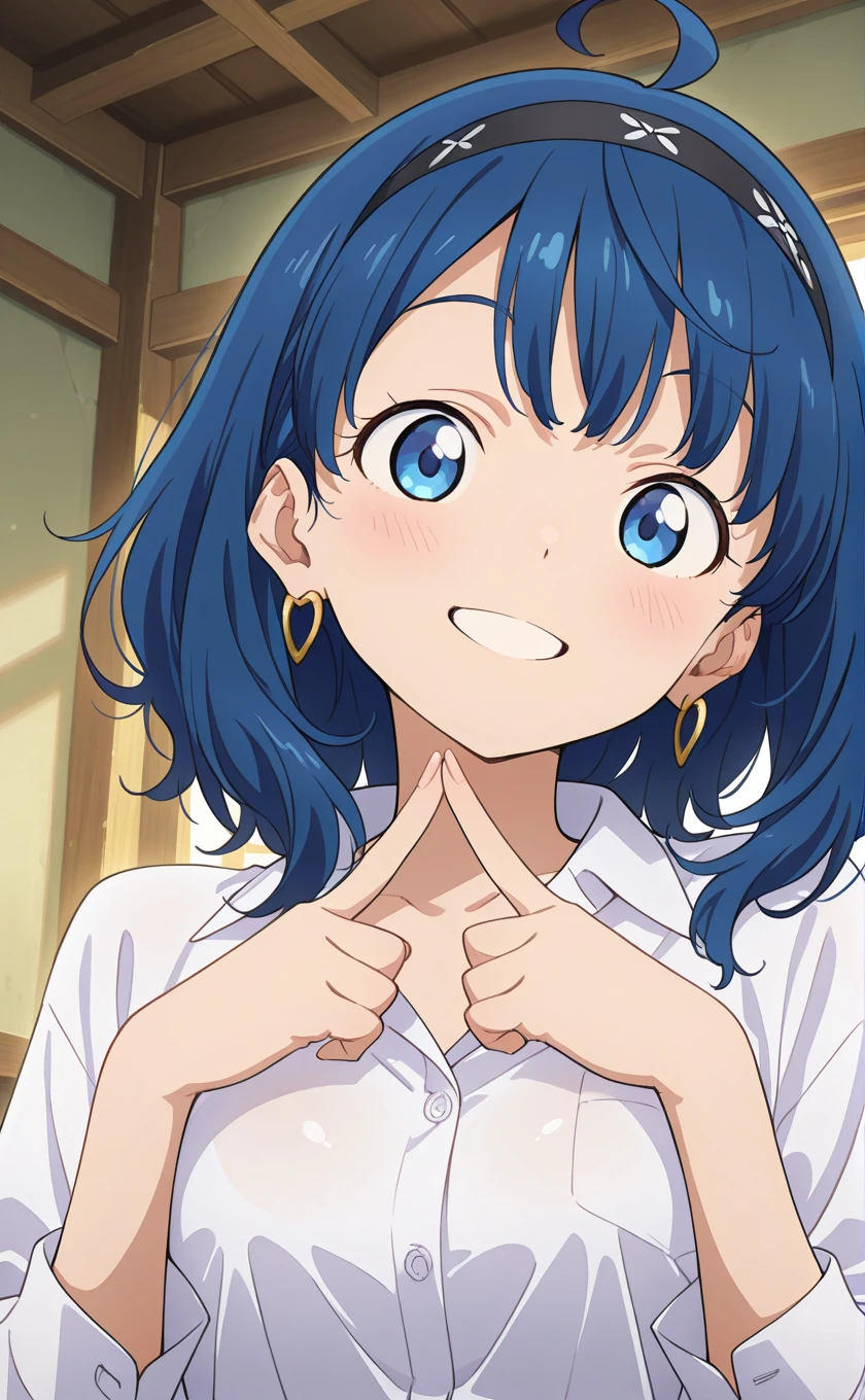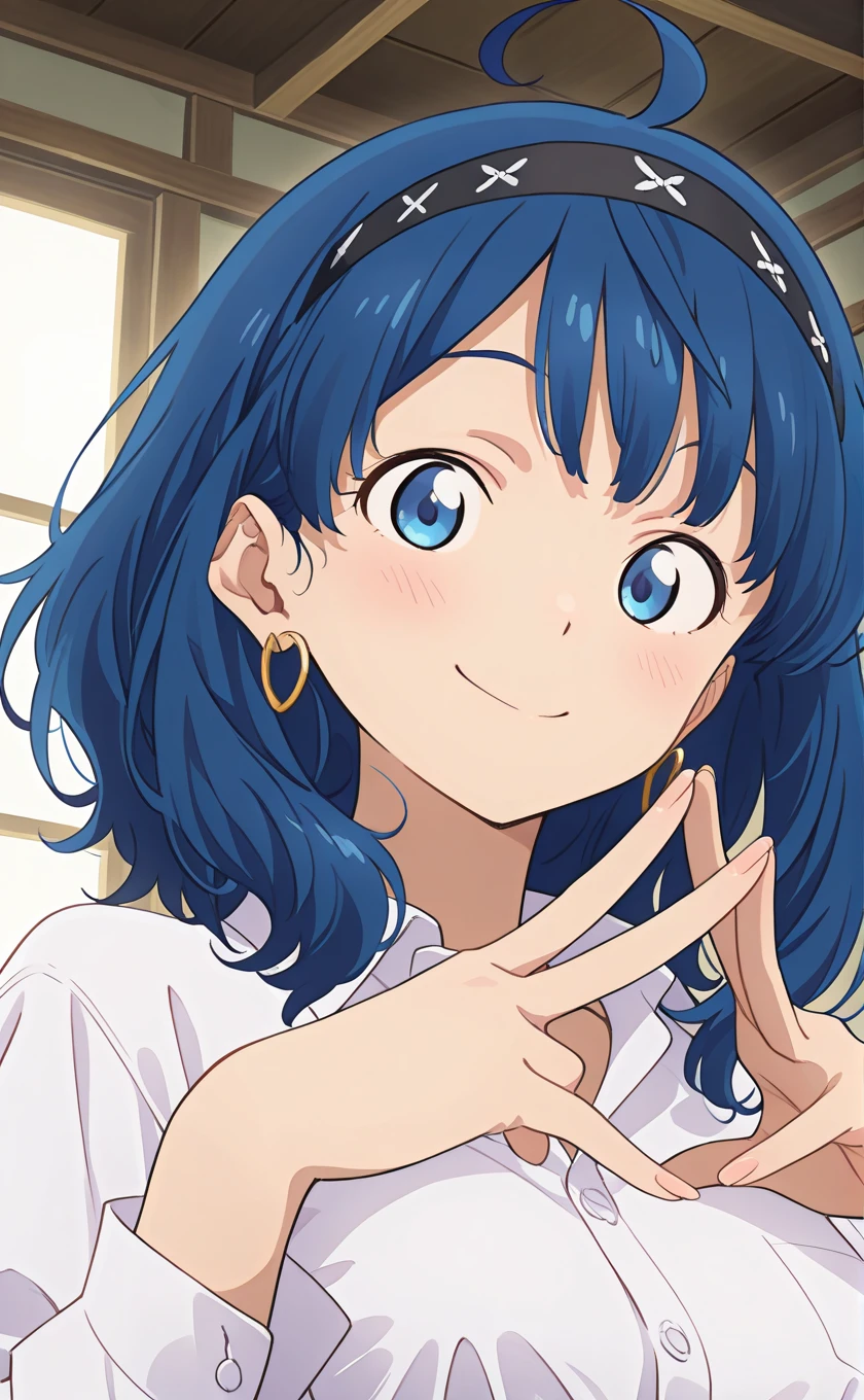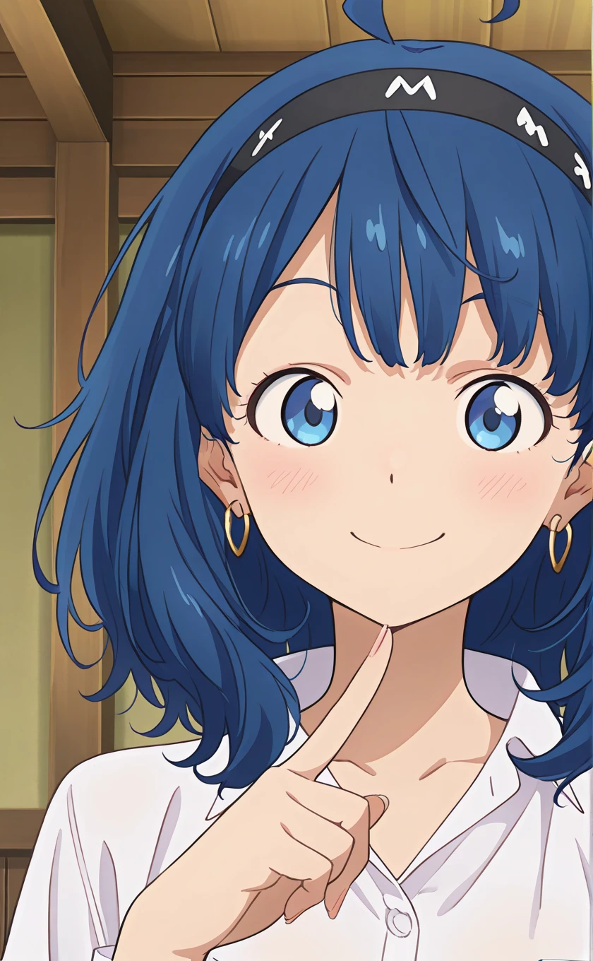 ahoge,medium hair,blue hair,black hairband,earrings,blue eyes