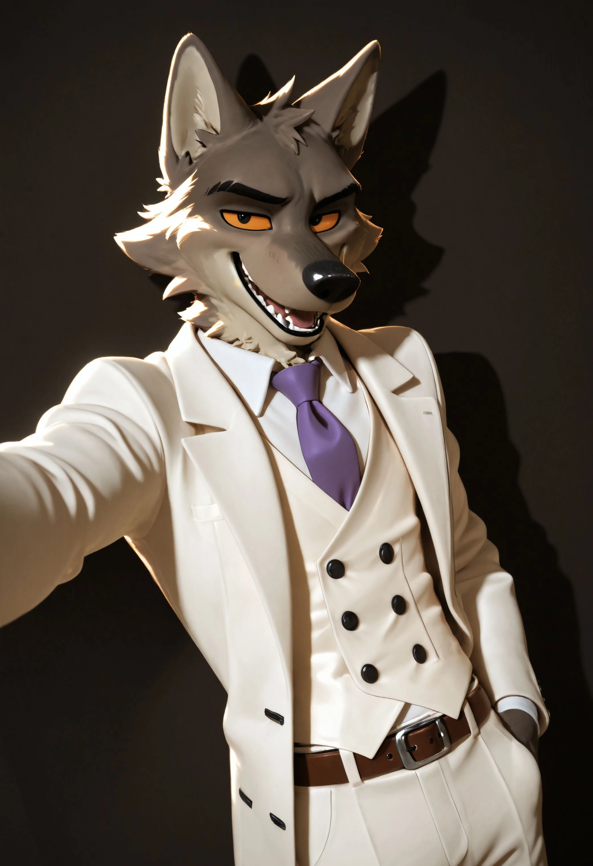 Pony: score_9, score_8_up, score_7_up, score_6_up, score_5_up, score_4_up, Mr wolf, bg, pink shirt, formal, suit, pants, white jacket, purple necktie, ...your tags...