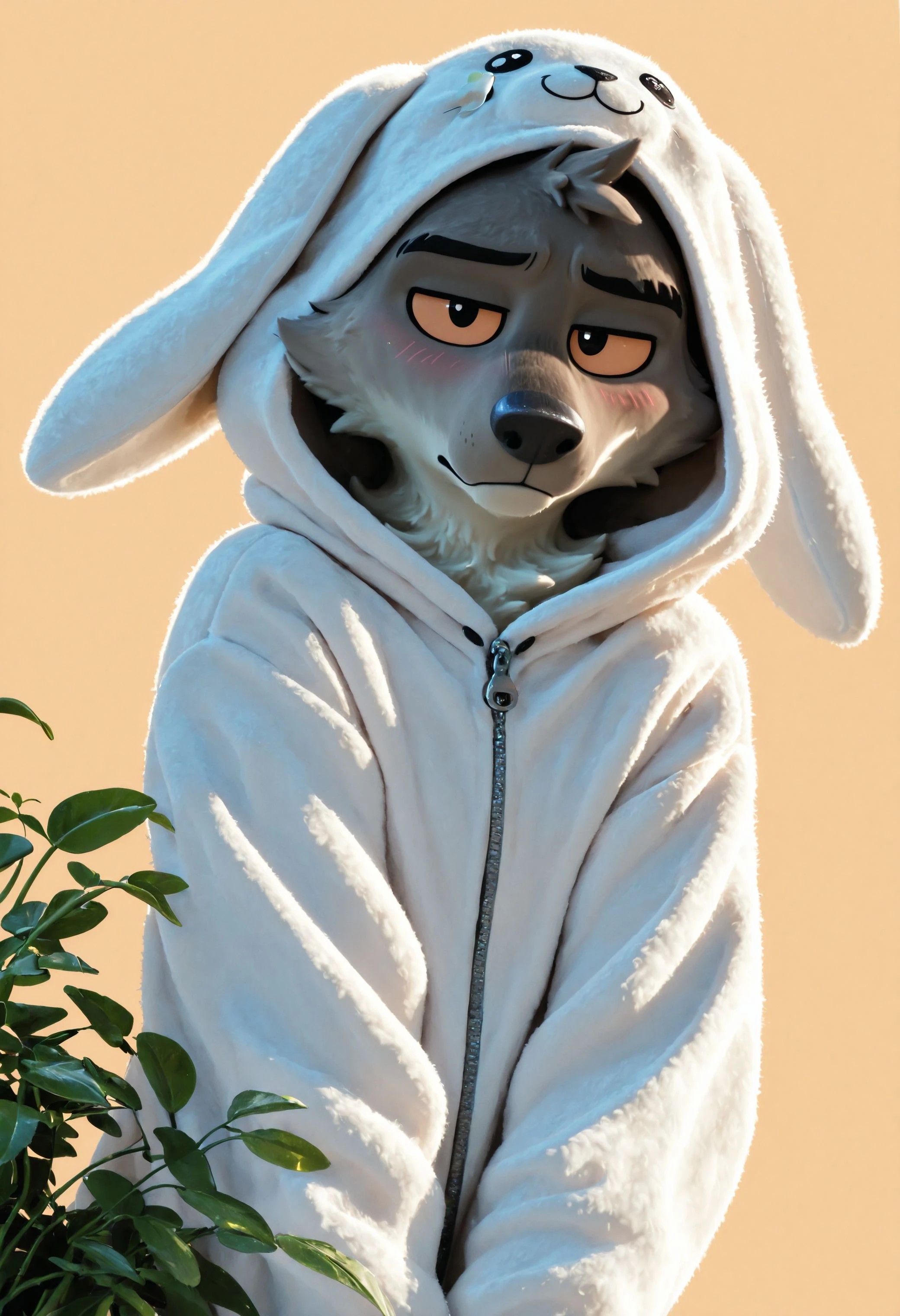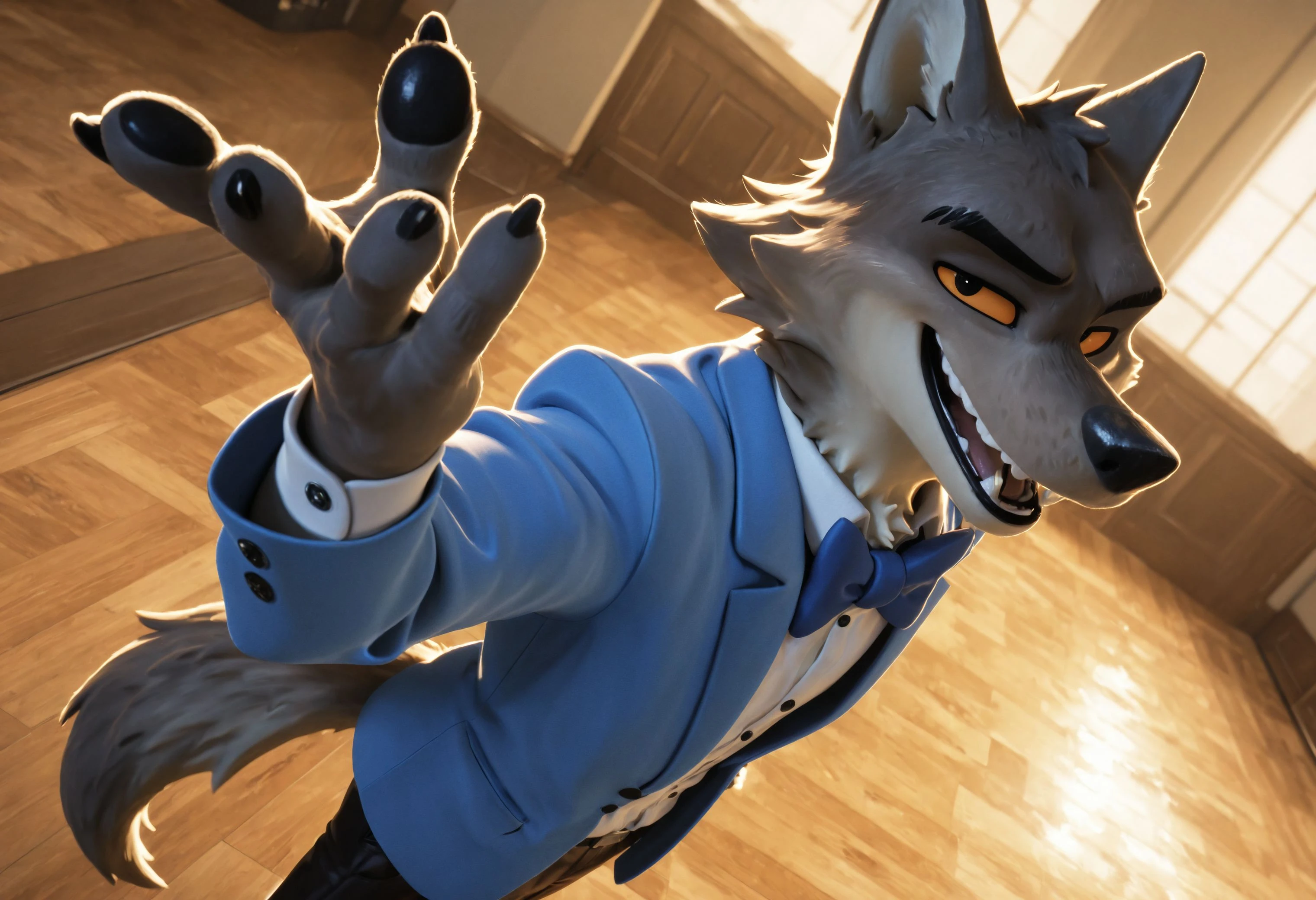 mr_wolf, bg, 1boy, solo, furry, furry male, animal ears, colored sclera, white shirt, pants, blue jacket, blue bowtie