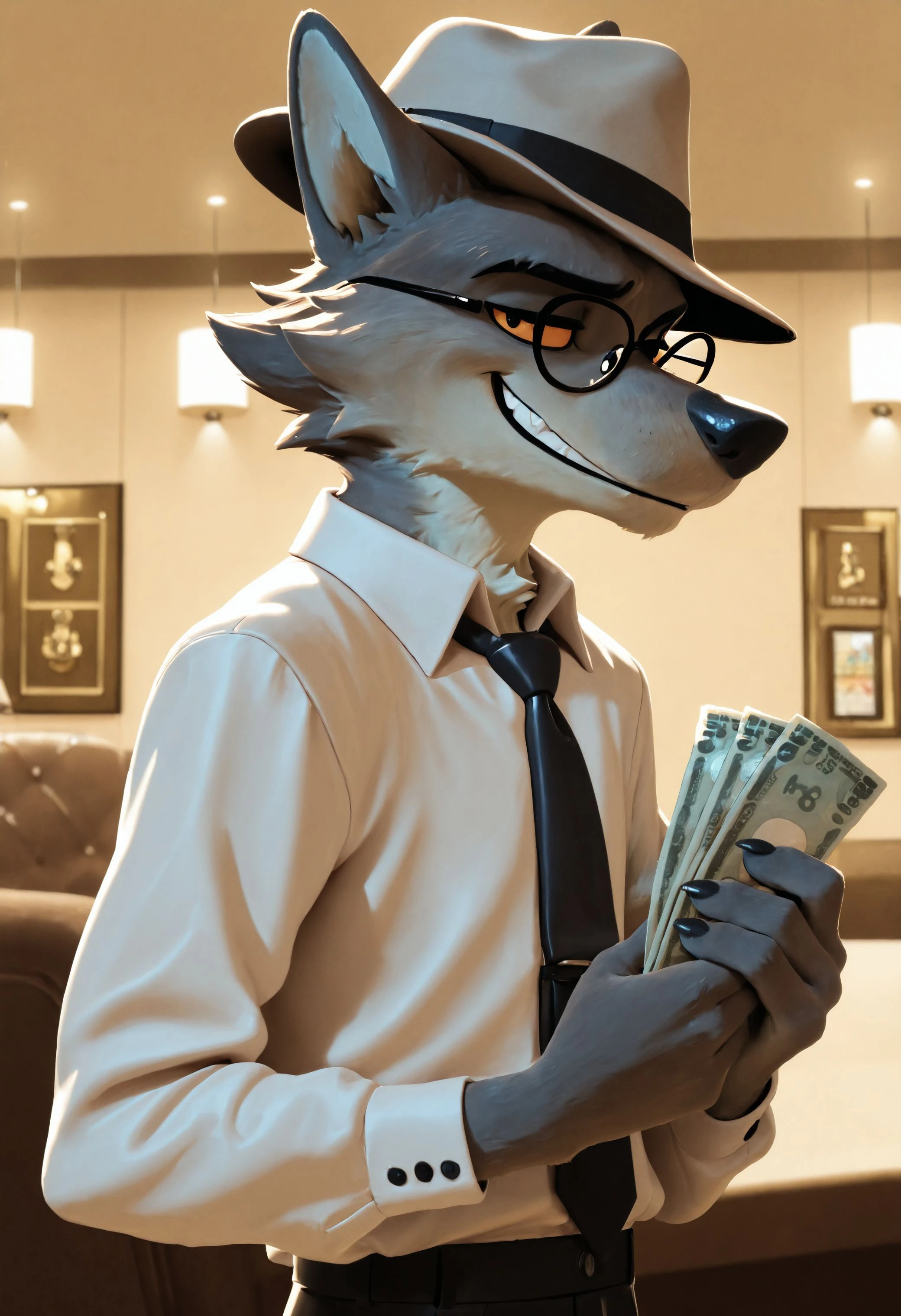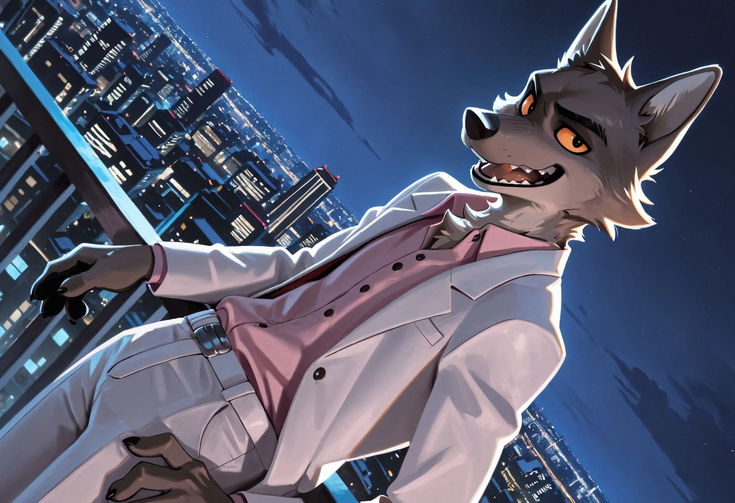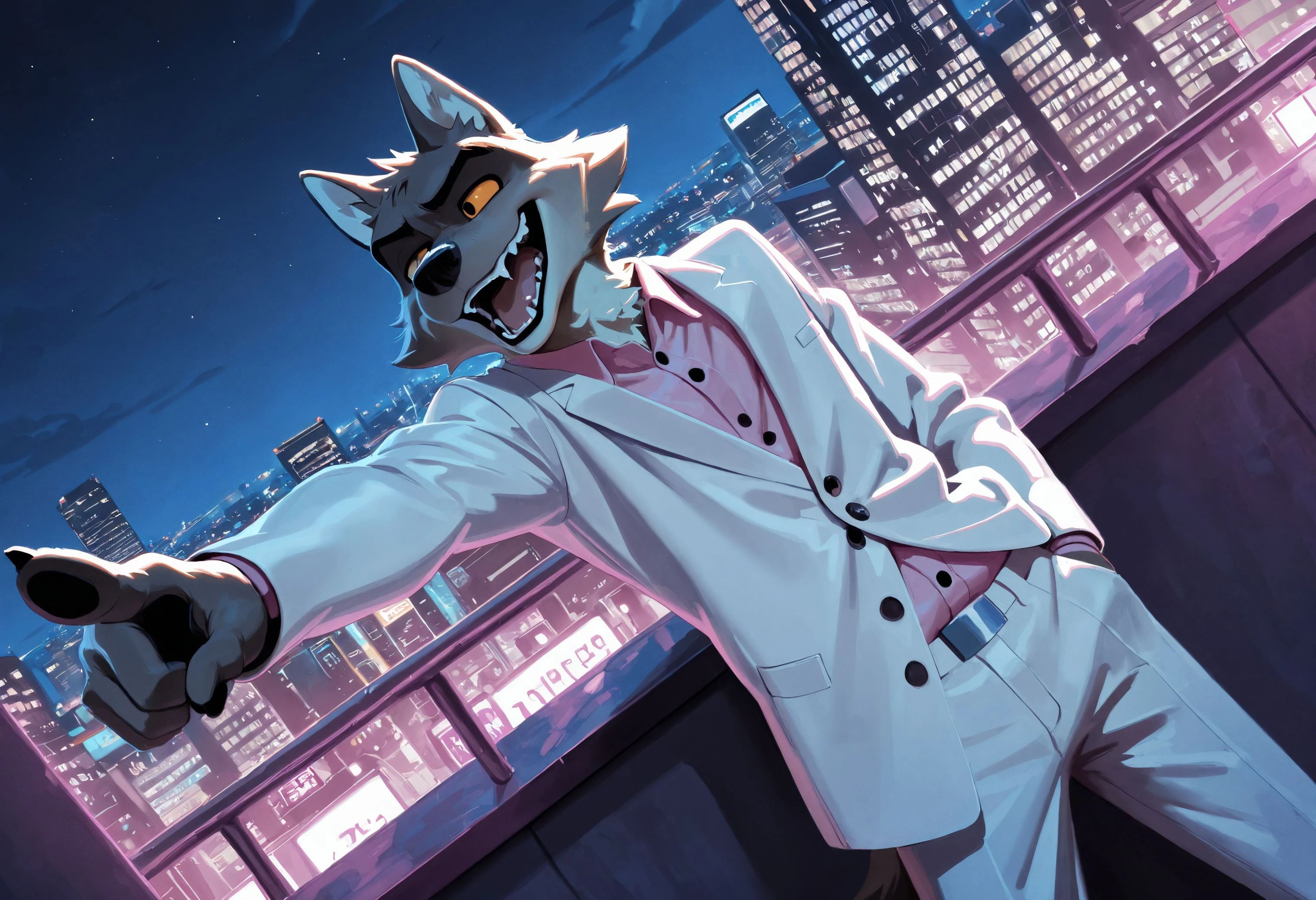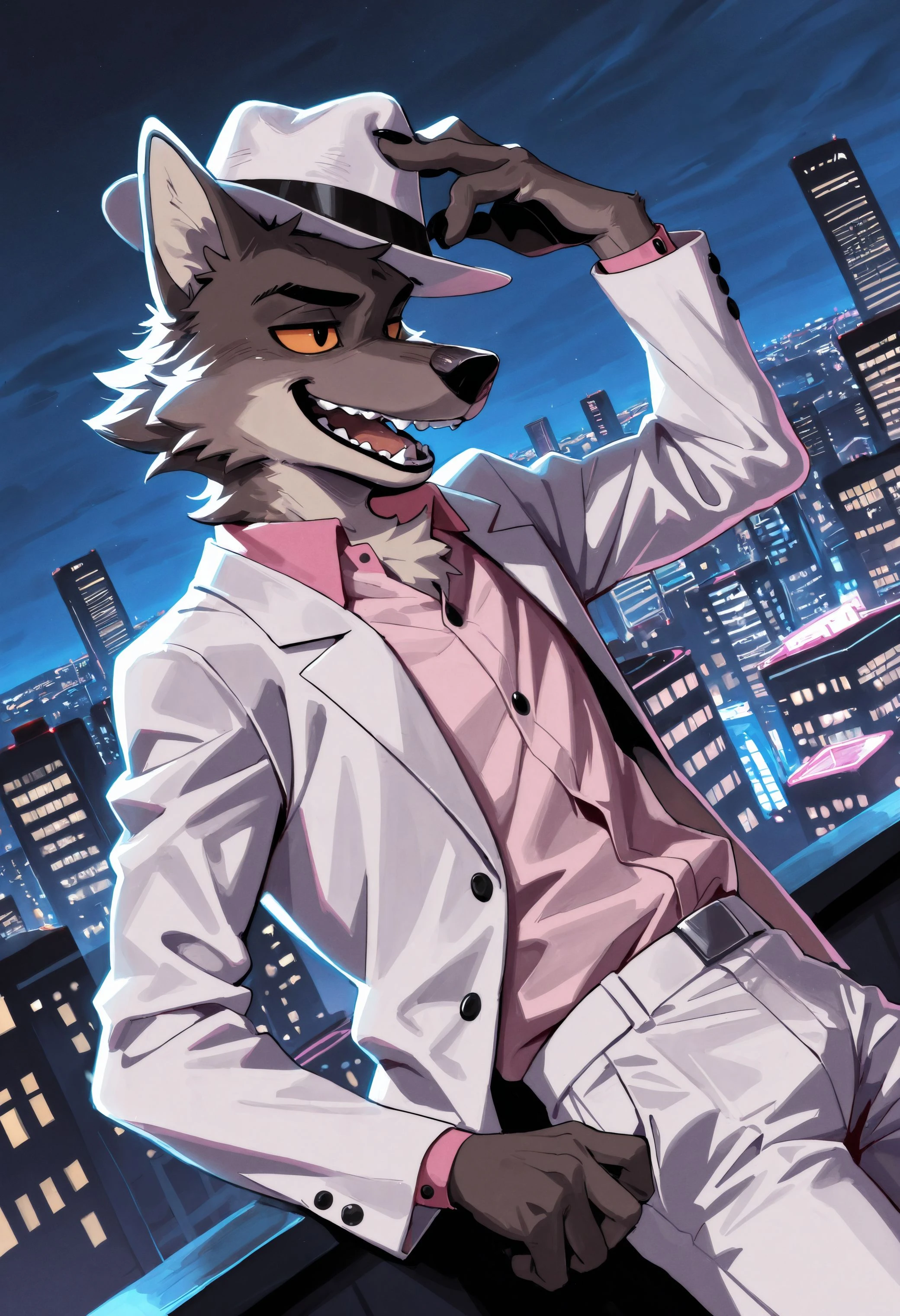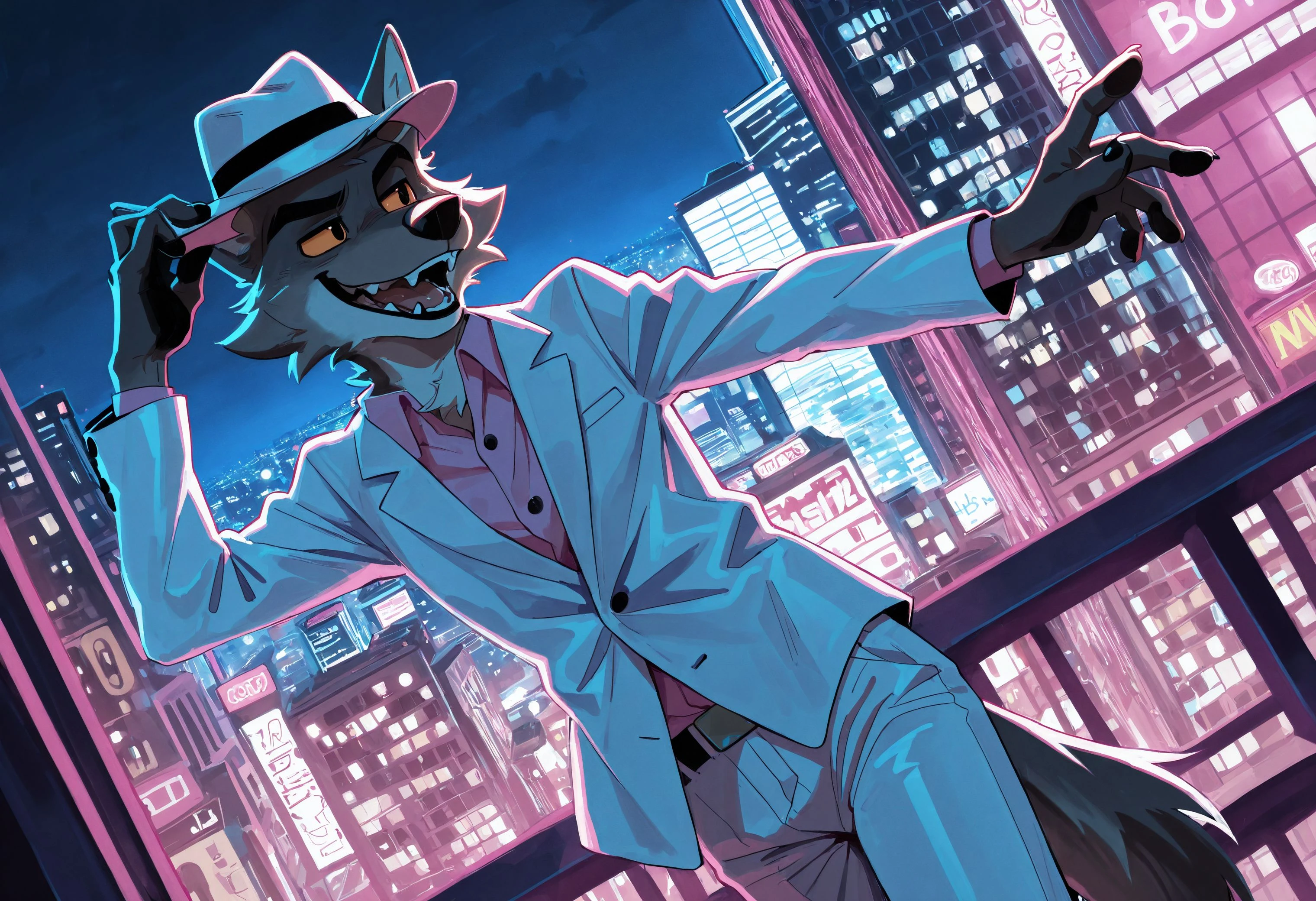 Illustrious: best quality, amazing quality, very aesthetic, absurdres, hires, mr_wolf, 1boy, solo, 2d, furry, furry male, animal ears, colored sclera, pink shirt, pants, white suit,night, city, detailed background, open mouth, ...your tags...