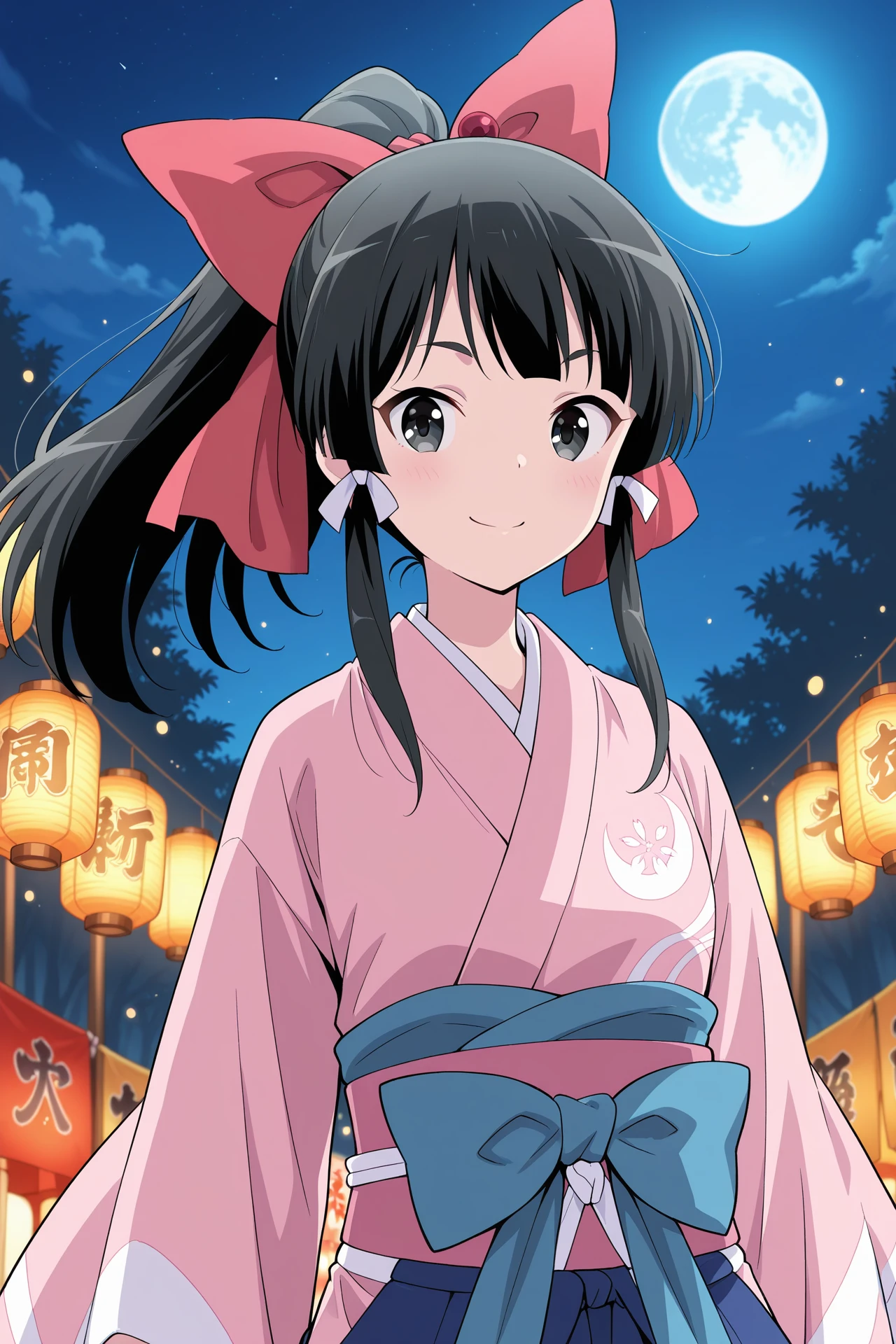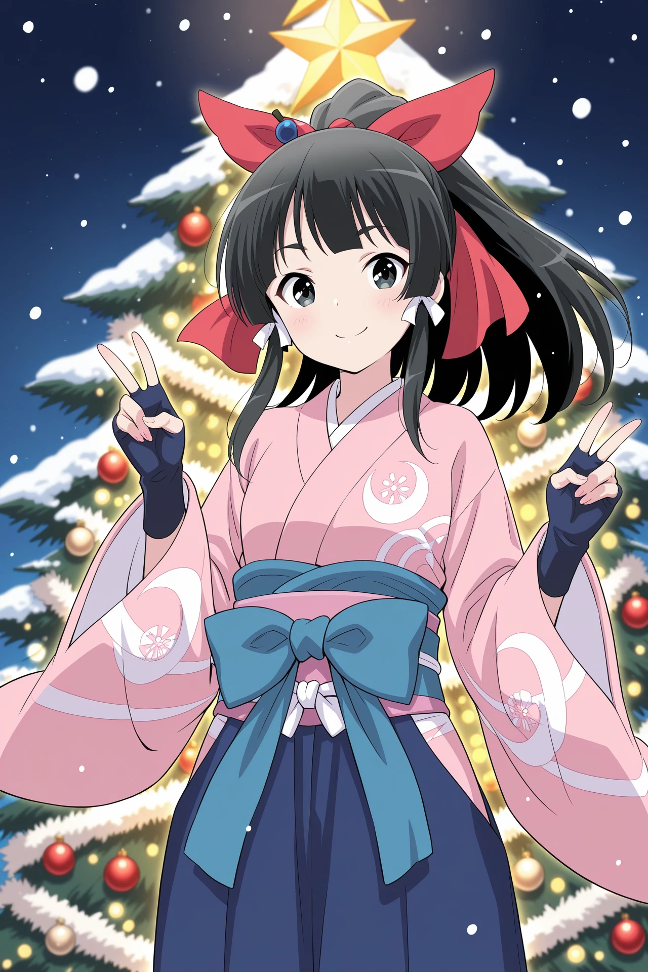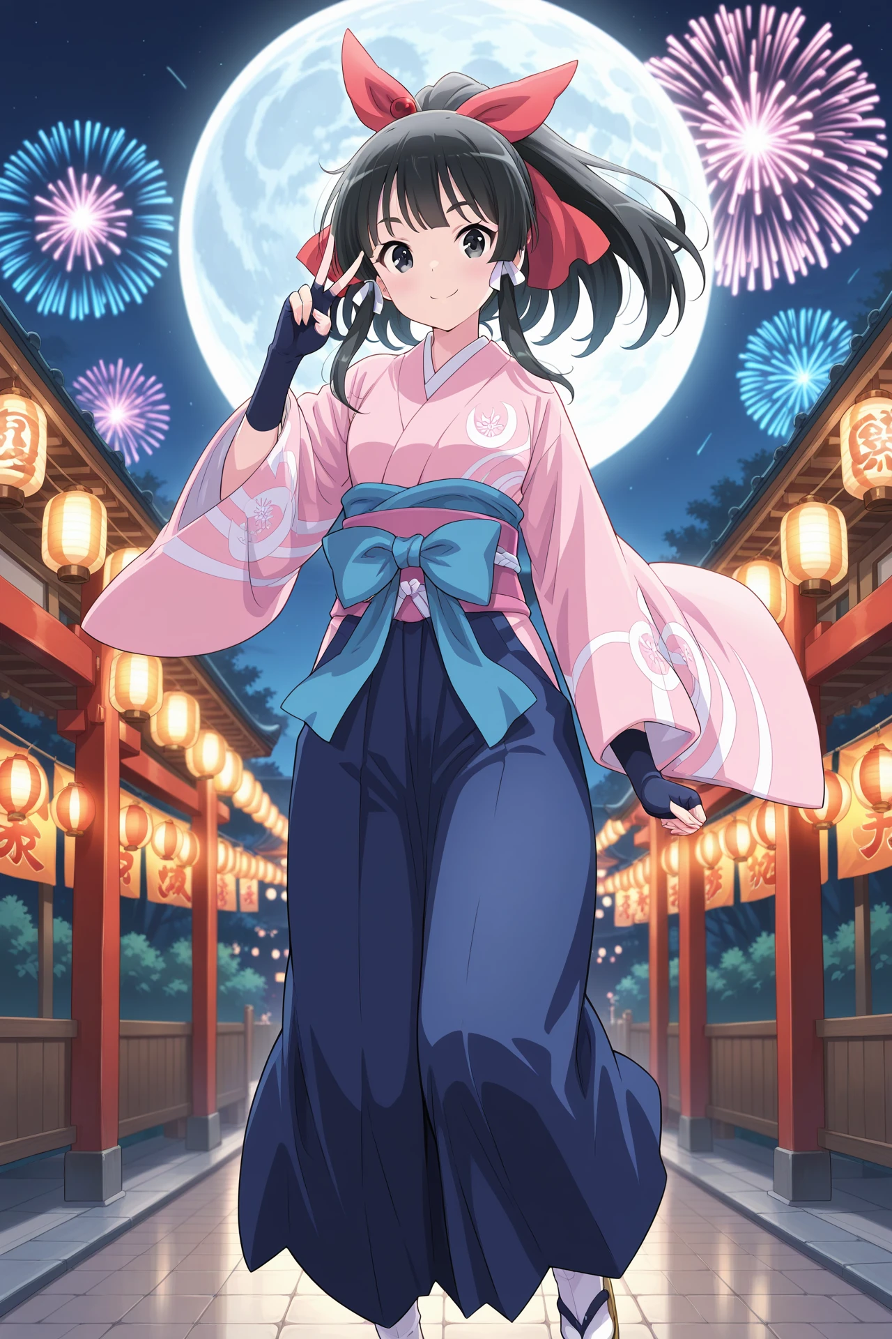 pink kimono, blue bow, long sleeves, wide sleeves, fingerless gloves, blue sash, obi, blue hakama, blue skirt, white socks, tabi, sandalsDescription