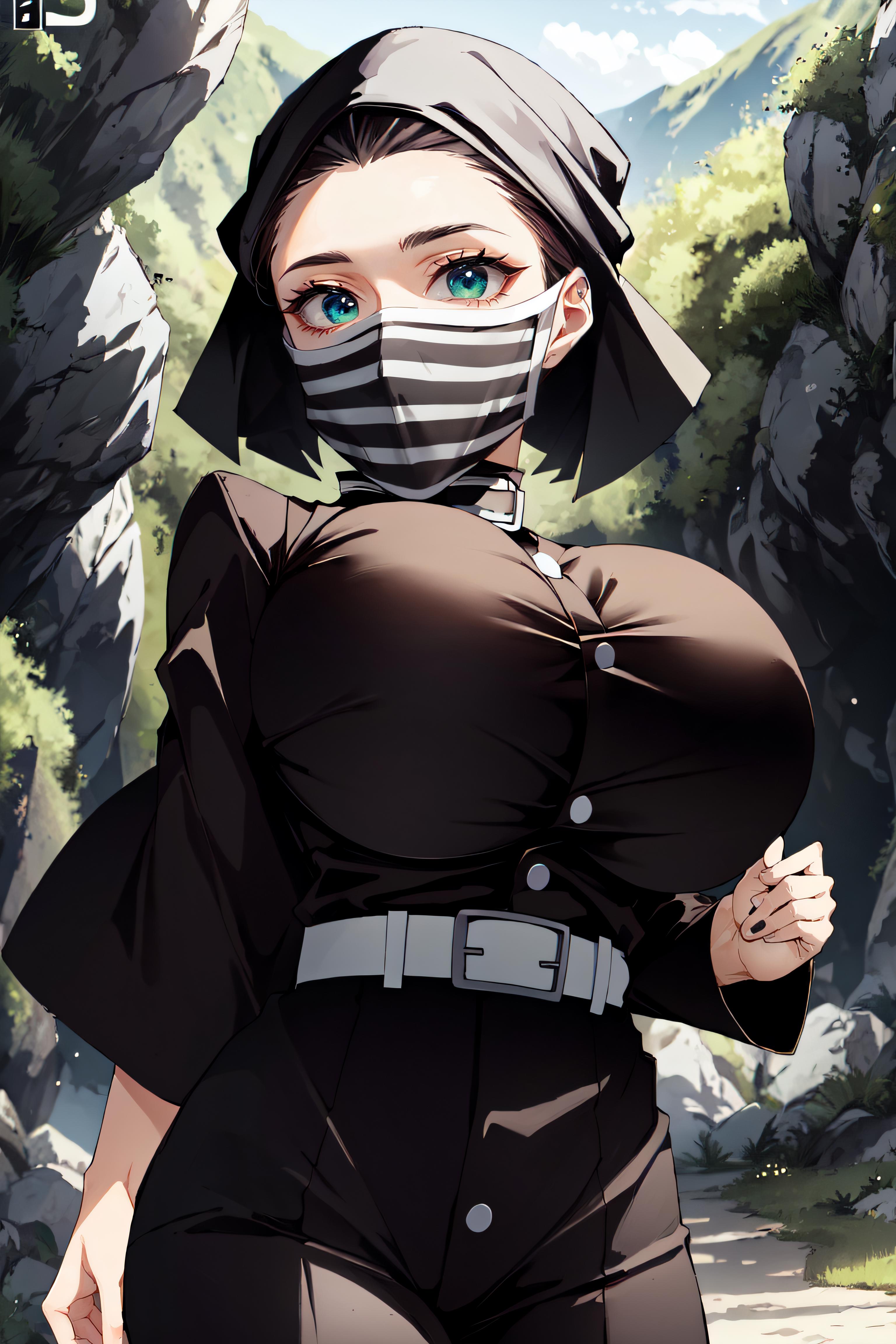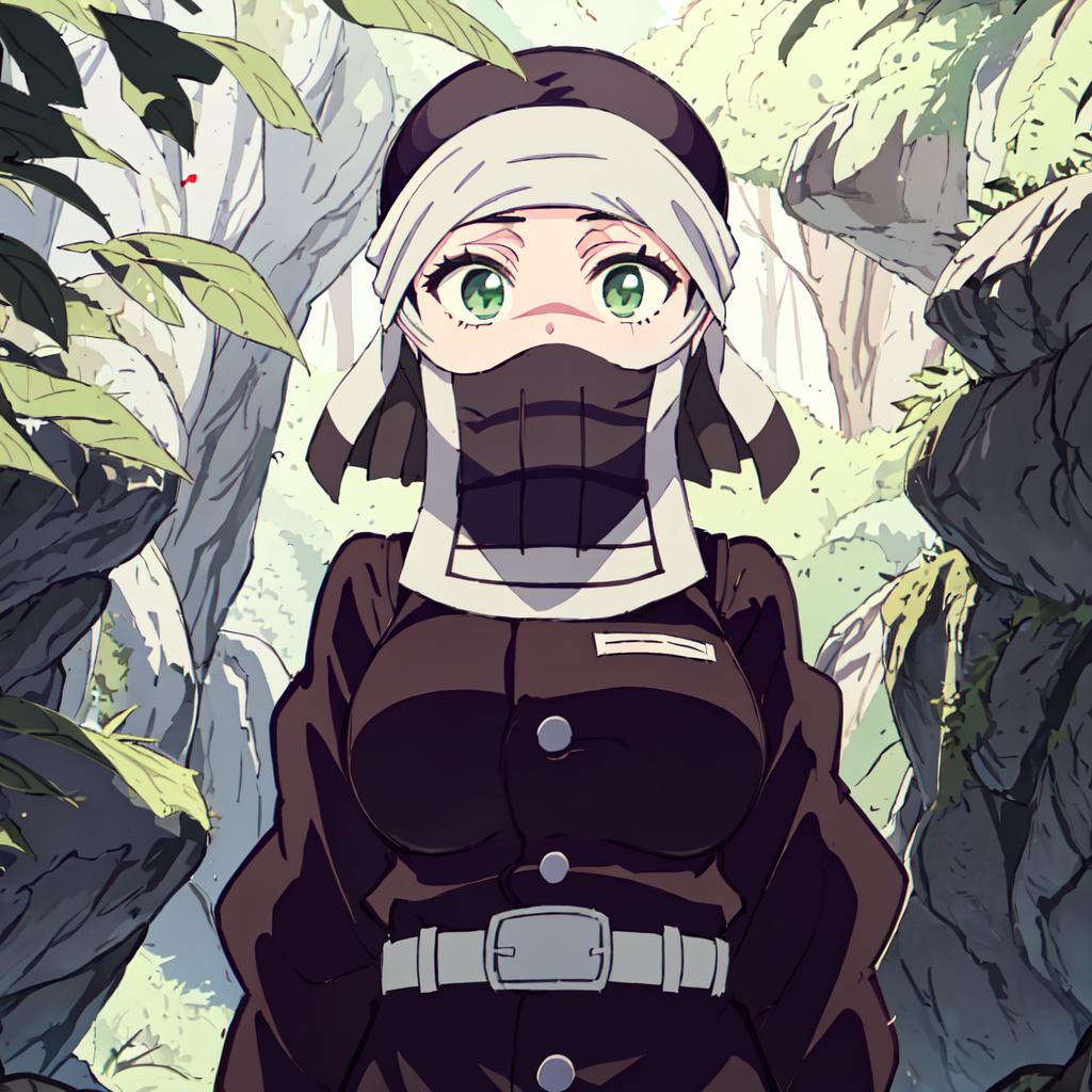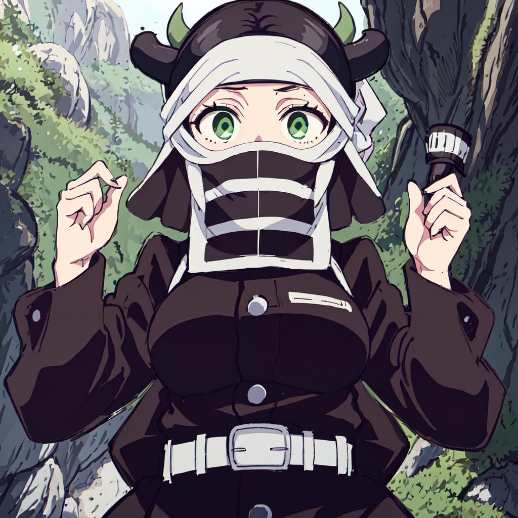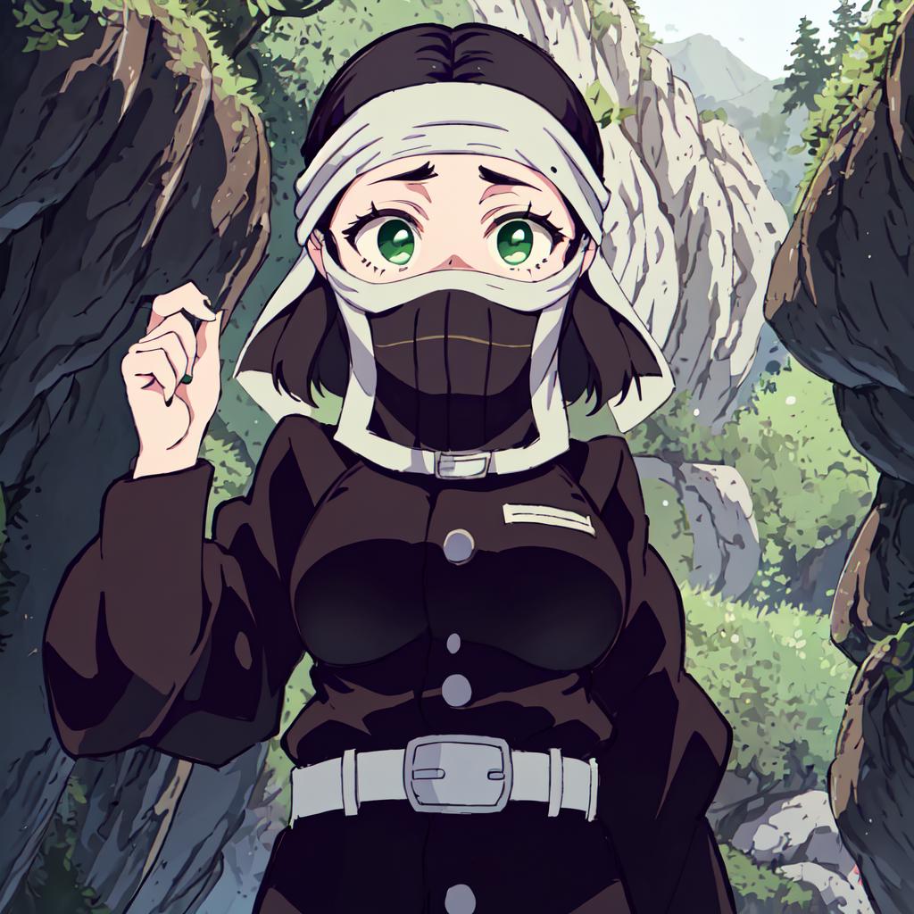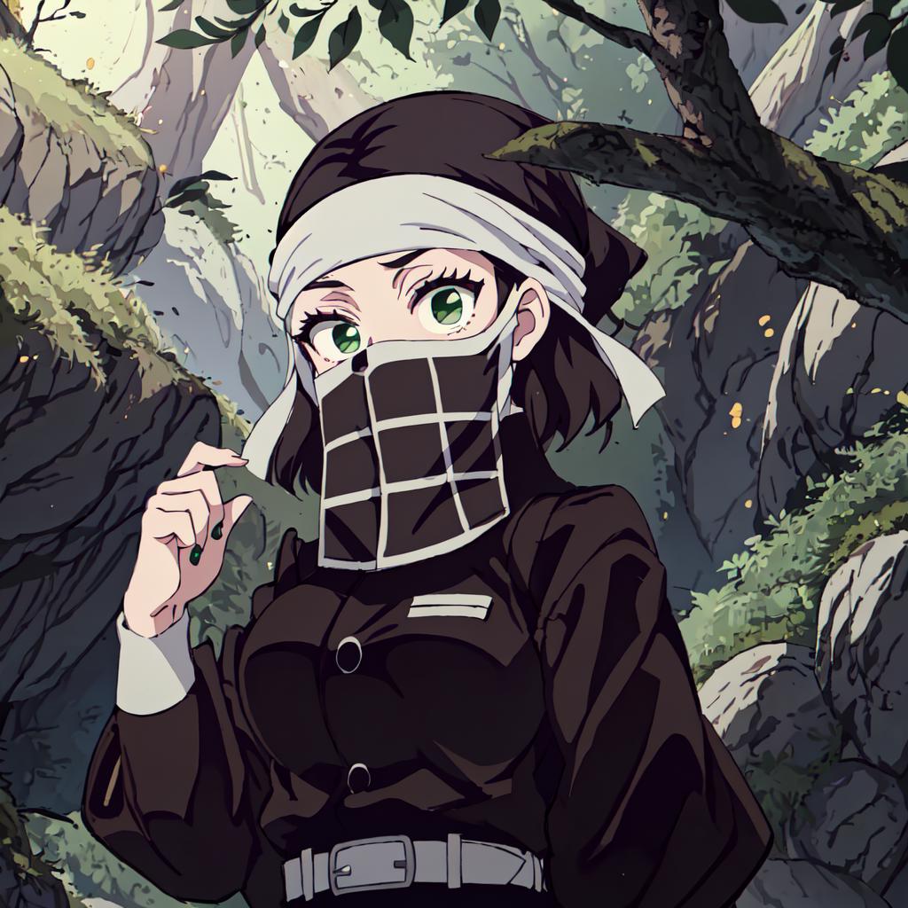 Kakushi_Girl, 1girl, solo, black hair, green eyes, belt, horizontal stripes mask, black and white mask, white belt, demon slayer uniform,bandana,short hair,forehead