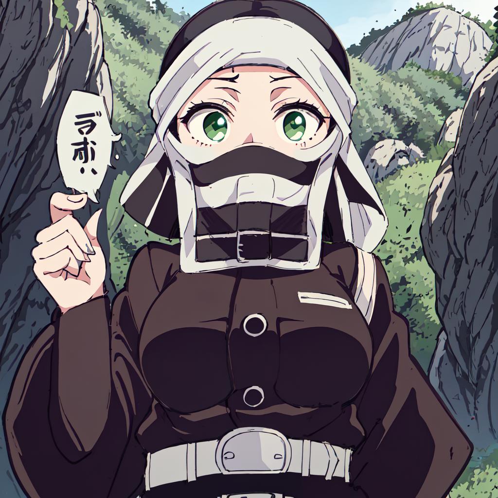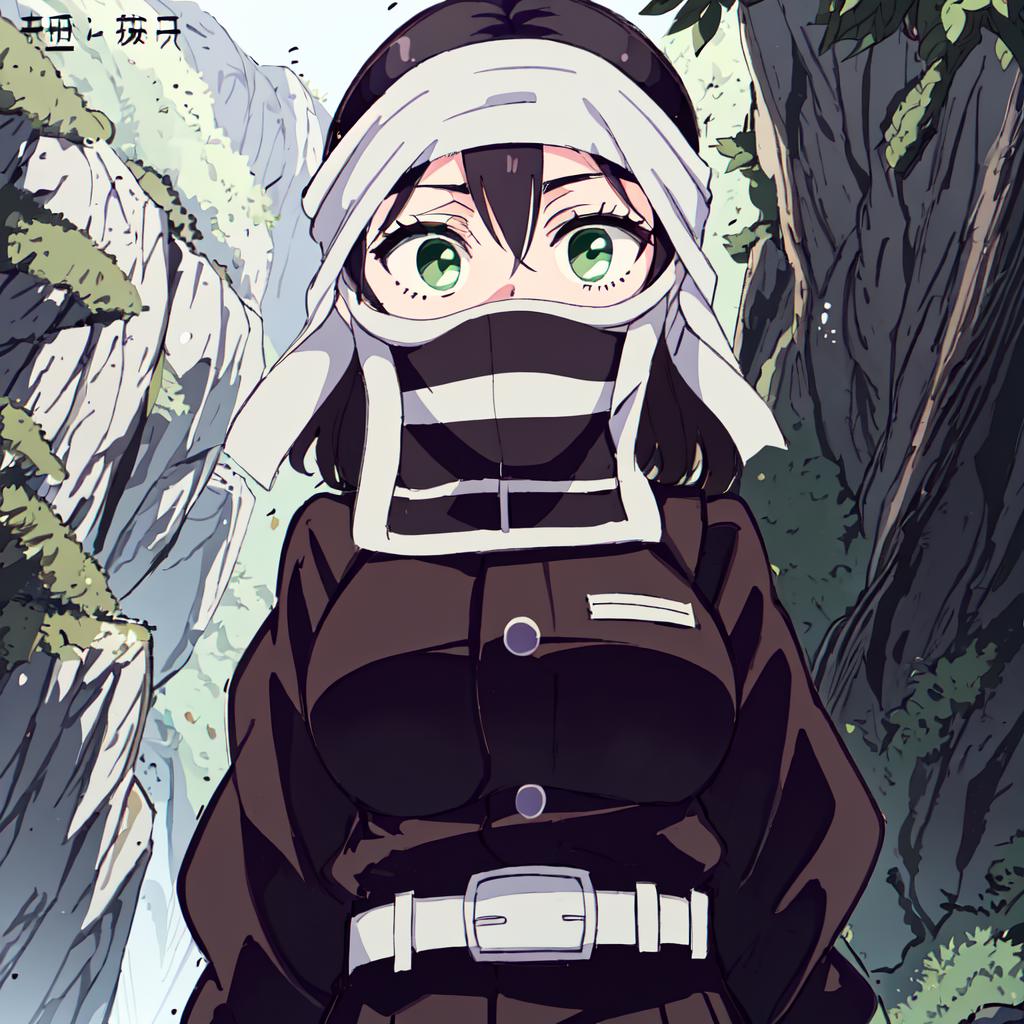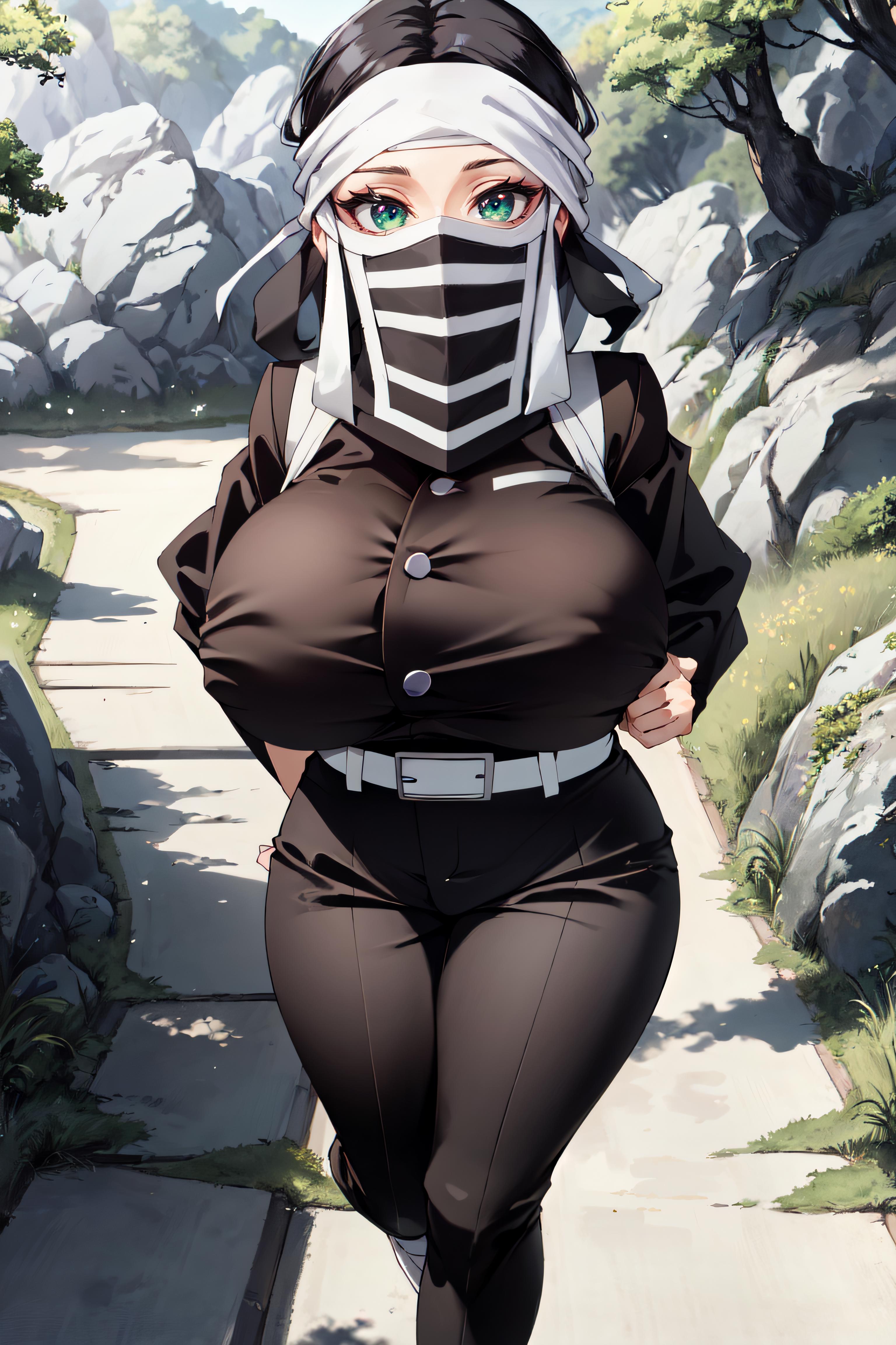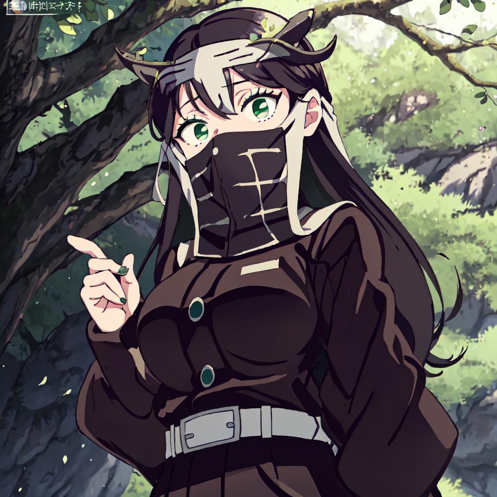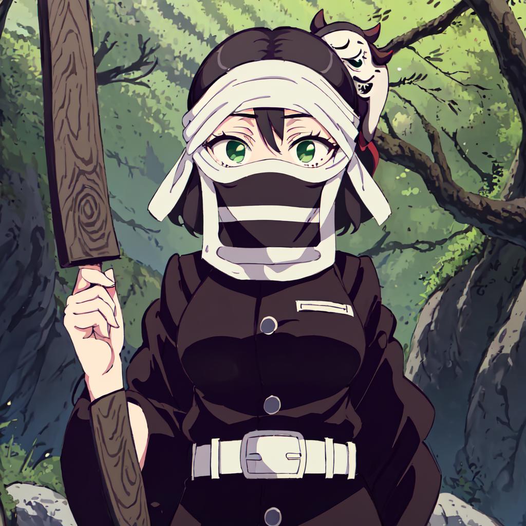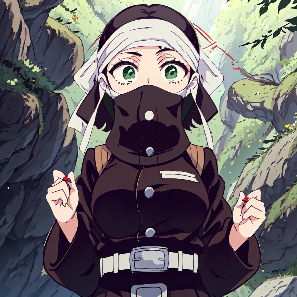 Kakushi_Girl, 1girl, solo, black hair, green eyes, belt, horizontal stripes mask, black and white mask, white belt, demon slayer uniform,bandana,short hair,forehead