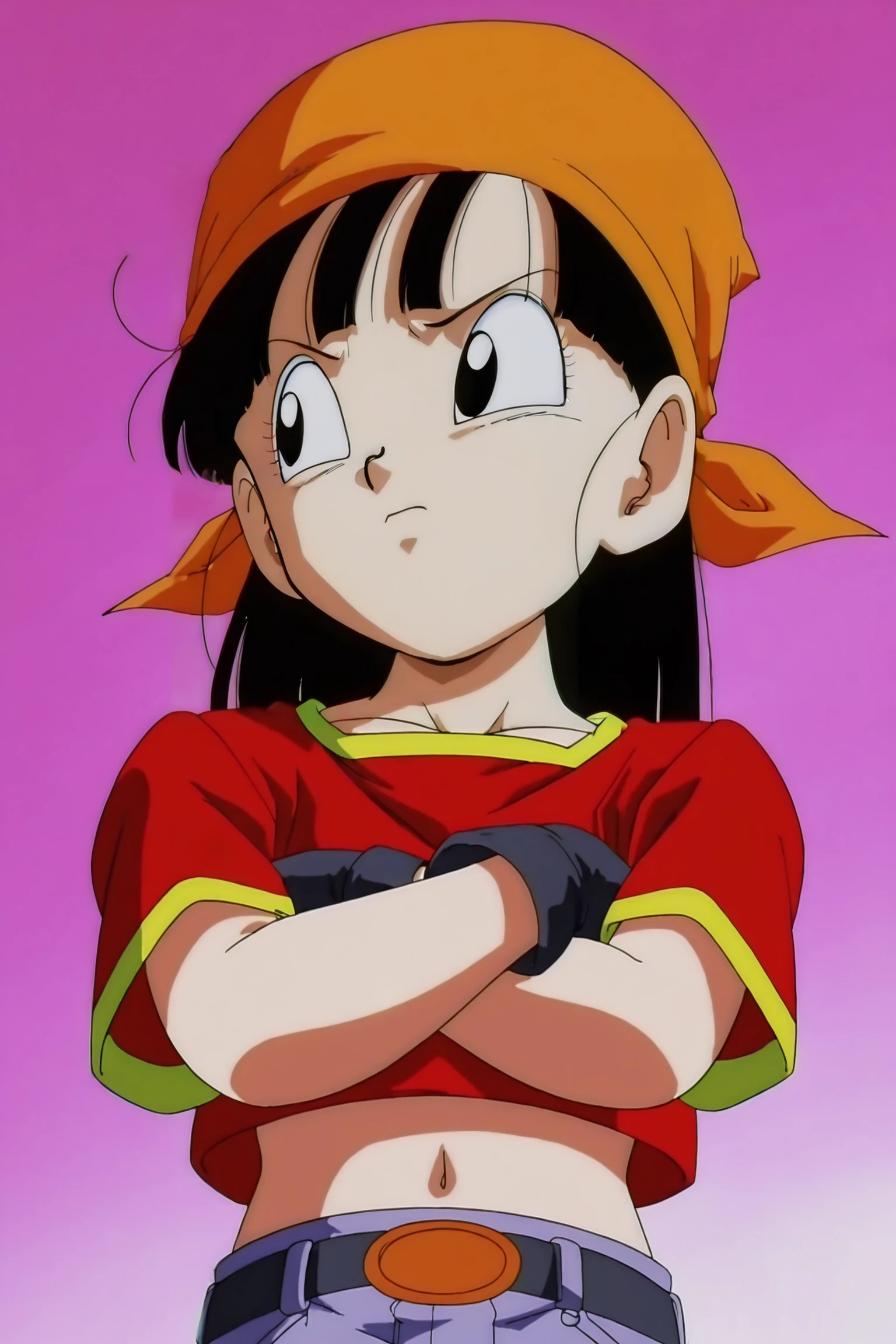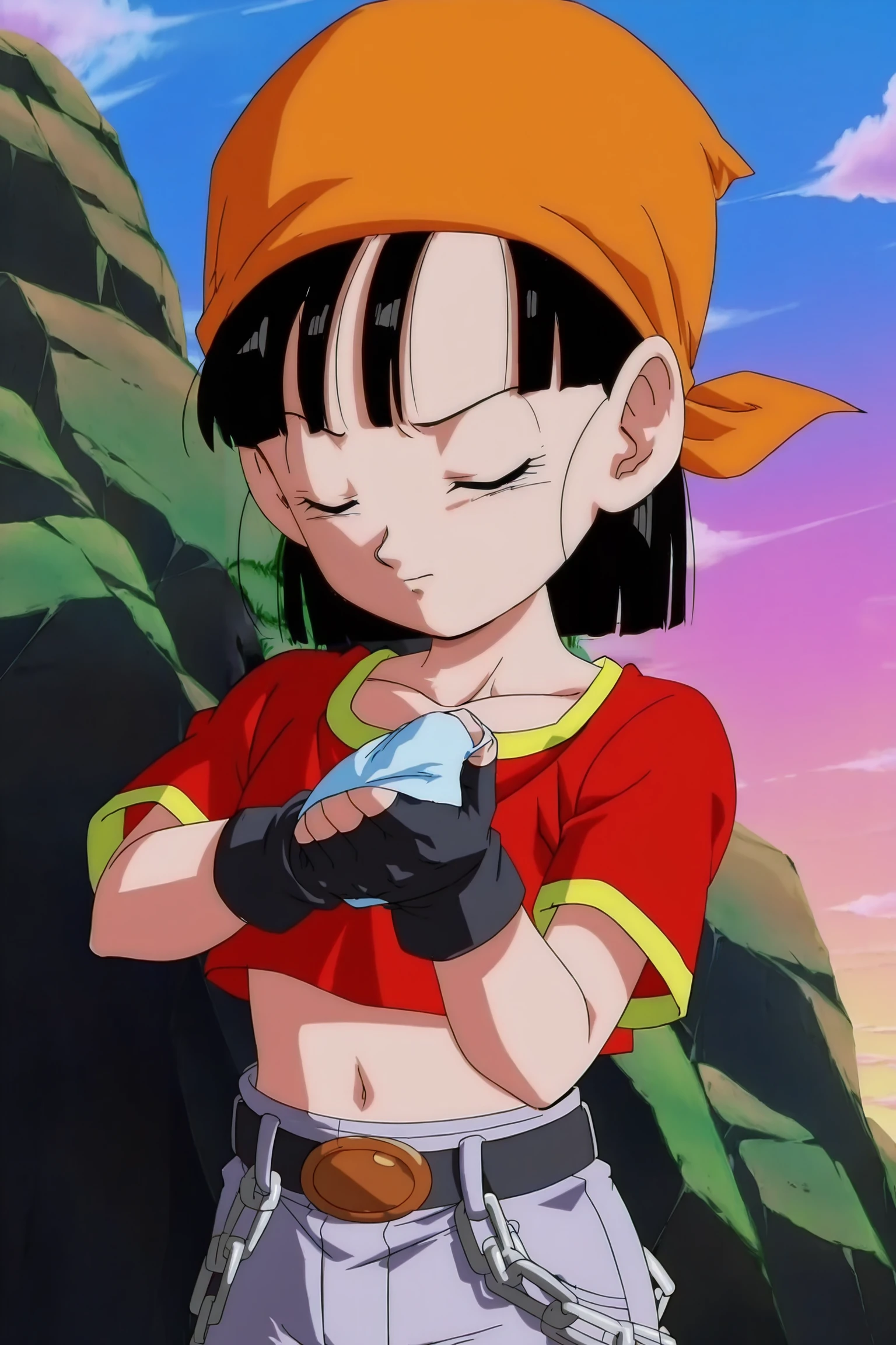 black gloves, gold trim, short sleeves, midriff, belt, fingerless gloves, chain, red shirt, orange bandana, loose socks, purple legwear, sneakers, blue footwear,