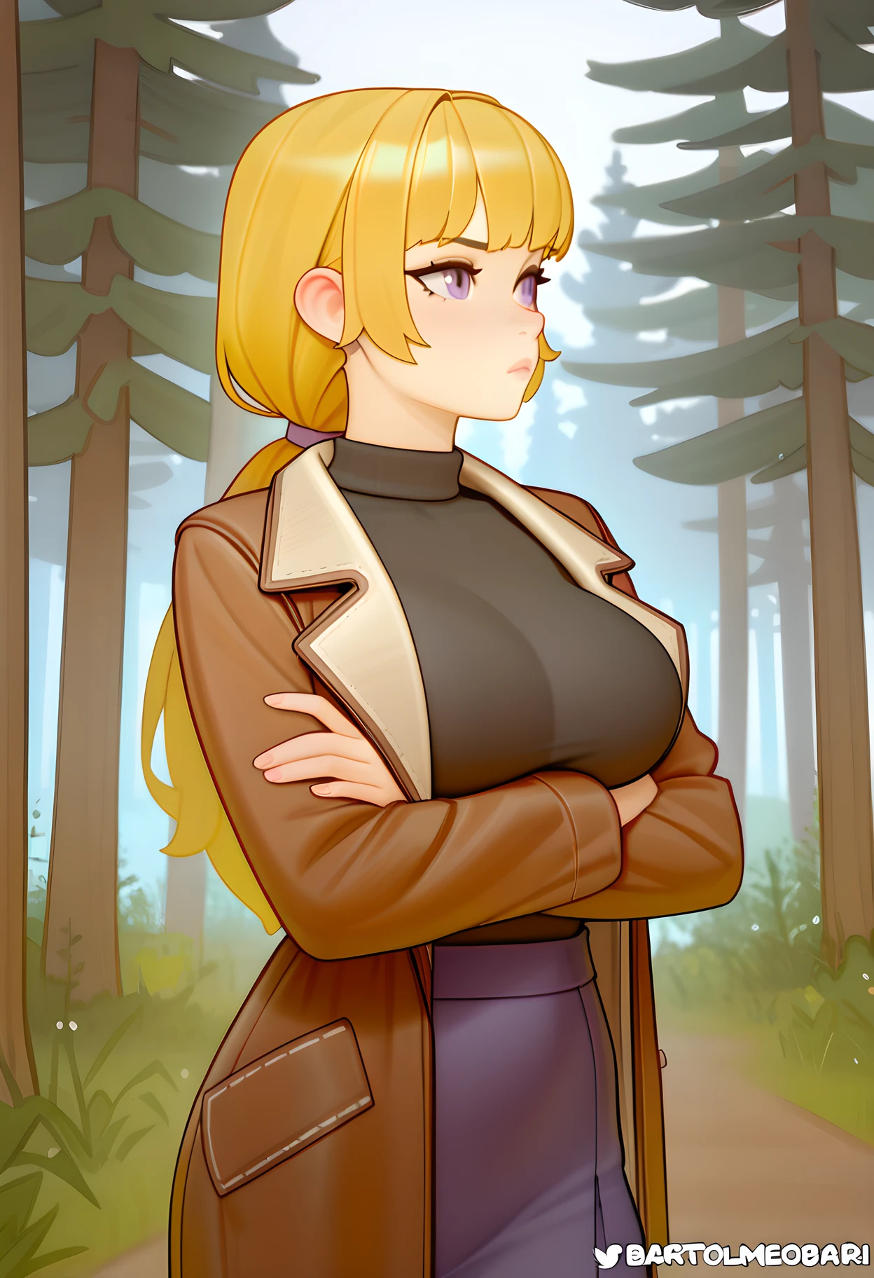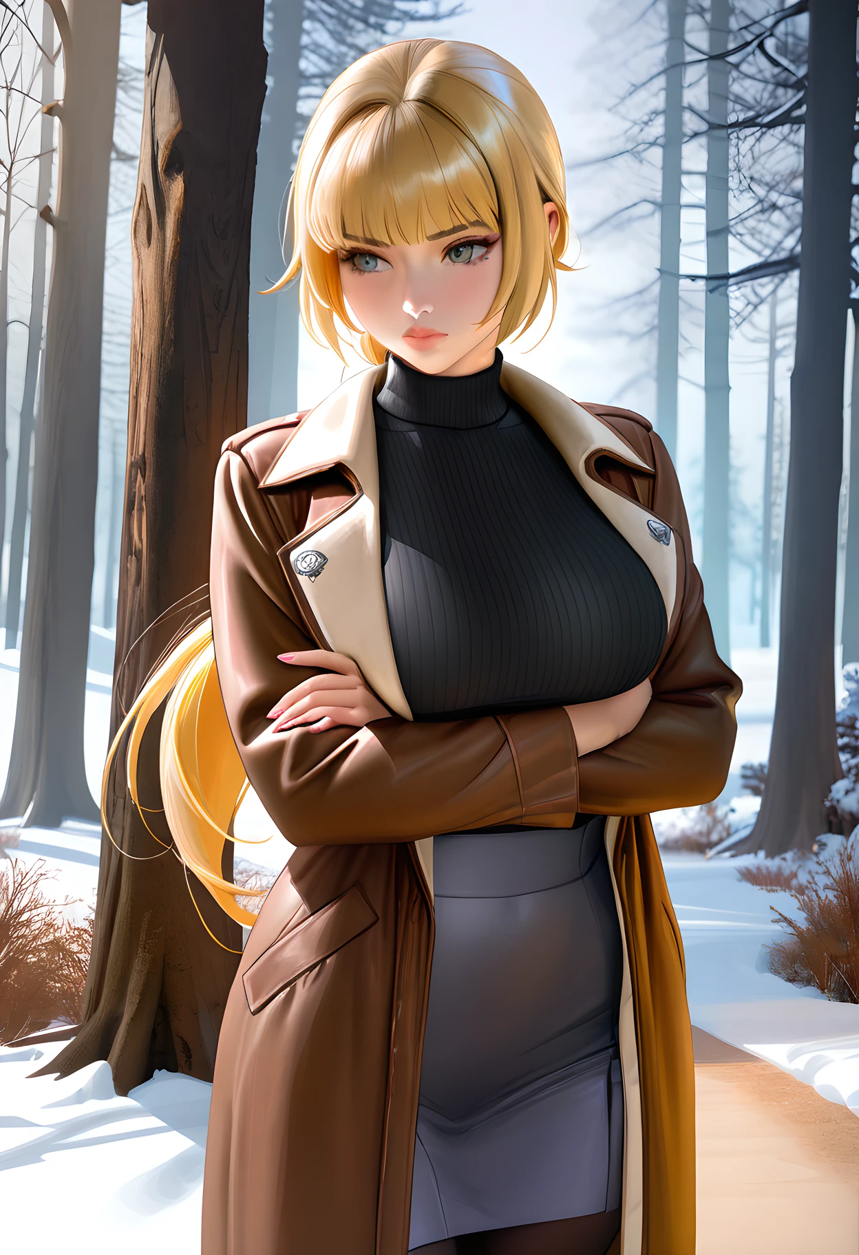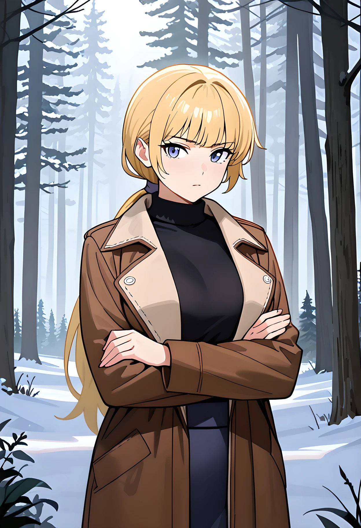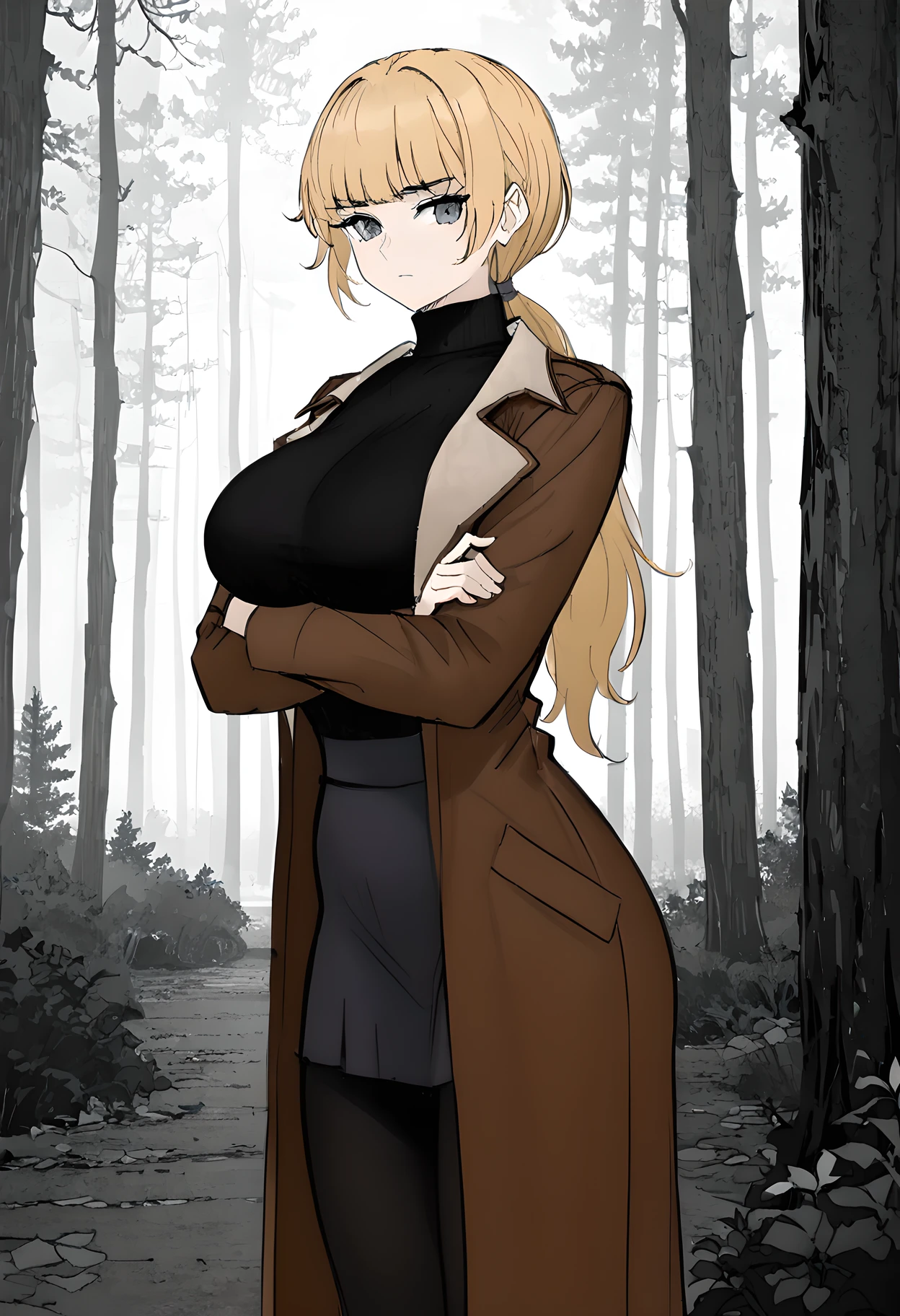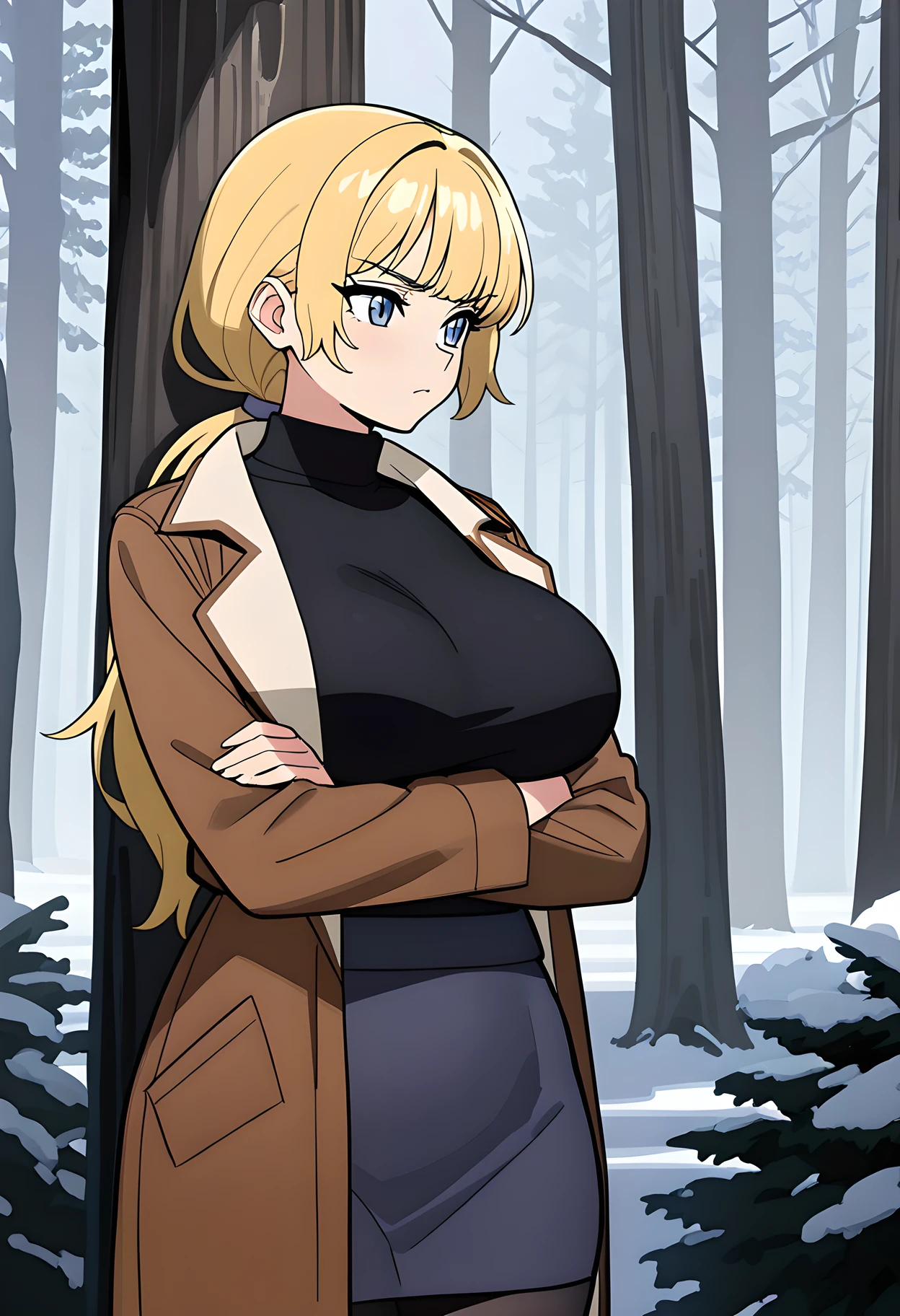 kar1n_f3ar, large breasts, blonde hair, long hair, ponytail, bangs, brown coat, black sweater, black pantyhose, open coat, open clothes, jacket, turtleneck, brown jacket