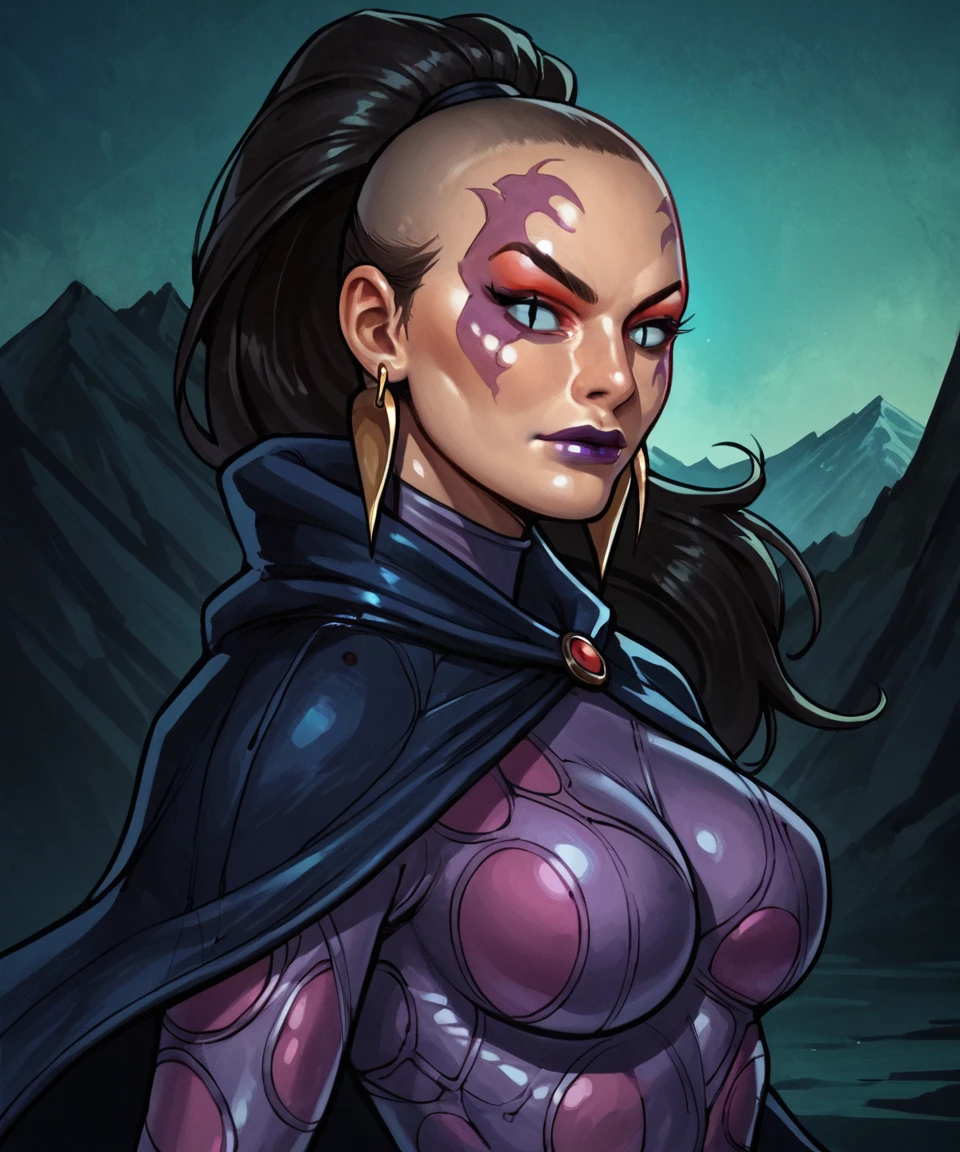 Example1 : score_9, score_8_up, score_7_up,pythona1++, slit pupils, blackcape, 1girl, solo, breasts, cape, earrings, purple bodysuit++, jewelry, large breasts, lipstick, makeup, black hair, facepaint, genie ponytail++, posing in mountain +, light colors ,retro , anime style+