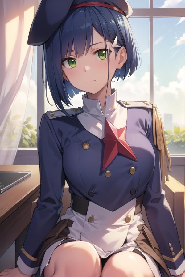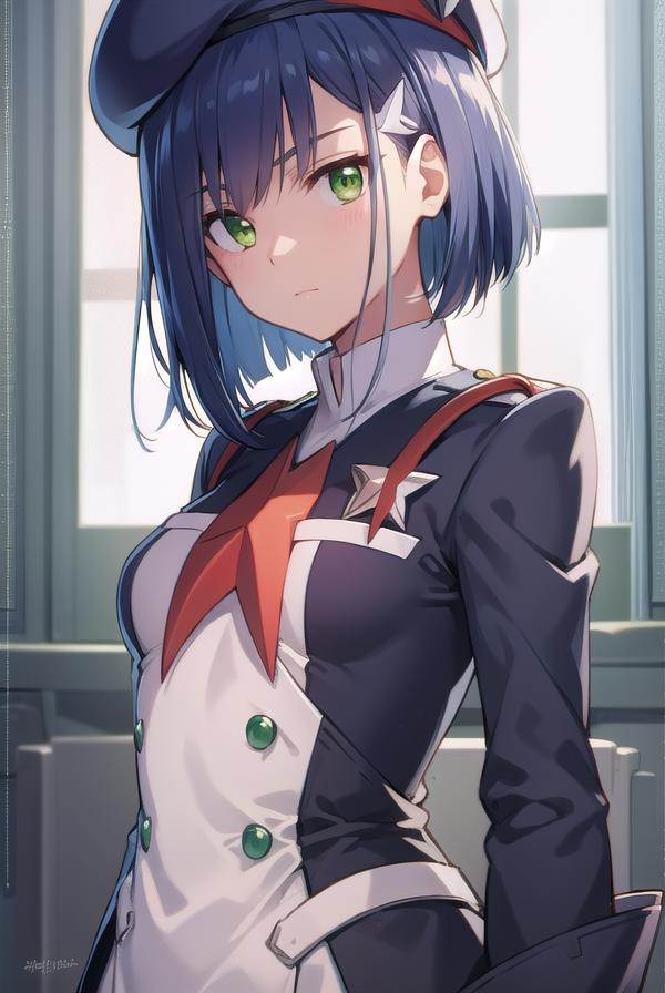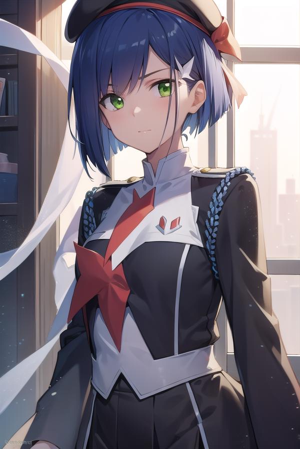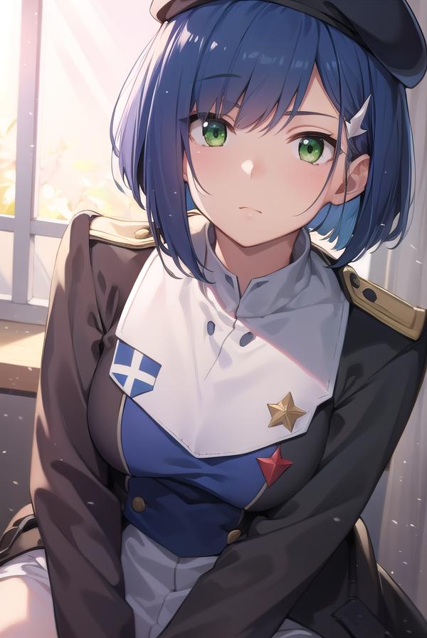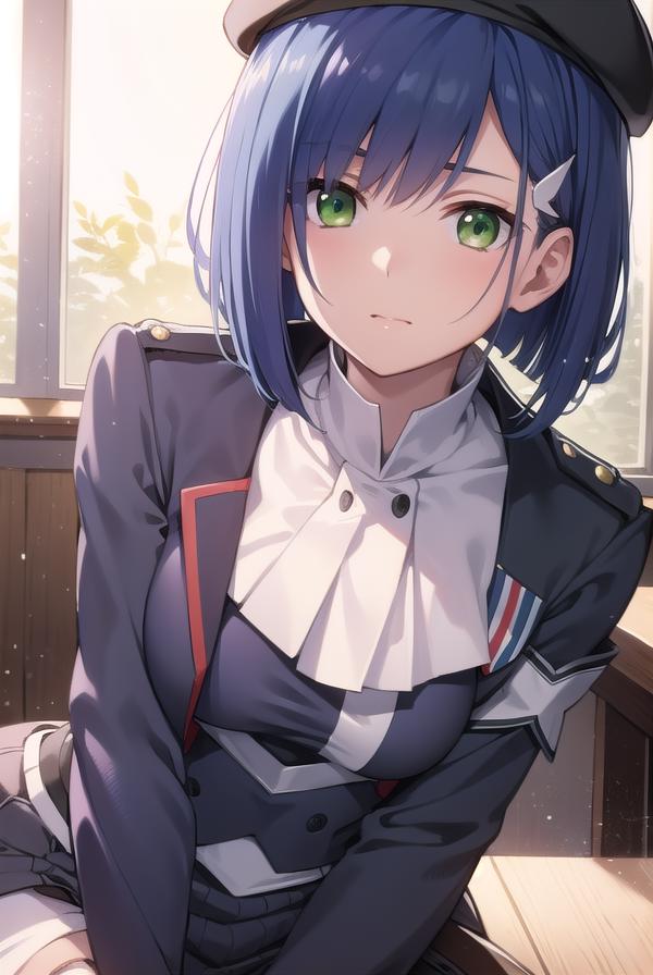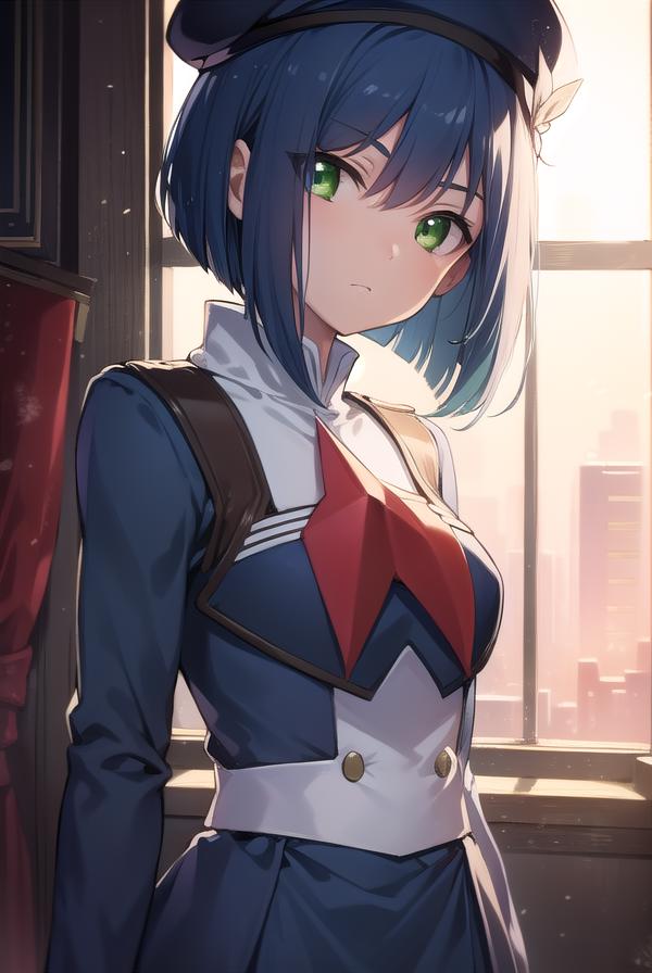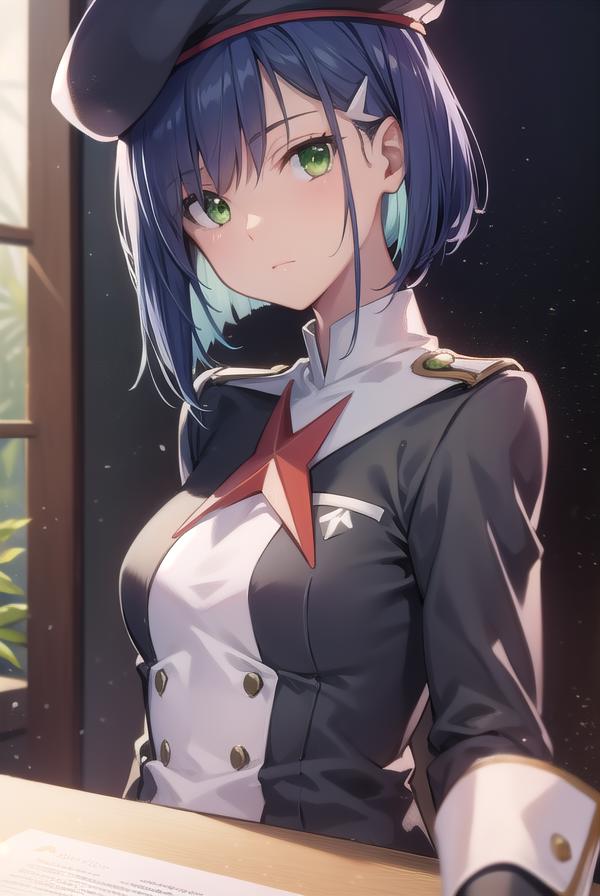 ichigo, blue hair, (green eyes:1.5), hair ornament, hairclip, short hair,