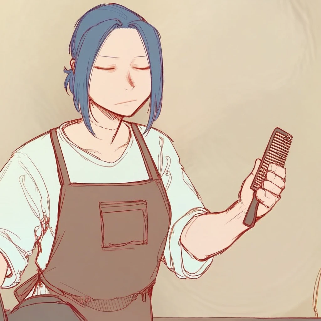 1girl, blue eyes, big eyes, blue hair, short hair, long bangs, sidelocks, single hair bun, forehead, sketch, meme, sleeves rolled up, Apron, white shirt, black jeans