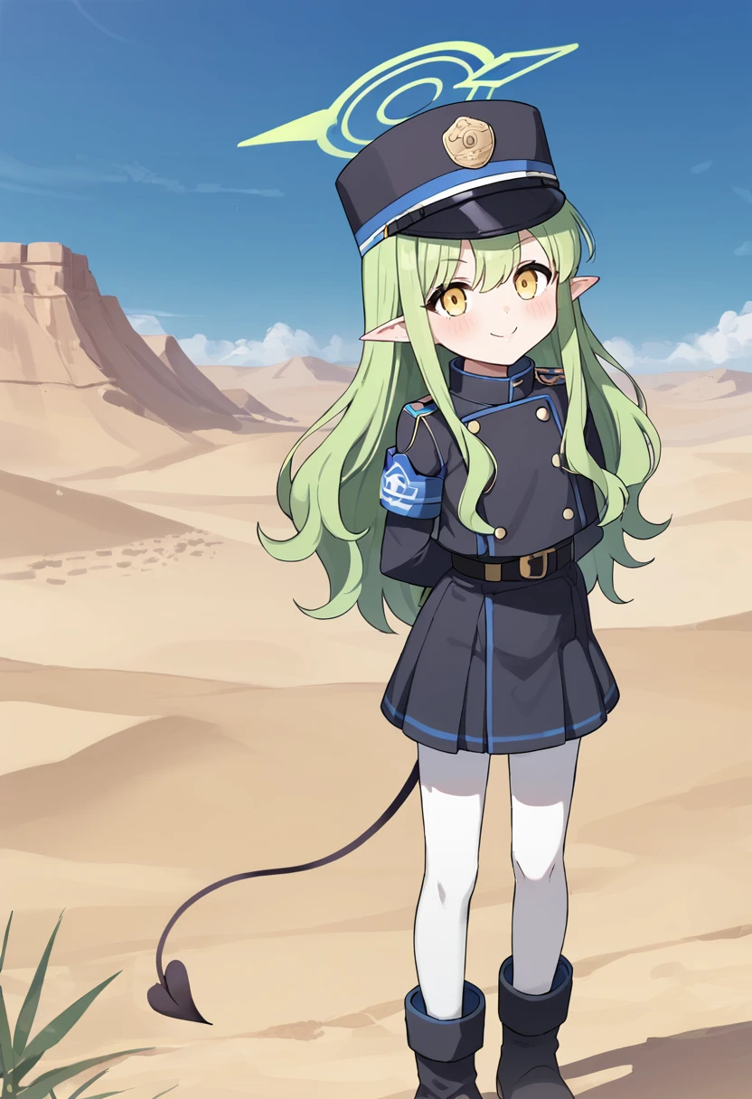 yellow eyes, green hair, long hair, pointy ears,halo,demon tail, jacket,skirt,arm band,white pantyhose, white gloves,peaked cap,boots