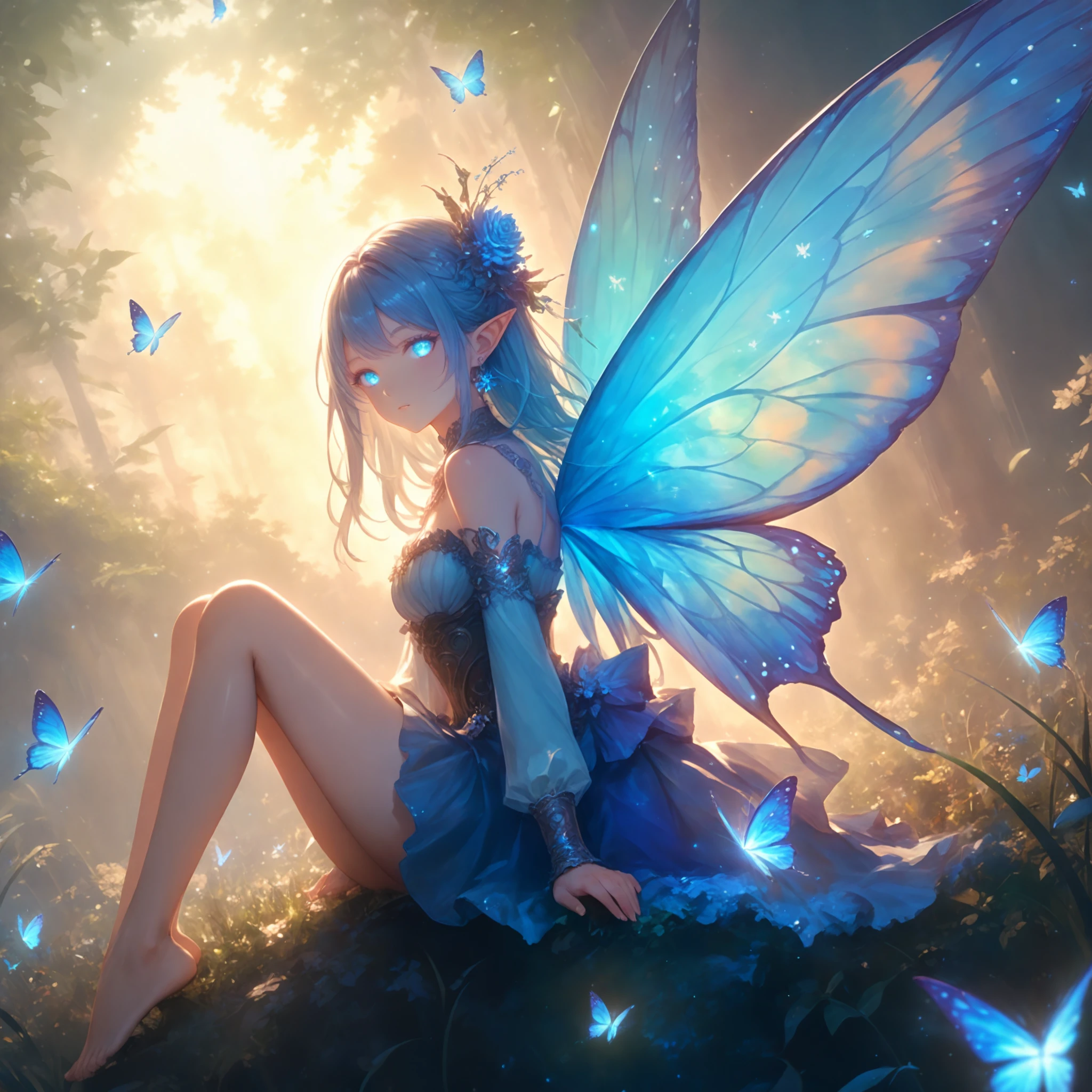Prompt: 1girl, solo, nijistyle, long hair, black hair, royal blue gradient hair, detailed eyes, seductive smile, floating hair, looking at viewer, sitting, leaning forward, portrait, face focus, medium breasts, white dress, white wings, angel wings, feathered wings, bridal gauntlets, bare shoulders, sleeveless dress, halo, feather hair ornaments, blue glowing theme, dark, beautiful starry sky, milky way, glowing background, transparent image, glowing particles, masterpiece, best quality, amazing quality, very aesthetic, highres, ultra detailed,