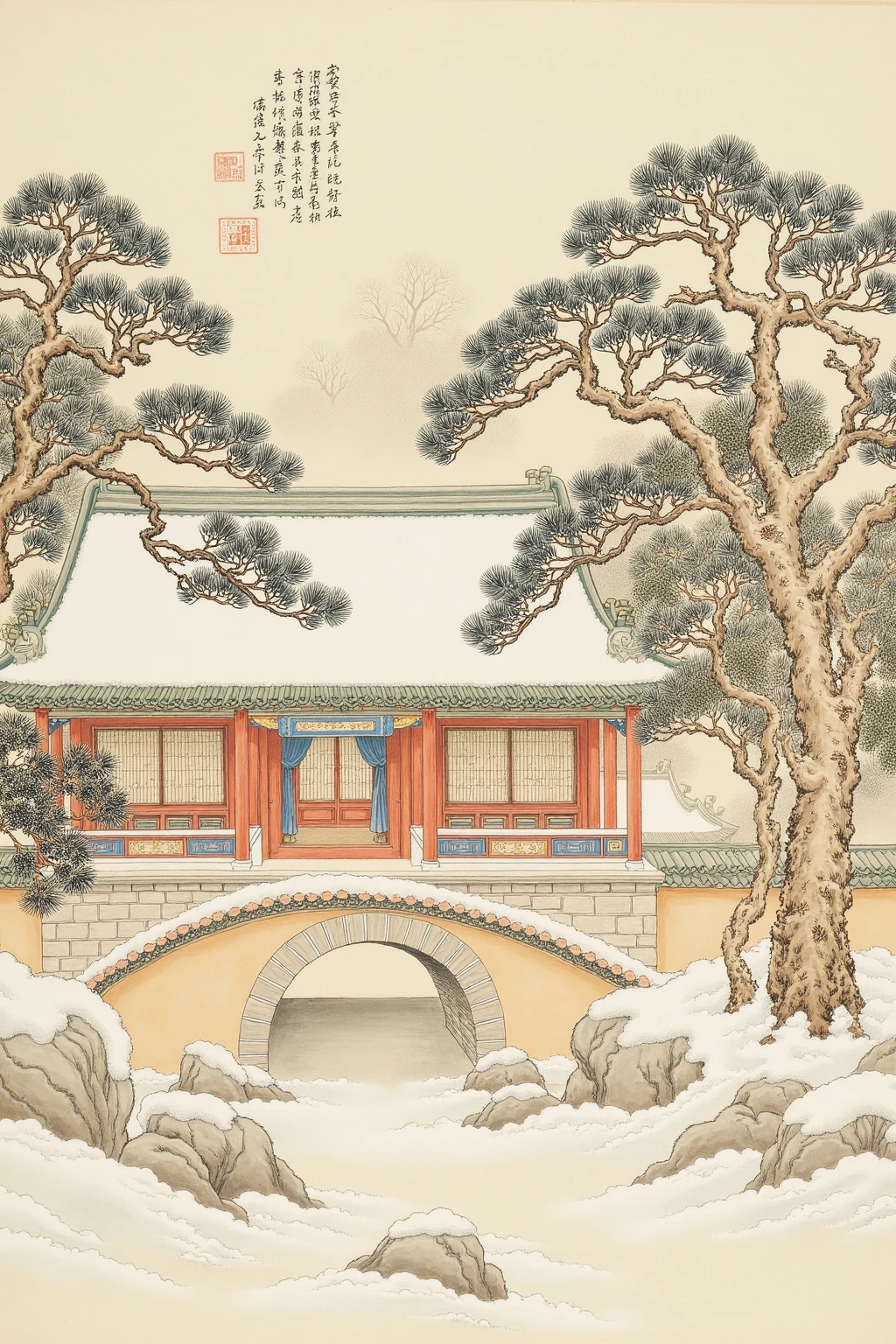 Traditional Chinese landscape painting style, create a snow - covered courtyard with ancient pines, a stone bridge, and a quiet study, in soft, muted colors.