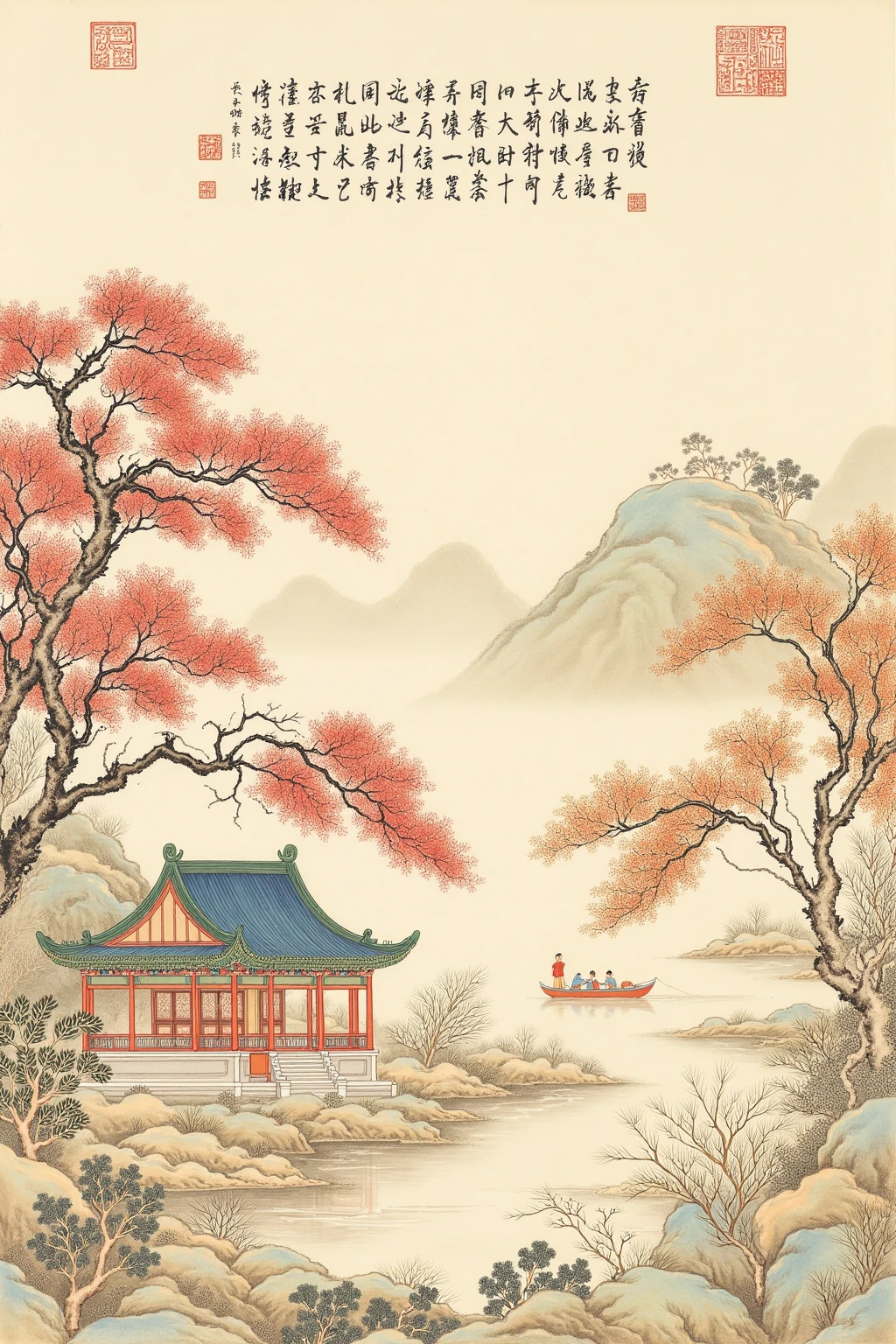 Traditional Chinese landscape painting style, show a riverside pavilion in autumn, red maples, a flowing river, and a lone boat, using delicate brushwork.