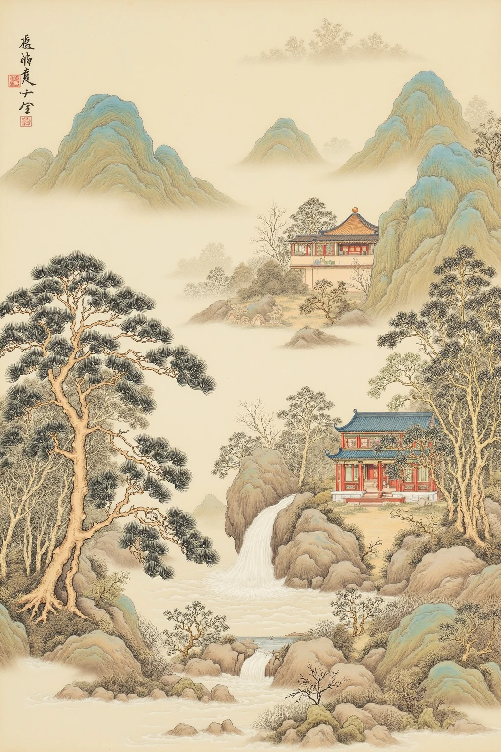 Traditional Chinese landscape painting style, draw a misty valley with a waterfall, ancient cypresses, and a Taoist temple hidden, mysterious and profound.