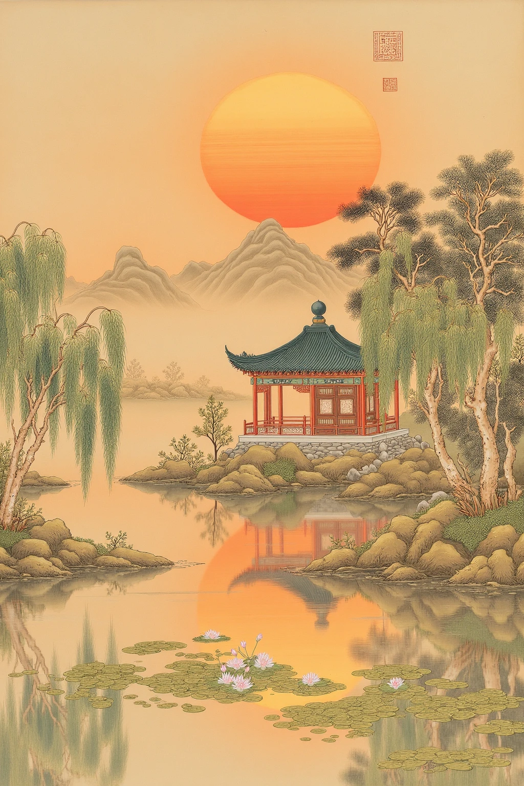 Traditional Chinese landscape painting style, paint a sunset - lit pagoda by the lake, with willows, floating lotus, and a reflection on the water, warm hues.