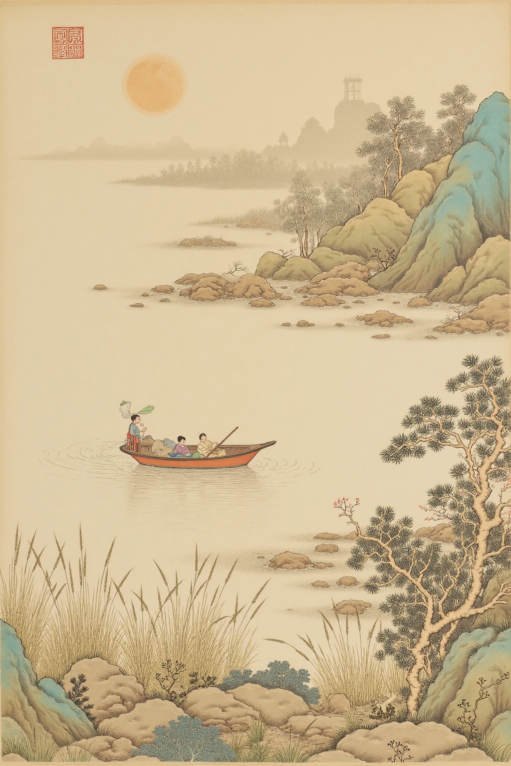 Traditional Chinese landscape painting style, represent a moonlit river scene, a fishing boat, reeds, and a distant pagoda silhouette, dreamy and peaceful.