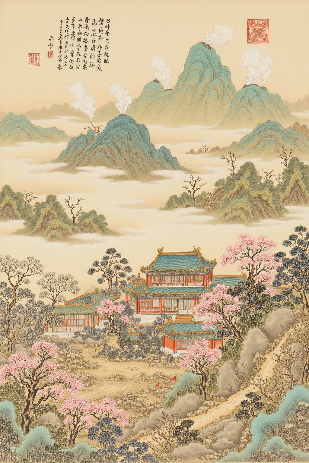 Traditional Chinese landscape painting style, design a mountain village in spring, blooming flowers, terraced fields, and smoke rising from cottages, vibrant yet tranquil.