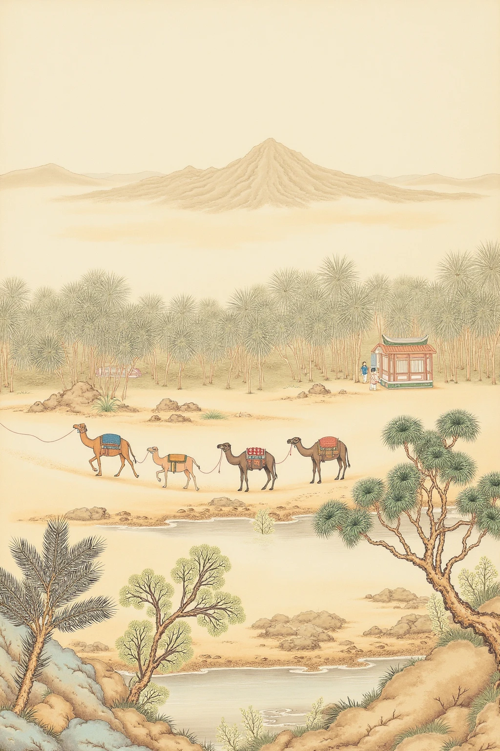 Traditional Chinese landscape painting style, portray a desert oasis, date palms, a clear spring, and a camel team, using earthy and fresh colors.