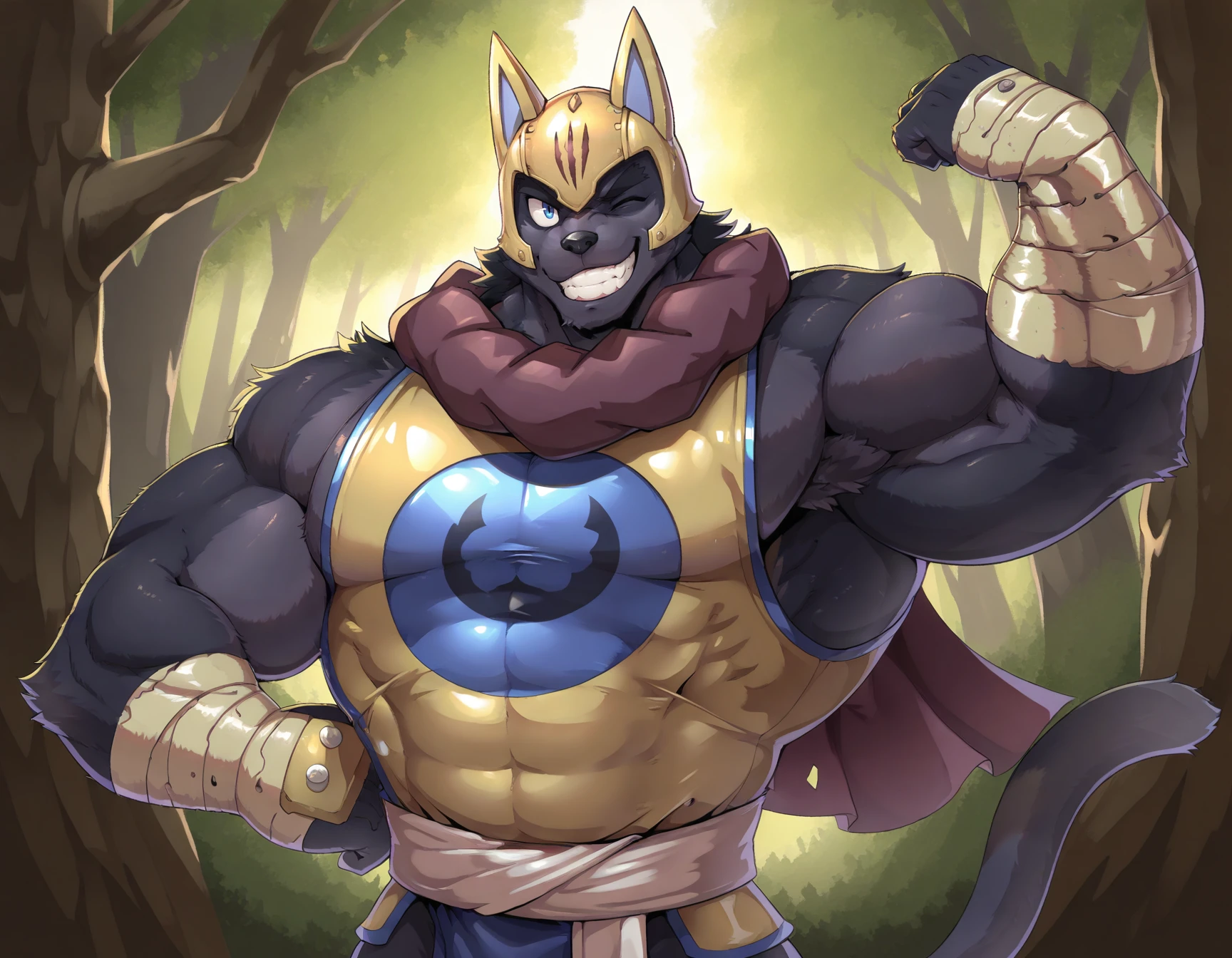 headgear, helmet, cape, yellow topwear, white sash, blue pants, boots, wrist wraps